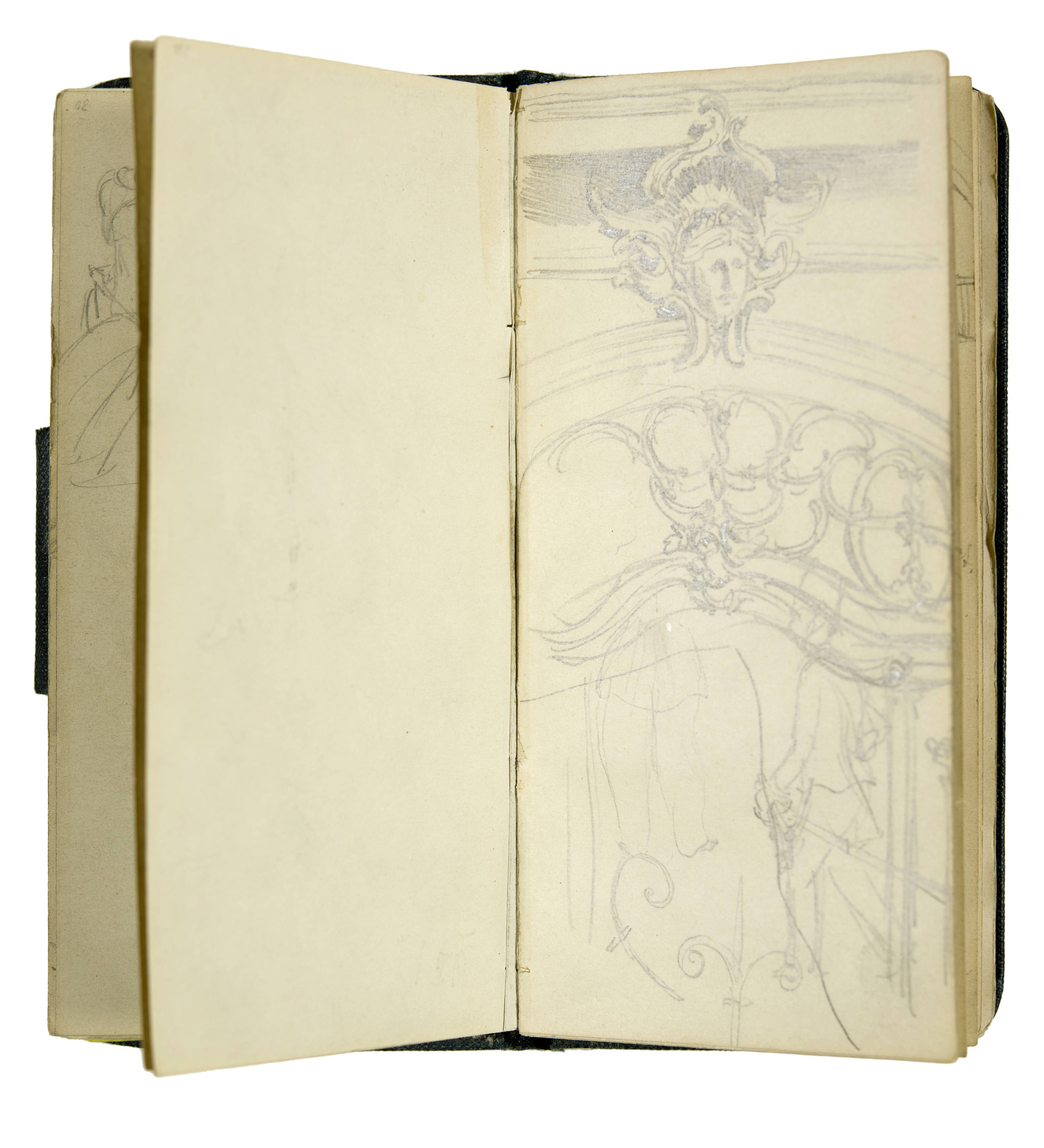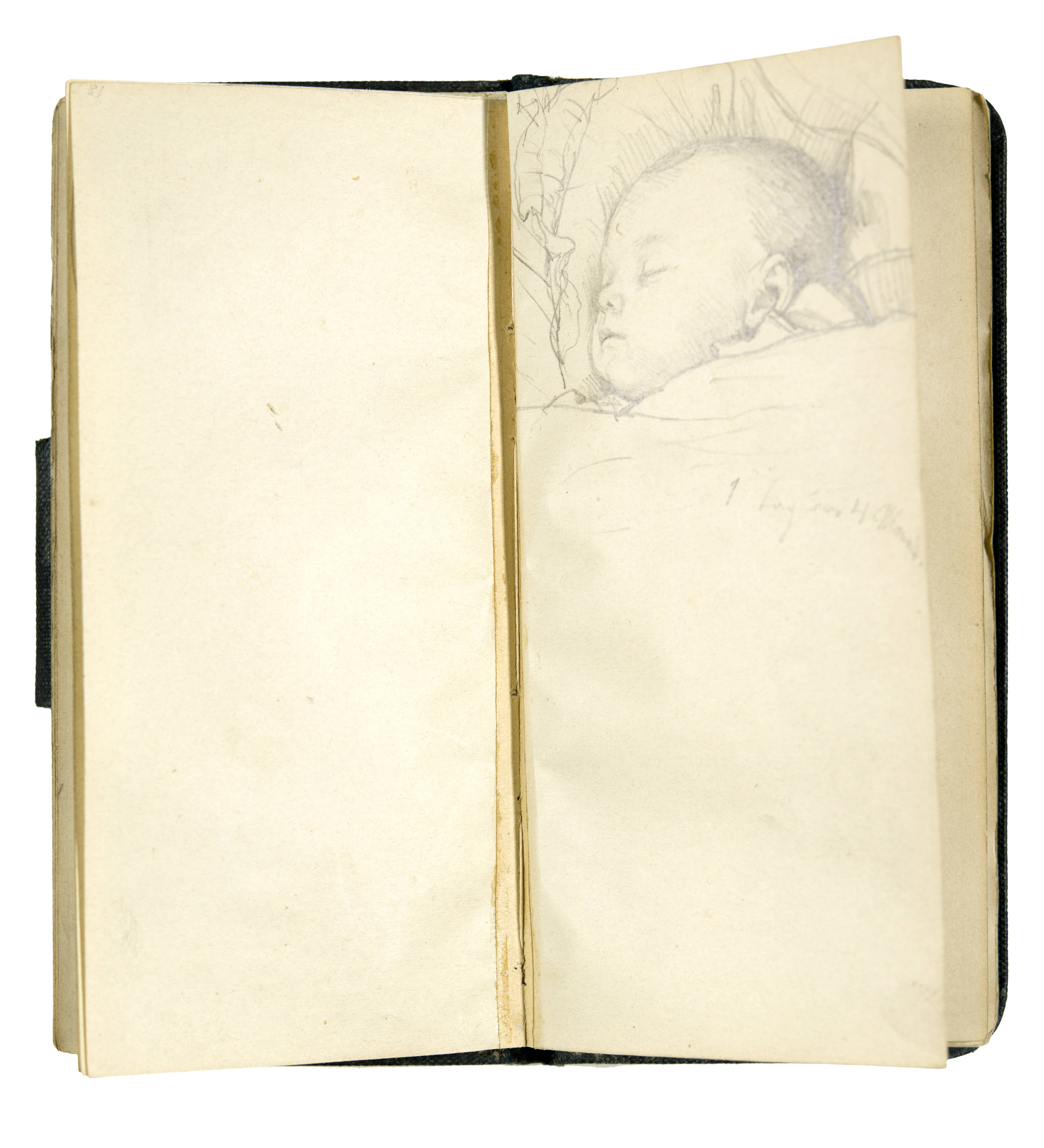 Ein Skizzenbuch des Künstlers aus den Jahren 1859 bis 1861 mit insgesamt 43 Zeichnungen mit diversen Motiven: Kleinkind, Landschaften, Architektur, höfisches Leben, Krokodil. - Das Skizzenbuch ging nach Menzels Tod nicht wie die anderen Skizzenbücher an die Nationalgalerie Berlin, sondern zu Menzels Schwester Emilie Krigar-Menzel, bei welcher der Künstler 1860-1865 wohnte. Menzel hatte selber keine Nachkommen, daher könnte es sich bei den schönen Kinderstudien um Porträts seiner Nichte Margarethe (1860-1945) oder seines Neffen Otto Krigar-Menzel (1861-1929) handeln