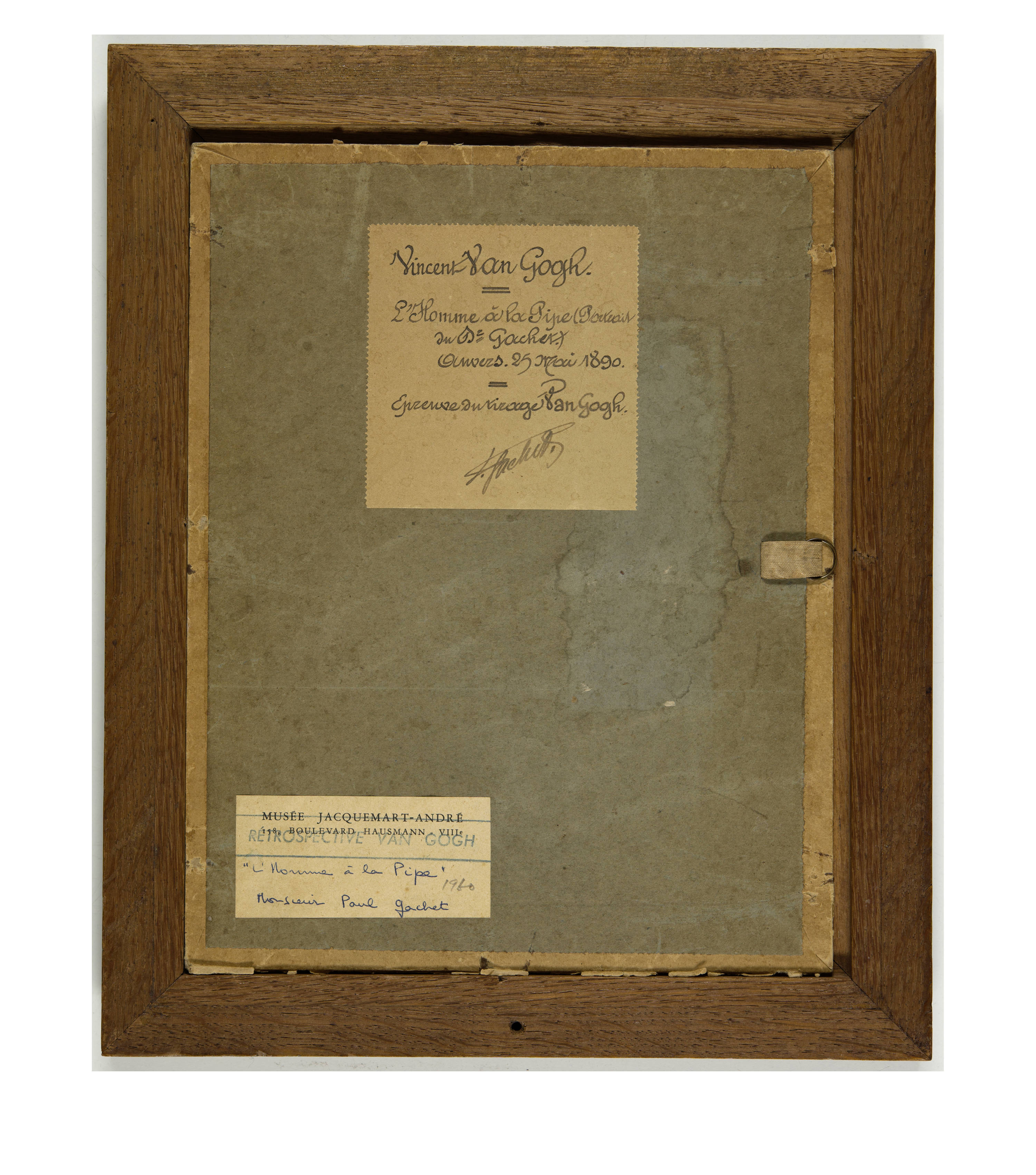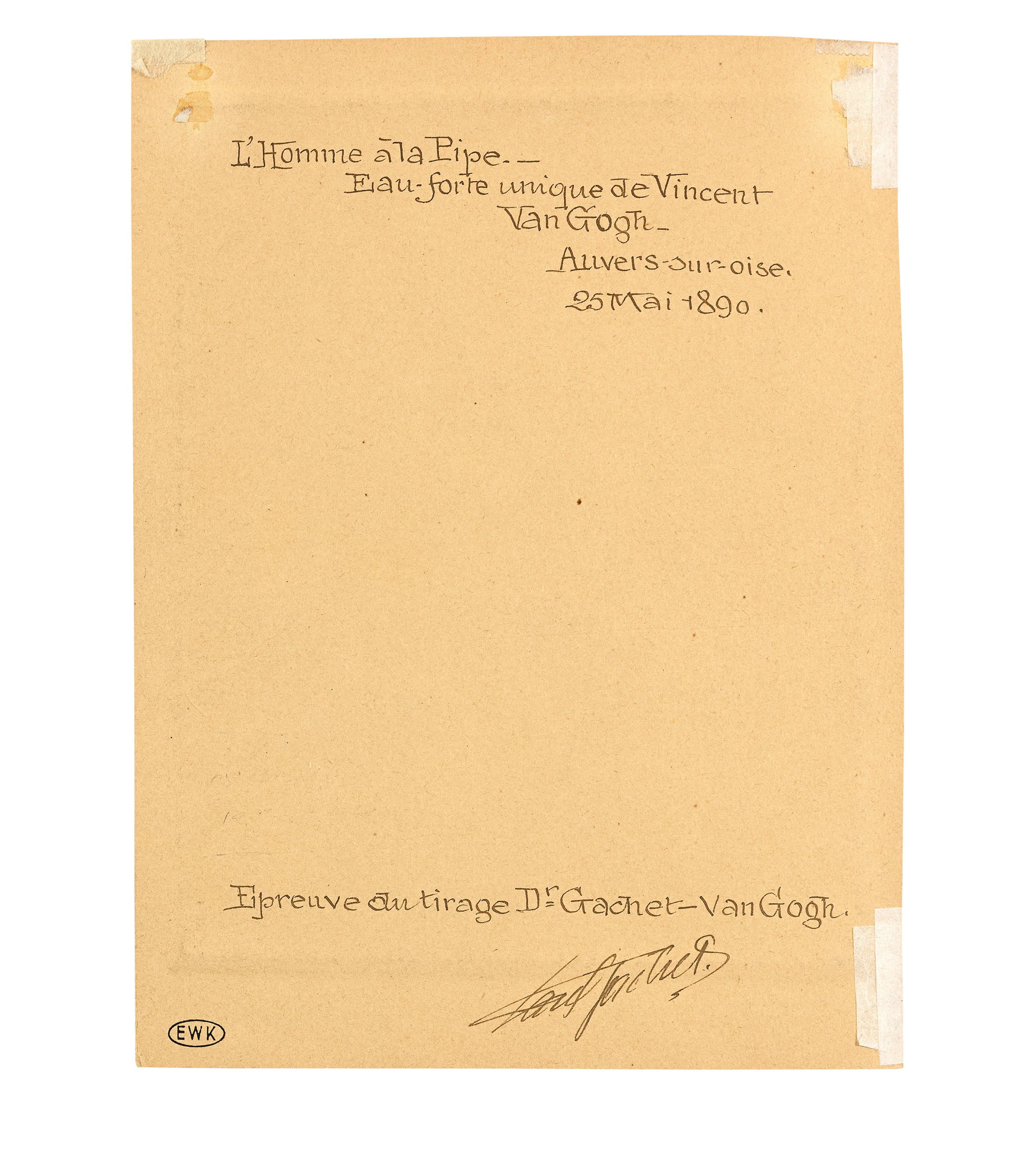 Rückseitig oben beschriftet "L'Homme à la Pipe - / Eau forte unique de Vincent / Van Gogh - / Auvers-sur-Oise / 25 mai 1890", unten "Epreuve du tirage Dr Gachet-Van Gogh" und von Gachet signiert