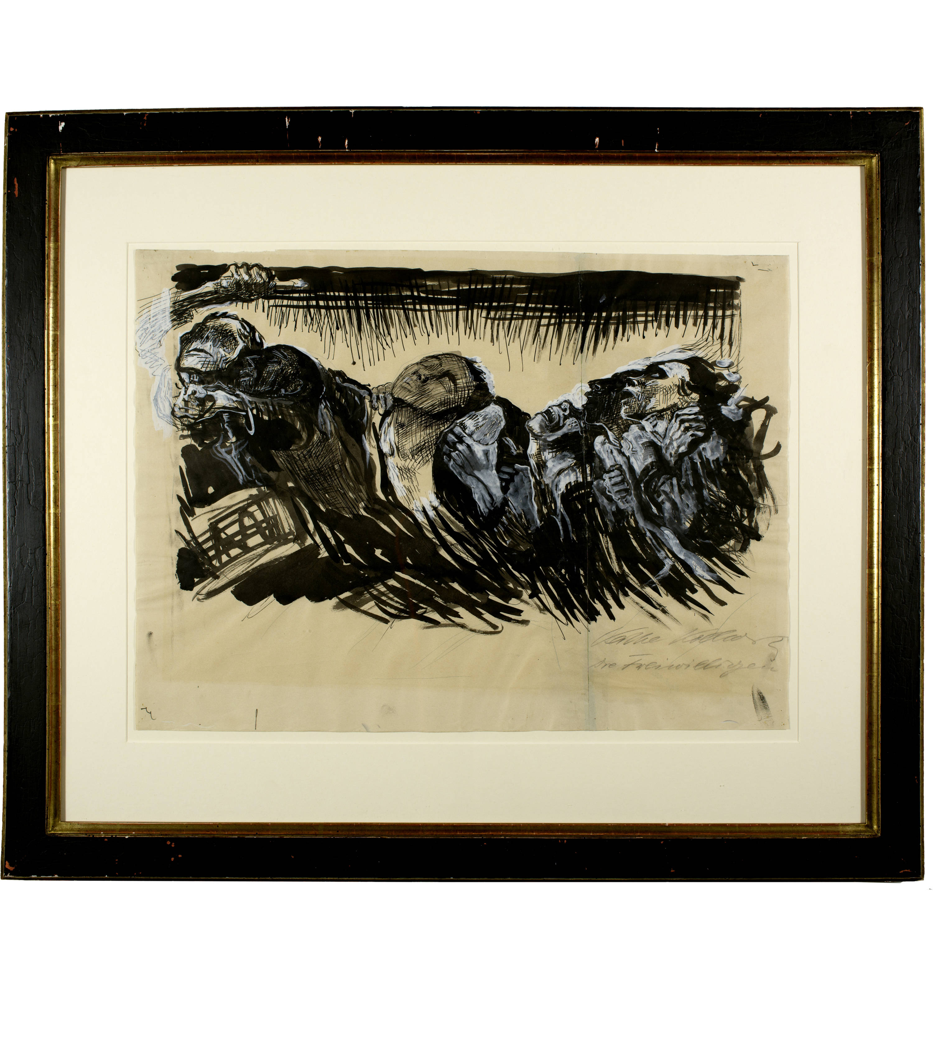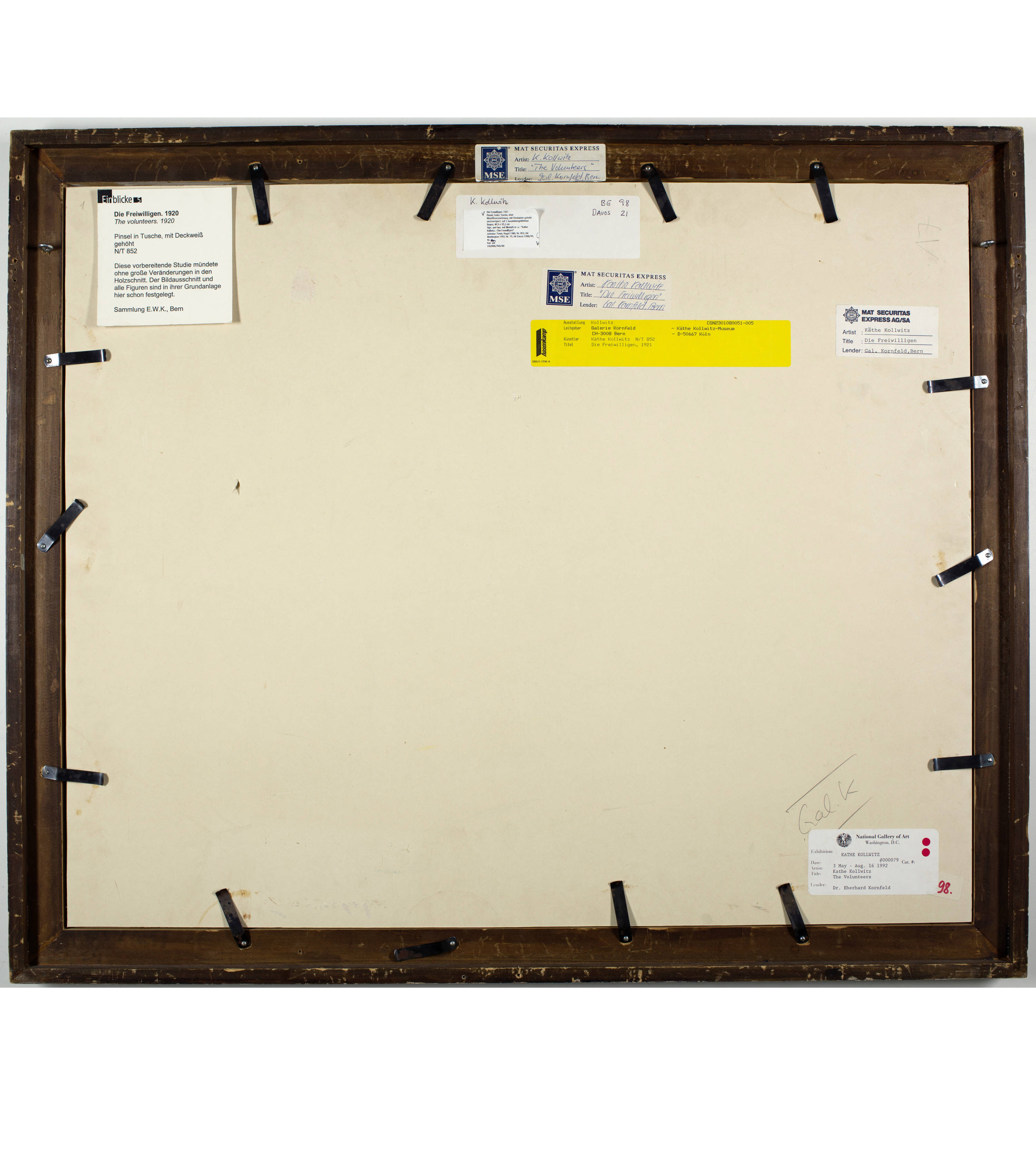 Für das zweite Blatt der Reihe, "Die Freiwilligen" (Knesebeck 173), sind vier Vorarbeiten bekannt, darunter die hier angebotene, die dem Holzschnitt der Auflage am ähnlichsten ist. Die Künstlerin erprobt die Hell-Dunkel-Wirkung mittels Tusche und Weisshöhungen. Eindrücklich tastet sie sich an das optimale Verhältnis der hellen und dunklen Flächen heran, die danach in die Holzplatte geschnitten werden. Sie hat rechts noch ein Stück Papier angesetzt, wohl um die Darstellung zu erweitern. Motivisch orientiert sie sich an der Tradition mittelalterlicher Totentänze, in denen der Tod immer wieder als Heerführer einen Menschenzug anführt. Der Tod schreitet trommelschlagend voraus, gefolgt von fünf jungen Männern. Die Heerschar ist ganz unterschiedlich charakterisiert. Der eine geht in leidenschaftlicher Begeisterung mit, ein anderer folgt blind ergeben, wiederum ein anderer scheint verzweifelt mitgezerrt; und doch werden am Ende alle vom Tod ins Verderben mitgerissen. Über der Darstellung wölbt sich eine Art Bogen oder Heiligenschein, der die Szene in eine fast sakrale Atmosphäre taucht. Die jungen Soldaten waren fest davon überzeugt, sich fürs Vaterland opfern zu müssen.