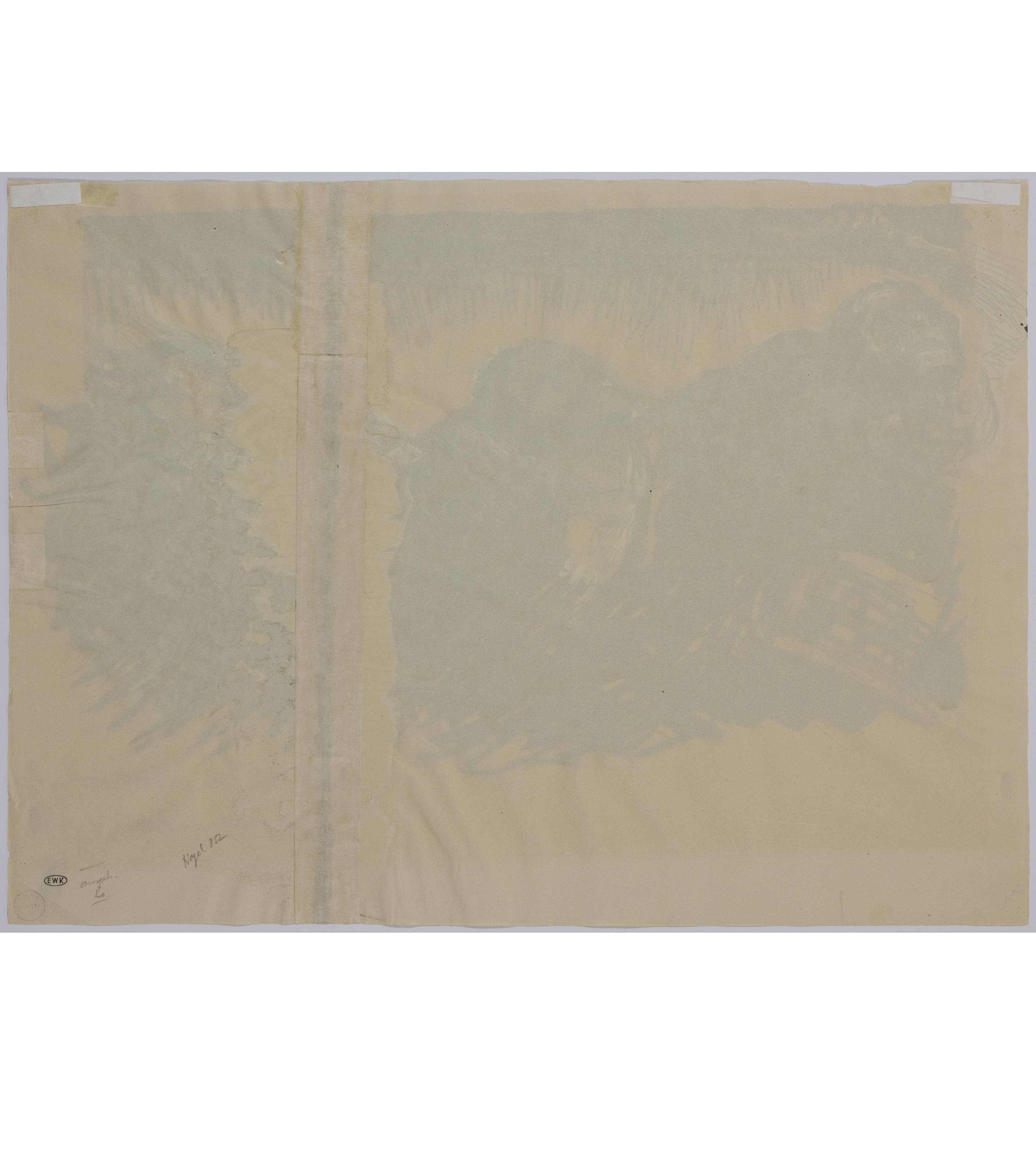 Auf gebräuntem Papier und etwas gewellt, vor allem im linken Rand und unten rechts, sowie Spuren eines früheren Passepartouts. Einzelne Fingerspuren. In den Rändern Reissnagellöcher und im linken oberen Rand minimaler Papierverlust. Rückseitig Spuren einer alten Montierung