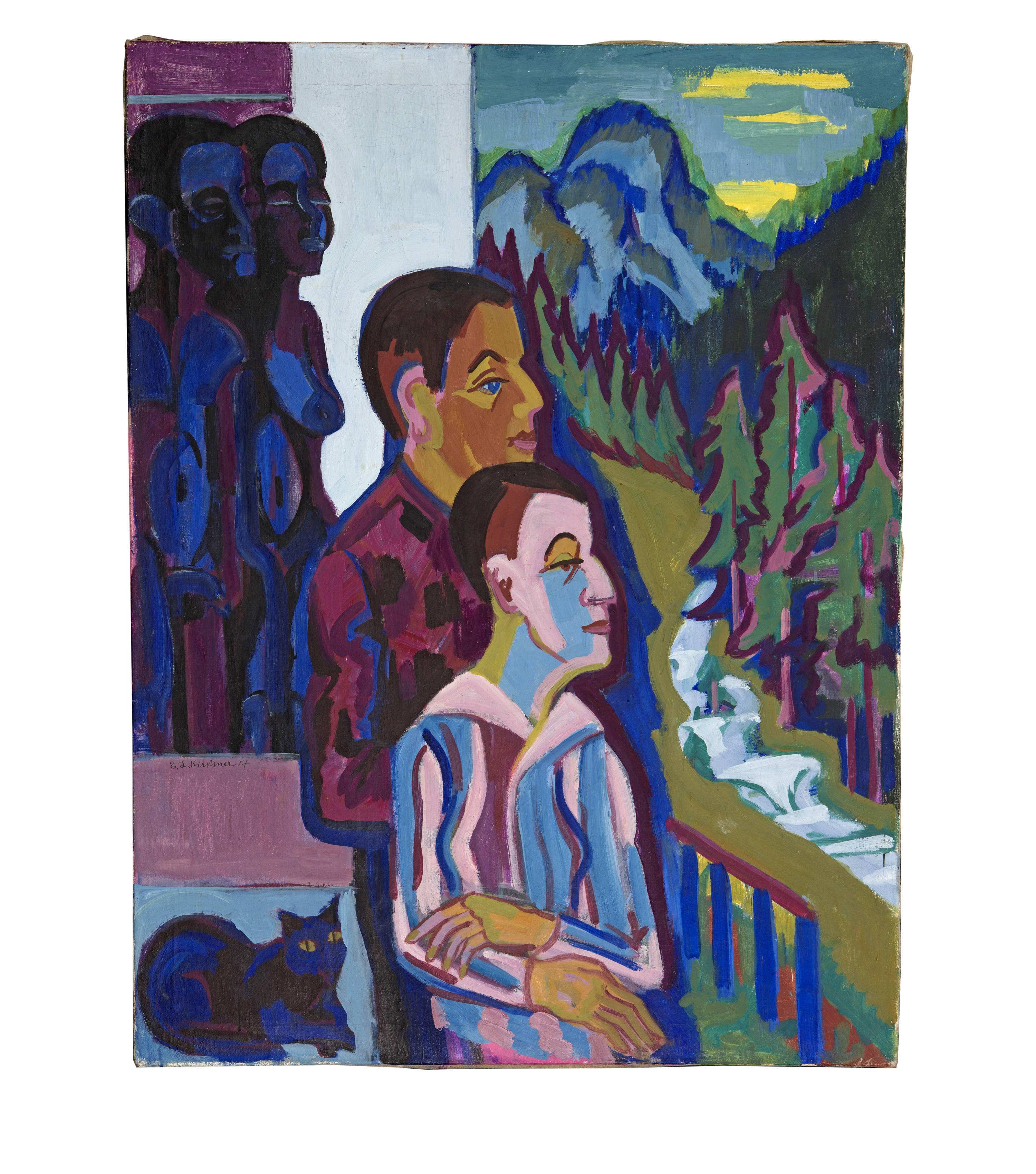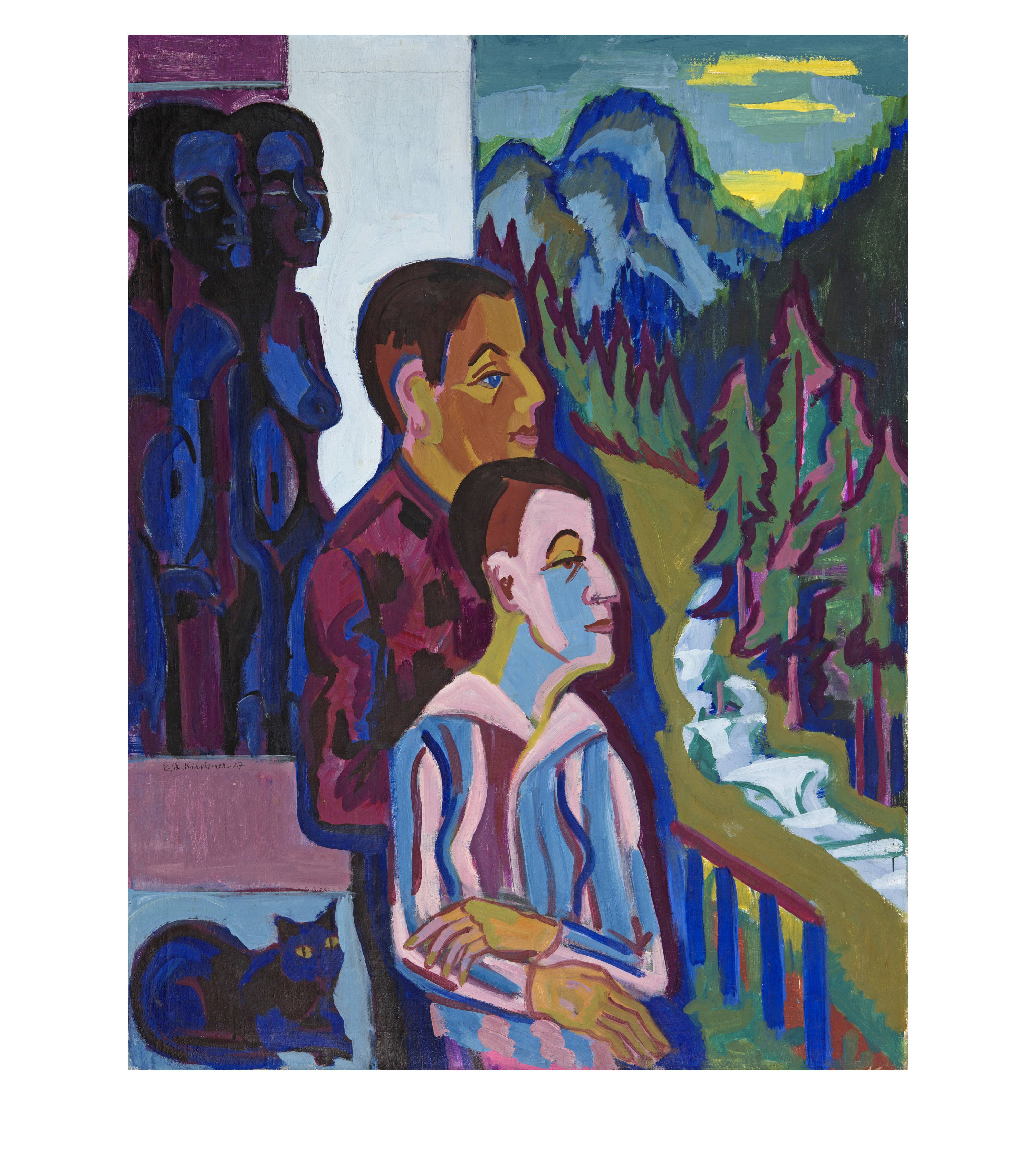 The painting shows Kirchner together with Erna and their cat Bobby in front of the Wildbodenhaus. To the right of the picture, the view opens out into the Sertig Valley with the first rays of sunlight in the sky; to the left, we recognise the two wooden figures "Adam" and "Eva" (Henze 1921/01ab), which probably never stood in front of the house. Kirchner painted a slightly larger first version of the work (Gordon 783) in 1924-26, in which his hair is longer and Erna stands with her back to the viewer. In June 1927, he worked on the present second version "Vor Sonnenaufgang" and wrote to the collector Carl Hagemann (1867-1940) in a letter dated 9 June 1927: "Ich will übrigens "vor Sonnenaufgang" nochmal malen. Es ist ein Vorwurf, der mich stark beschäftigt hat. Das Geheimnisvolle der Natur vor dem Sonnenaufgang und das Problem der 2 Menschen in der Natur. Es soll ein Bild 120 × 90 cm werden. […] Solche einfache Lebensdinge sind noch gar nicht gemacht worden und doch sind sie so gross und zeitlos und sollten jedem etwas geben können." (Delfs 1858). Kirchner's statement in the letter to Hagemann shows how deeply Kirchner was preoccupied with the subject and how important it was to him. In this second version, Kirchner and Erna as well as the two wooden figures and Bobby the cat gaze thoughtfully and purposefully into the Davos landscape, awaiting the rising sun.