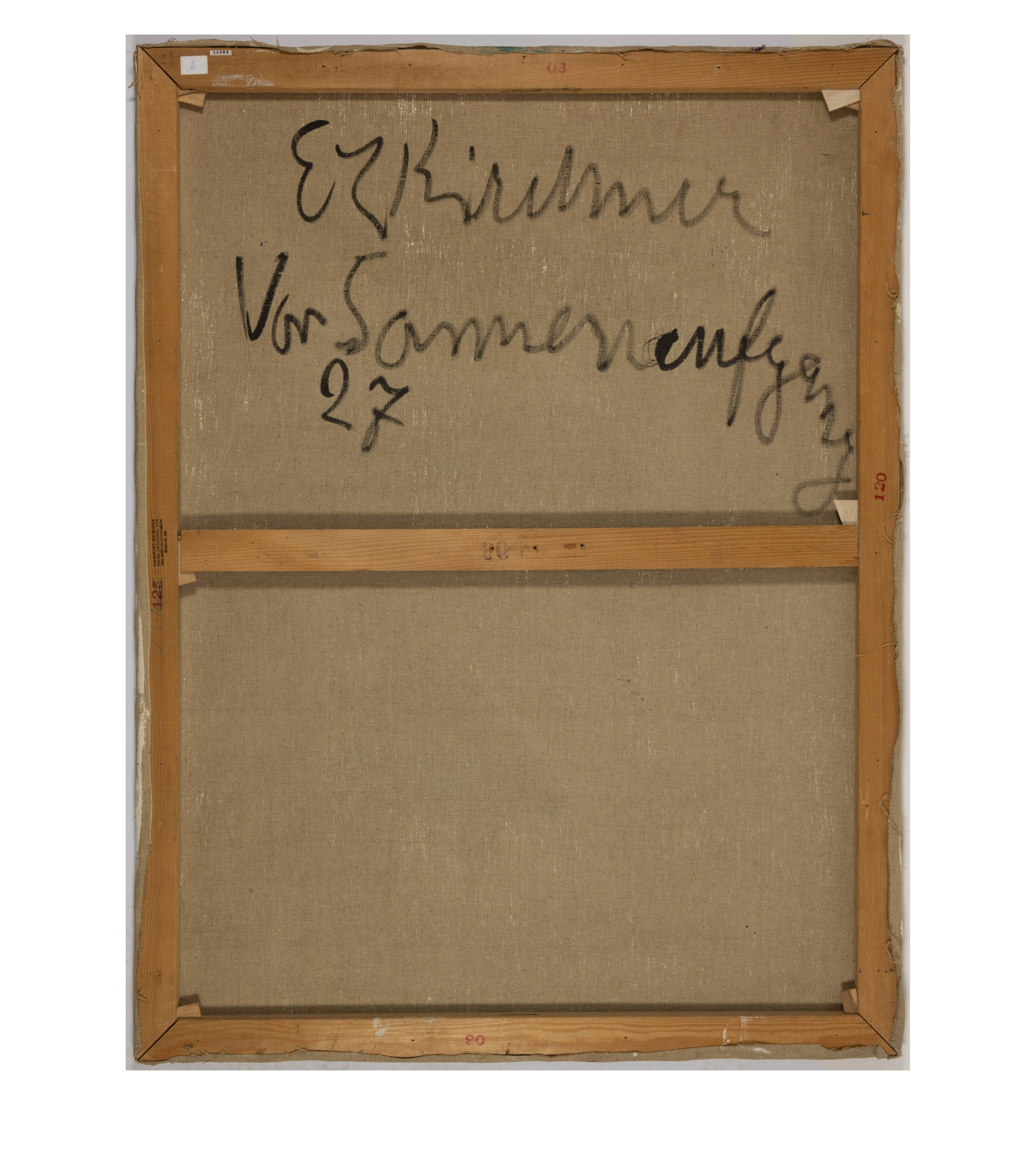 As he wrote to his wife Elfriede (d. 1937) in a letter dated 22 January 1929, the architect Hansgeorg Knoblauch (1899-1982) acquired the painting during his first stay in Davos from 18 to 23 January 1929: "Heute will ich dann mein Bild mitnehmen, es ist sehr gross (120 × 90 cm)." Two days later, Kirchner enquired of Knoblauch in a letter: "Ist das Bild gut angekommen? […]" (Delfs 2084). Knoblauch later commented on his selection of the painting: "Als ich mir das Bild aussuchen sollte, liess er [Kirchner] mich in der Kammer allein, und als ich ihm meine Wahl zeigte, war er ganz erstaunt, weil er meinte, ich hätte mir eher ein nacktes Mädchen ausgesucht. Ich sagte, für mich habe dieses Bild in seinem Aufbau eine starke architektonische Wirkung, deshalb hätte ich es gewählt, und nicht, um eine Fotographie von ihm zu haben." (from: Gertrud Knoblauch, p. 39 note to letter of 22 January 1929). The Knoblauch-Dümmlers came into contact with Kirchner during Elfriede's stay at a health resort in Davos, where she reached out to Kirchner for the first time in February 1927. Hansgeorg met the artist two years later, in January 1929. Kirchner was kindly disposed towards the young couple, and the friendship lasted for over ten years, as can be gleaned from the correspondence until Elfriede's death in 1937.