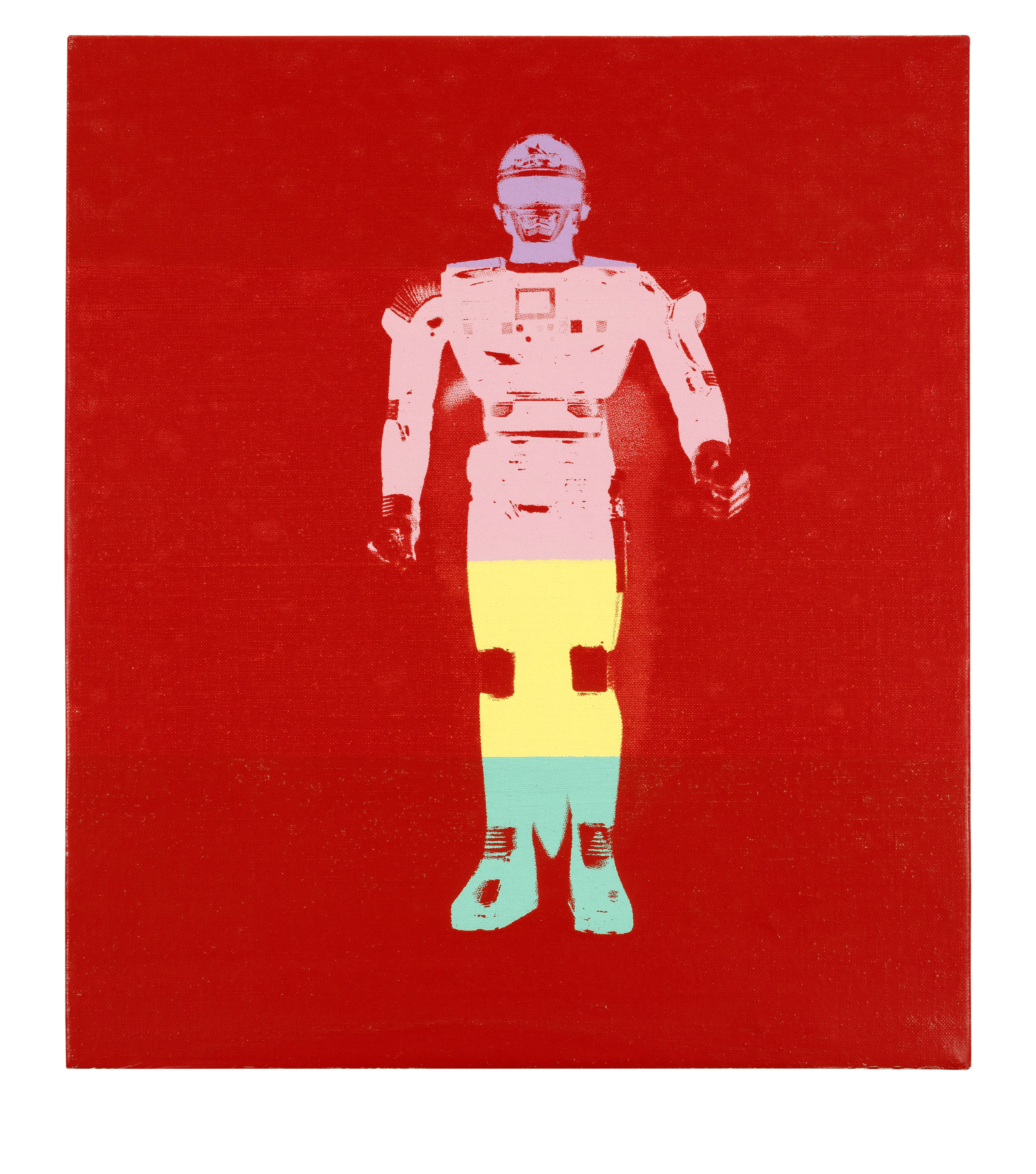 In 1983, he was commissioned by Fujio Watanuki to create the portfolio "Kiku", a homage to the chrysanthemum. The associated exploration of Japan, which he had visited twice (1956 and 1974), led to a series of works during this period, all of which have a direct connection to Japanese culture. Warhol collected Japanese toys, for example, and probably also a figure of "Space Sheriff Sharivan", the then popular protagonist of the Japanese "Tokusatsu" television series of the same name, which was broadcast in 1983 and 1984. In this series of paintings, he paid tribute to Japanese popular culture by translating a small toy figure into his typical silkscreen painting style, thus forging a link to Pop Art and its superheroes in the USA. Different colour versions were created, in this case a robot in pastel shades on a red background.