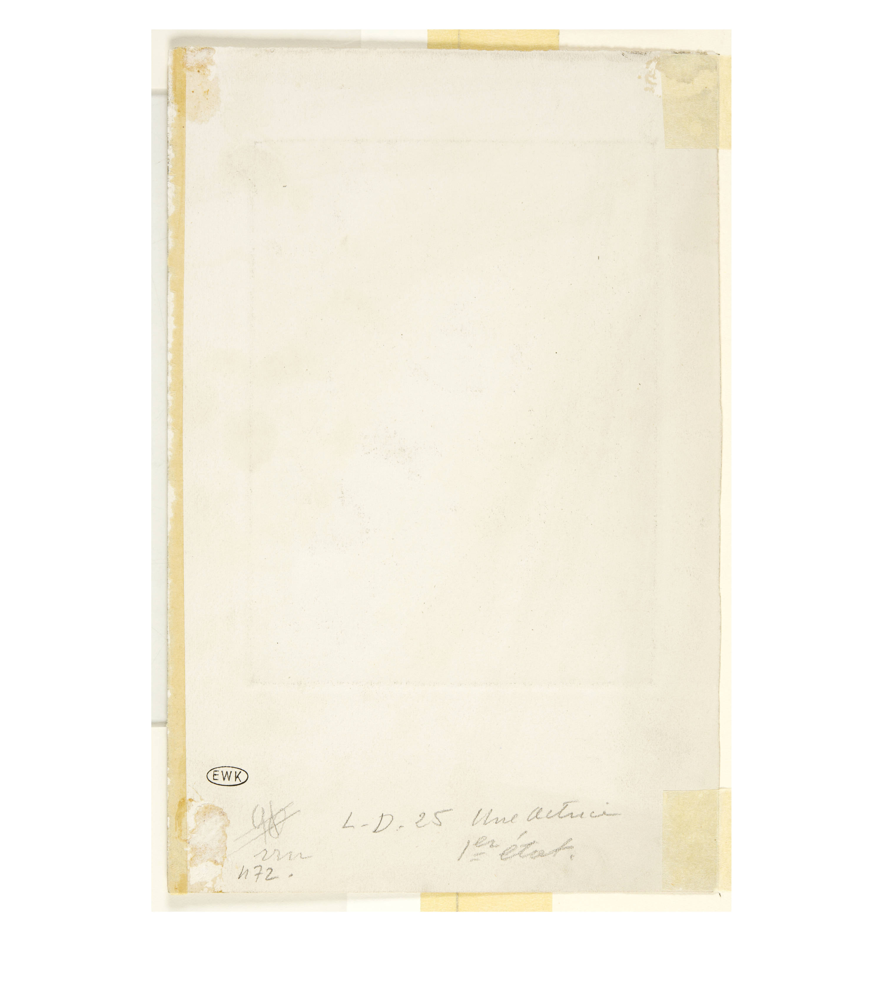 Probably the result of a visit to the "Aux Ambassadeurs". The well-known Parisian concert venue organised the "café-concerts" - open-air concerts held under the trees of the Champs-Elysées in Paris when the weather was fine. There is evidence that Degas often attended these performances. A very poetic realisation, the mysteriously illuminated singer literally shines out of the dark background. Only two copies of the first state are known: the present one and the one in the Albertina in Vienna.