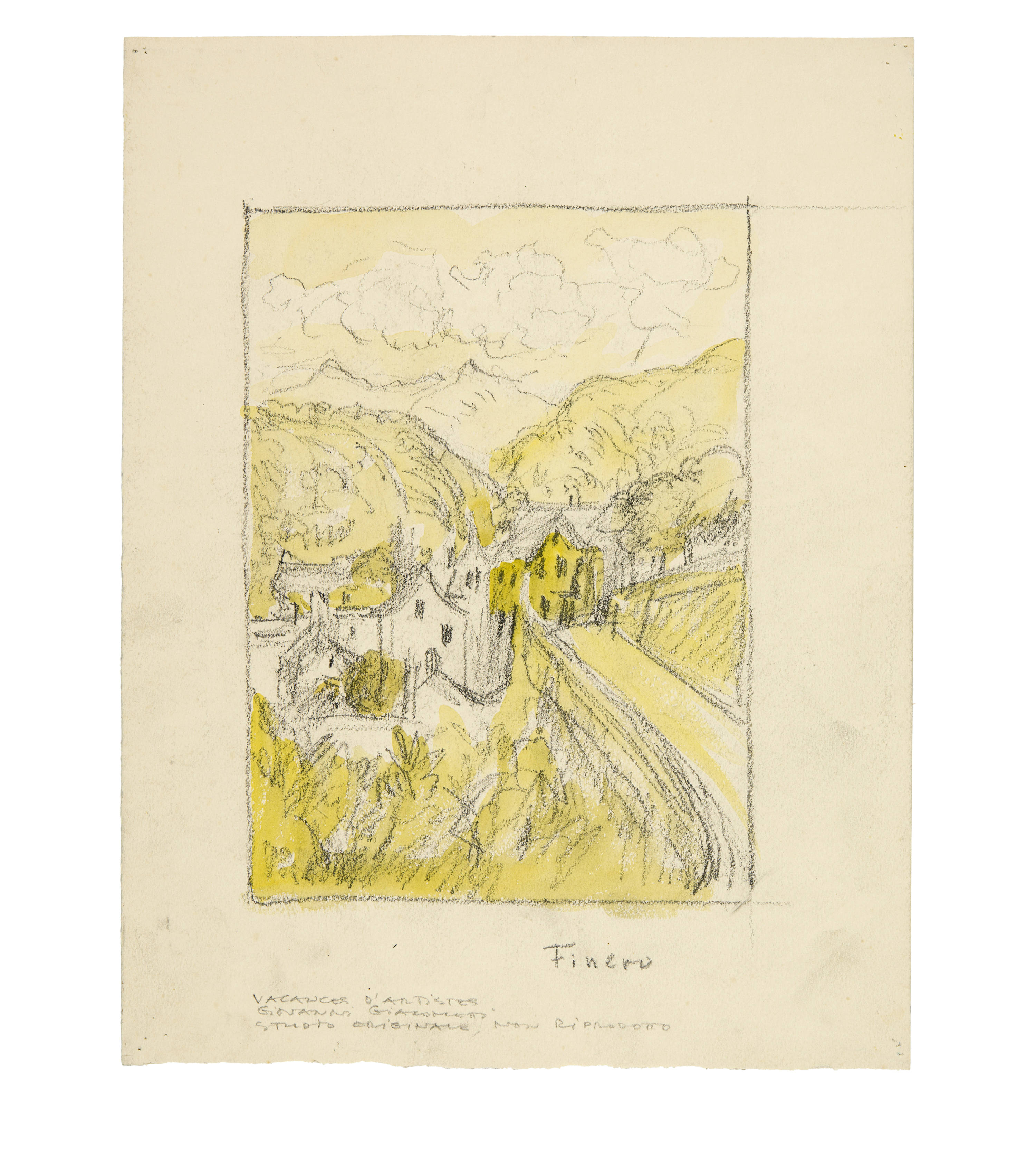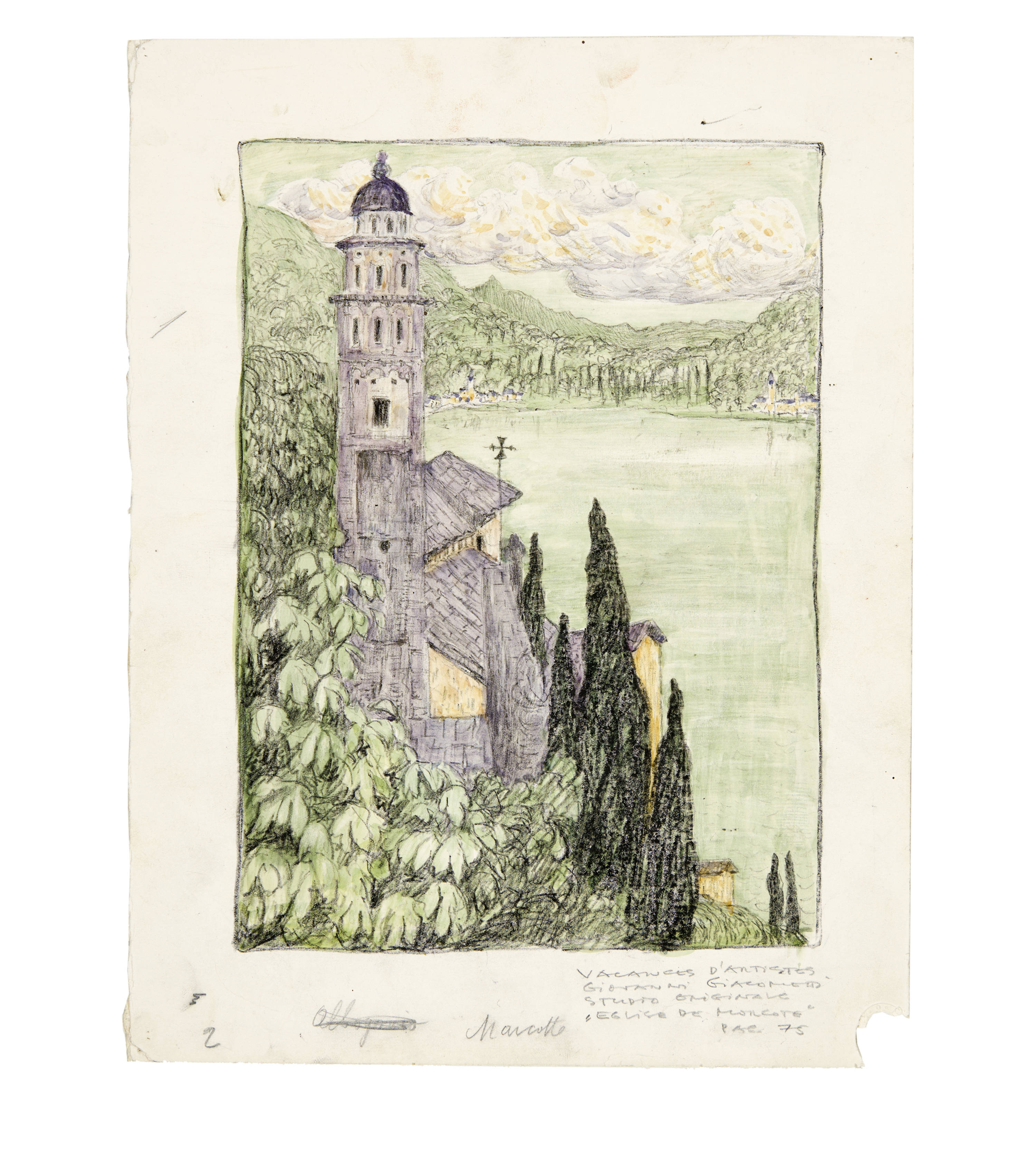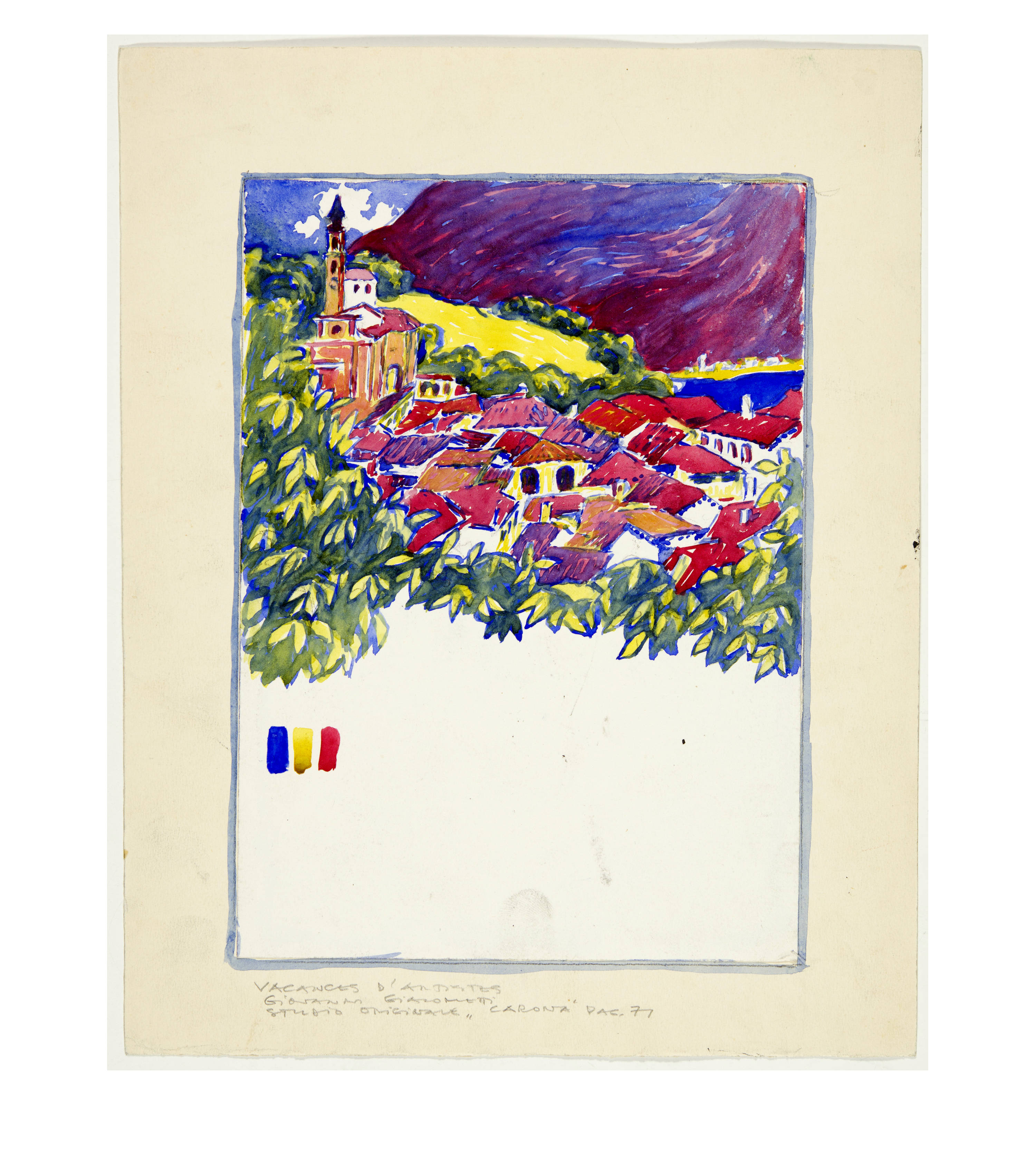 The works were created as part of the illustrations for Daniel Baud-Bovy's novel "Vacances d'Artistes". The book was published in Geneva in 1909. It contains 27 colour lithographs "hors-texte", 10 by Édouard Baud, 4 by Louis Dunki, 2 by Jules Fontanez, 10 by Giovanni Giacometti and 1 by Édouard Vallet. In August 1907, Giacometti provided the publisher Max Girardet, director of Sonor, with drawings in watercolour over pencil as models for these coloured lithographs. These preparatory works were then transferred onto stone by one of the publisher's lithographers. In addition to the 10 lithographs illustrated in the publication, Giacometti also designed other sheets that were not used in the book (6 of these are listed in Stauffer, of which only lithographs were produced). The sketches were created at the end of May/beginning of June 1907 and again towards the end of July/beginning of August, when the author of the book and Giacometti were travelling together by bicycle and on foot in Ticino and neighbouring Upper Italy.