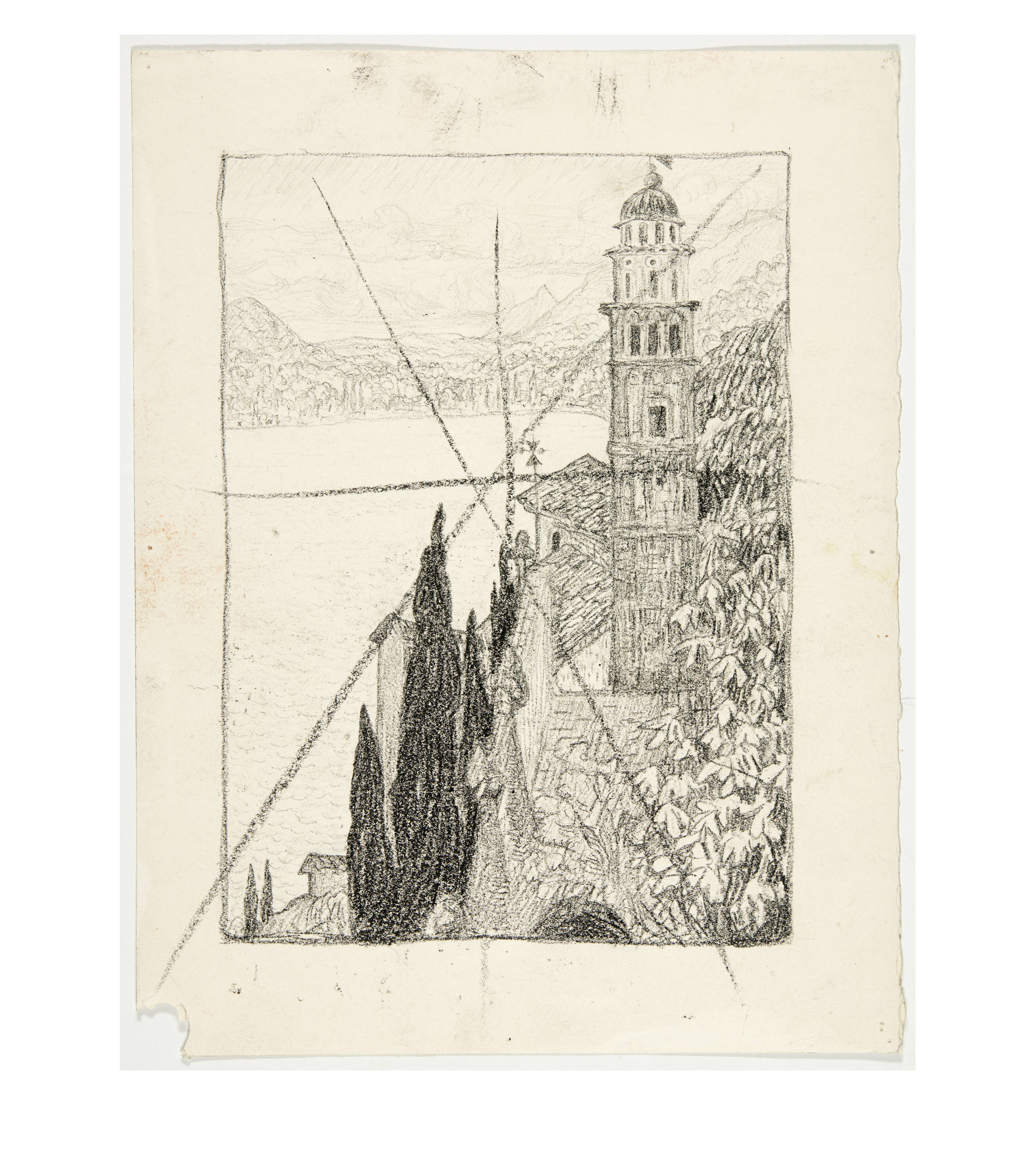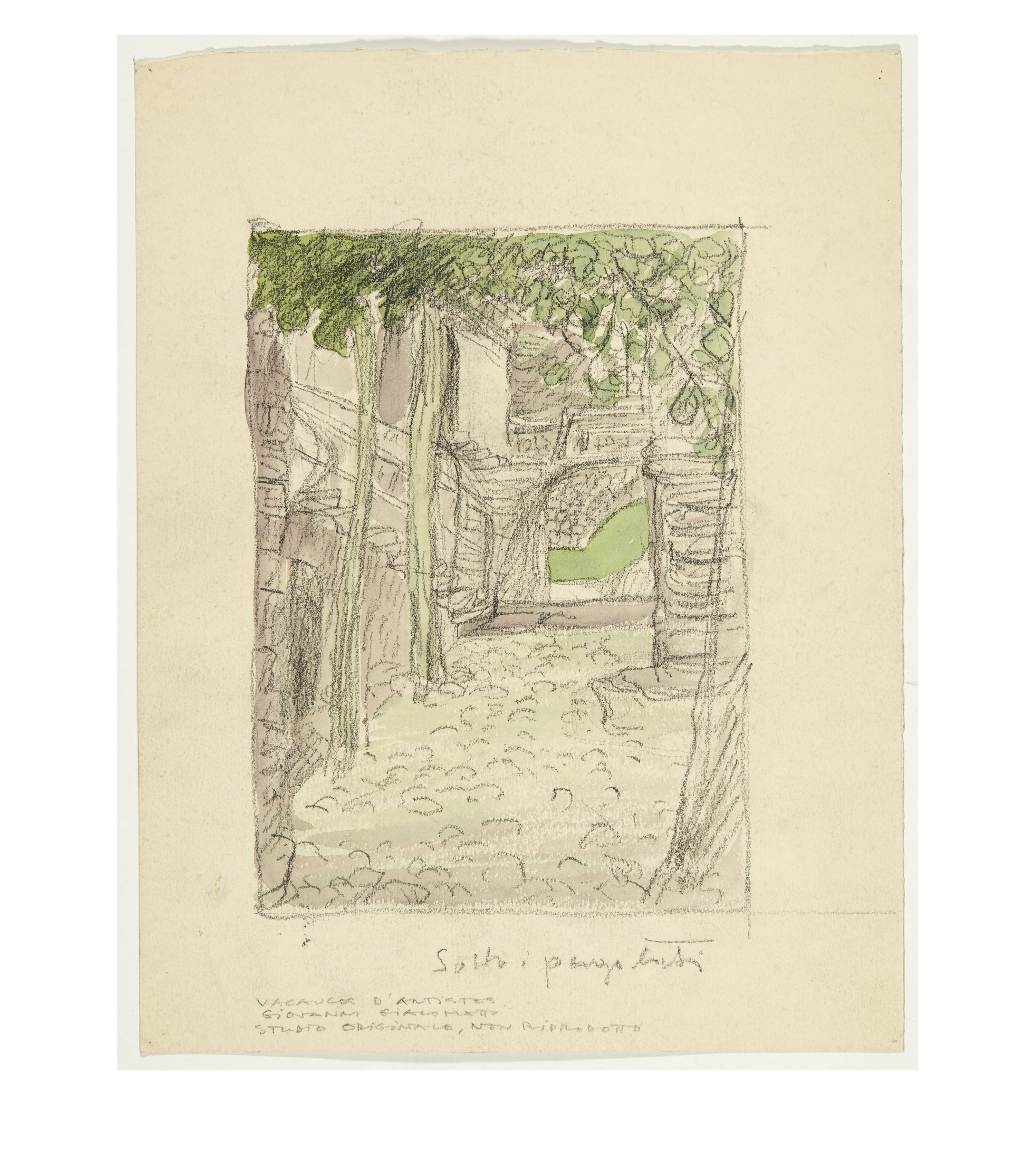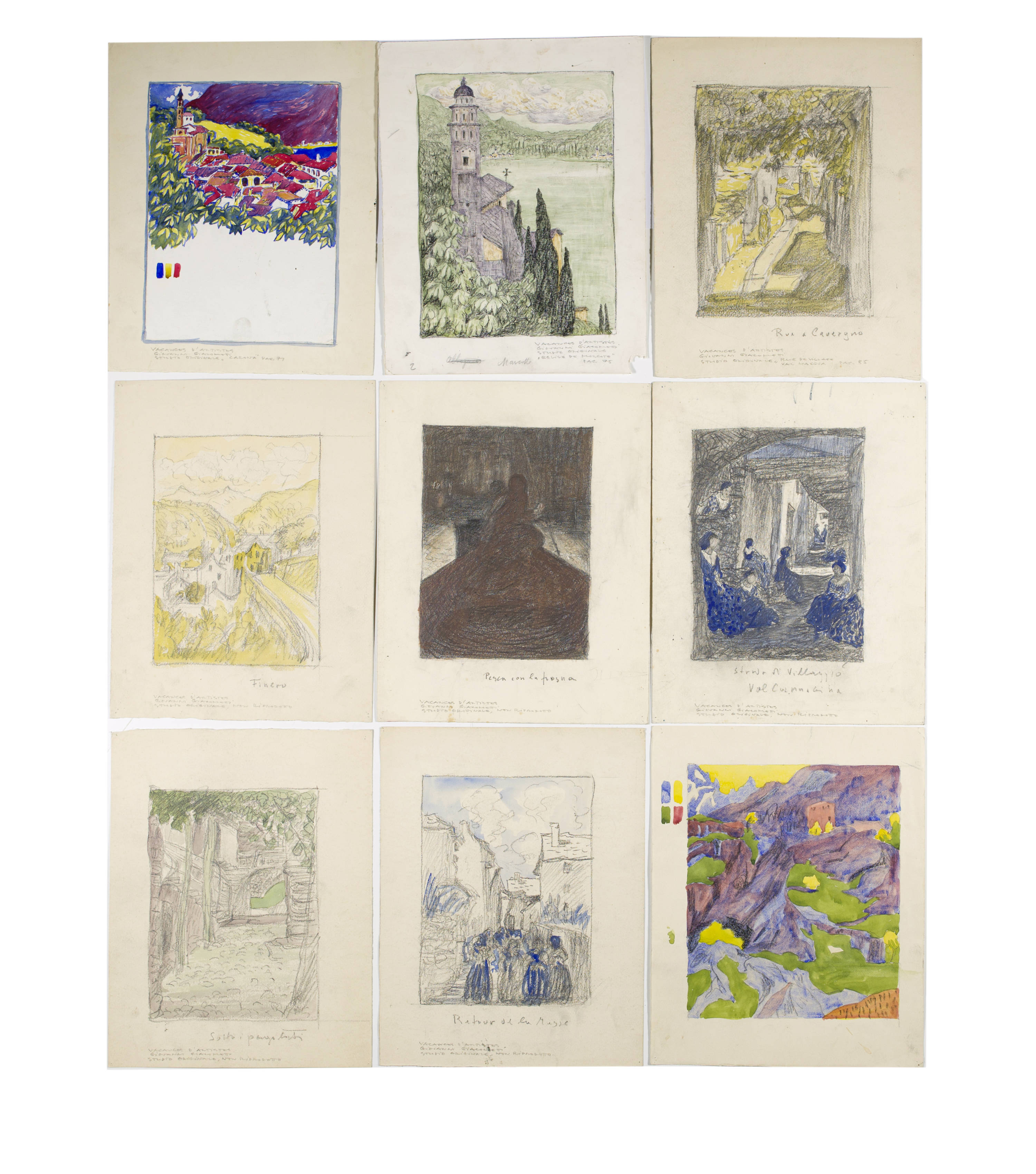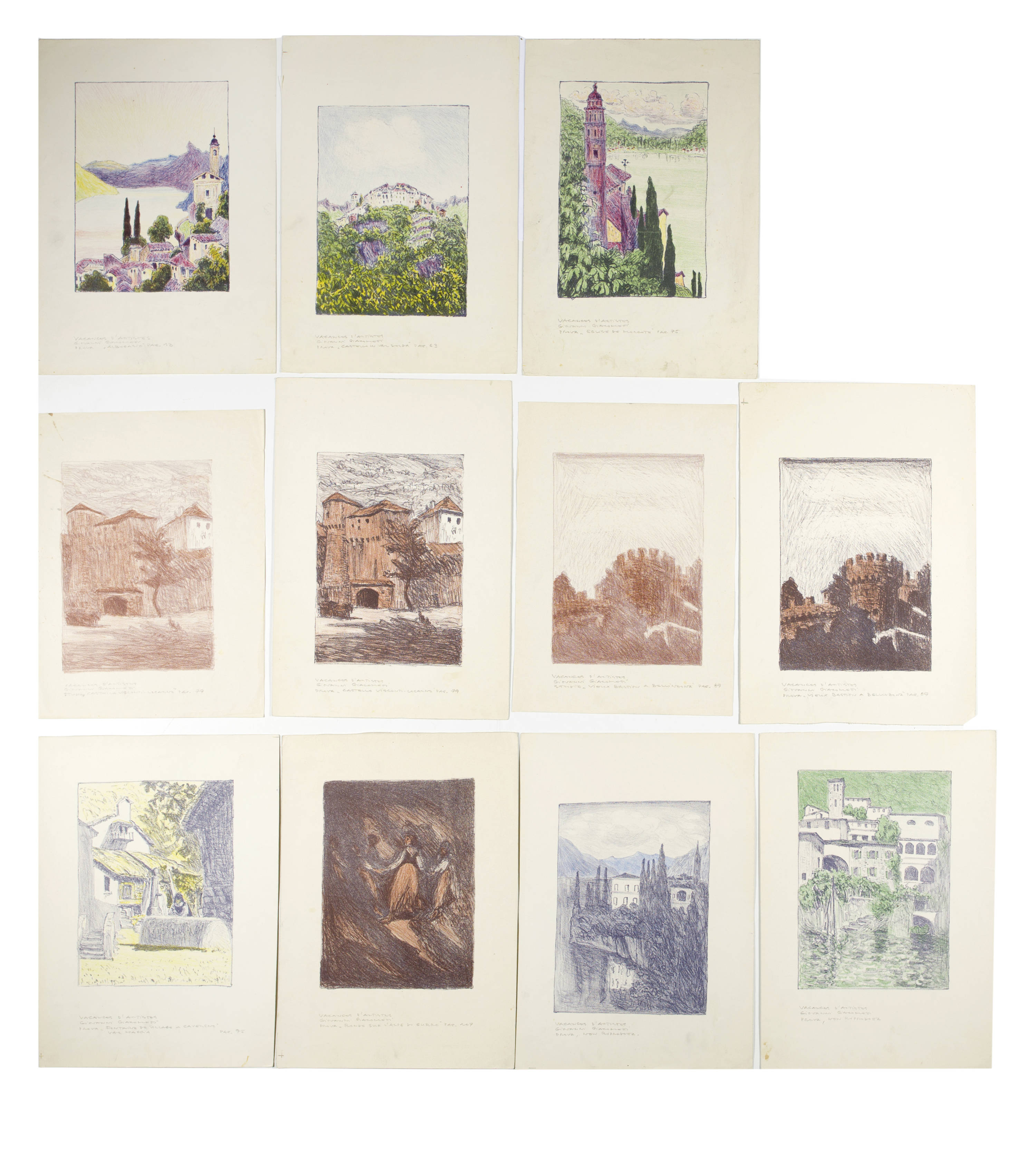 "Carona" (cf. Stauffer A72); "Église de Morcote" (cf. Stauffer A73); "Rue de Cavergno. - Rue de Village, Val Maggia" (cf. Stauffer A75); "Finero, Val Vigazzo" [sic] (cf. Stauffer A78); "Pêche à la Frosna (Fuosna)" (cf. Stauffer A82); "A Gurro" (cf. Stauffer A84) and 3 sketches of which no lithographs were made and which are therefore not mentioned in Stauffer: "Sotto i pergolati"; "Retour de la Messe" and an untitled mountain landscape.