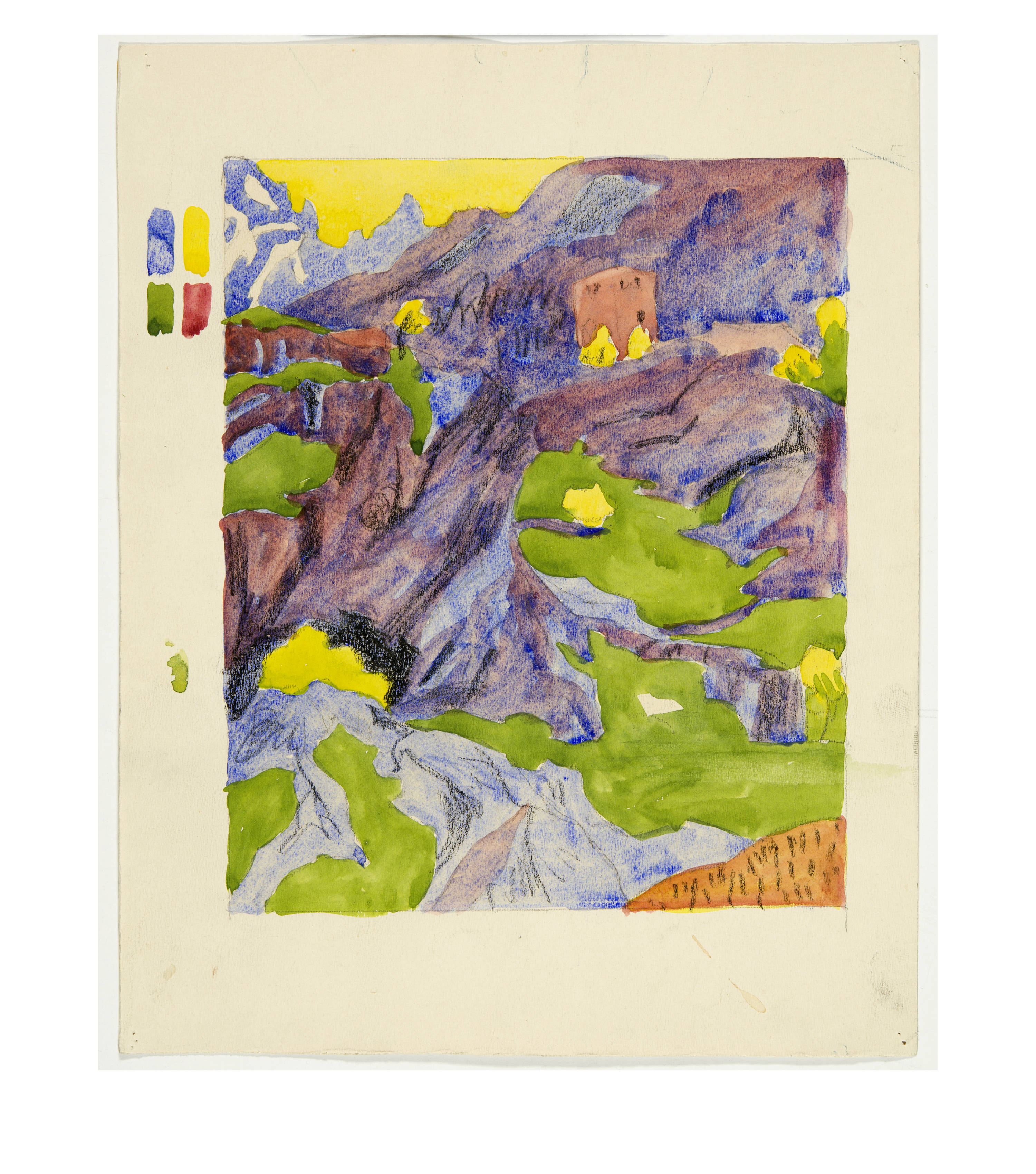 Ein Blatt montiert. Ein Blatt mit Papierverlust in der unteren, rechten Ecke und auf der Rückseite mit einer seitenverkehrten Darstellung. Meist mit Reissnagellöchlein in den Ecken und mit Atelierspuren. Farbfrisch und in sehr gutem Zustand