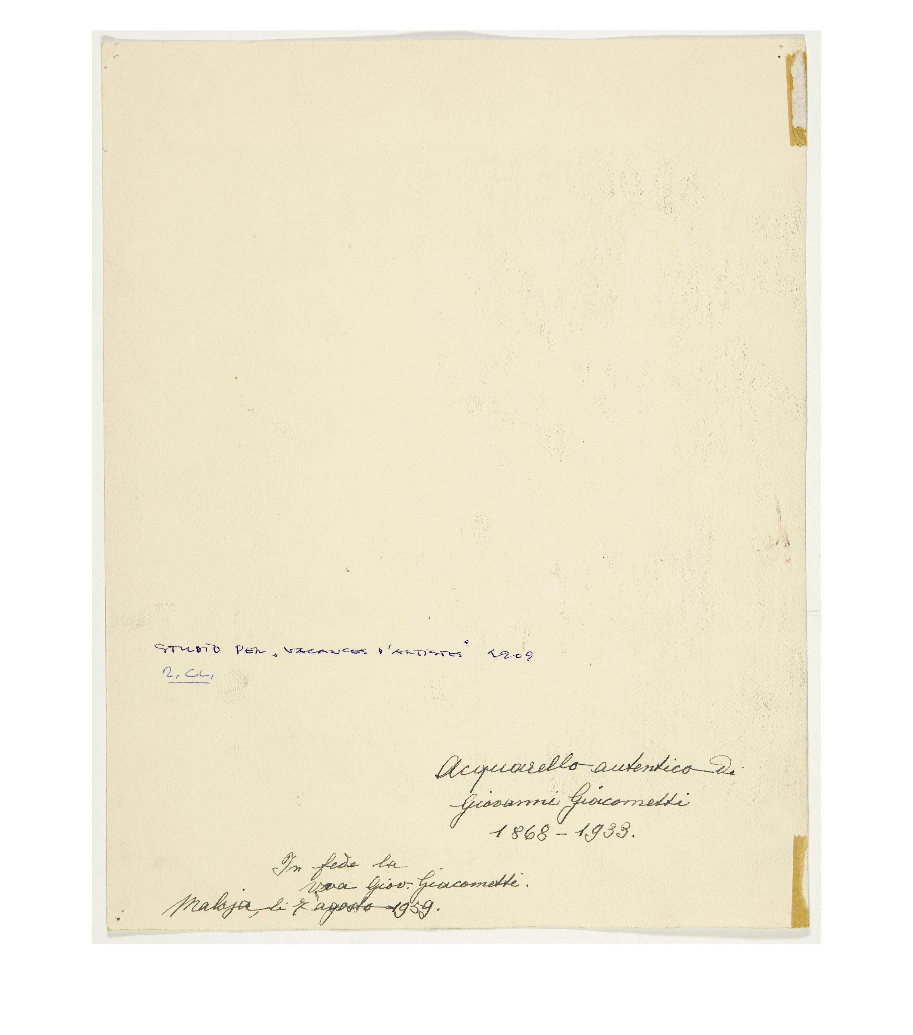 Zum Teil vom Künstler betitelt, je unten in Bleistift mit der handschriftlichen Beschreibung zum Blatt von Bruno Giacometti, dem Sohn des Künstlers, 1 Blatt auf der Rückseite von Bruno Giacometti bezeichnet und mit der handschriftlichen Echtheitsbestätigung von Annetta Giacometti, der Witwe des Künstlers, datiert vom 7. August 1959