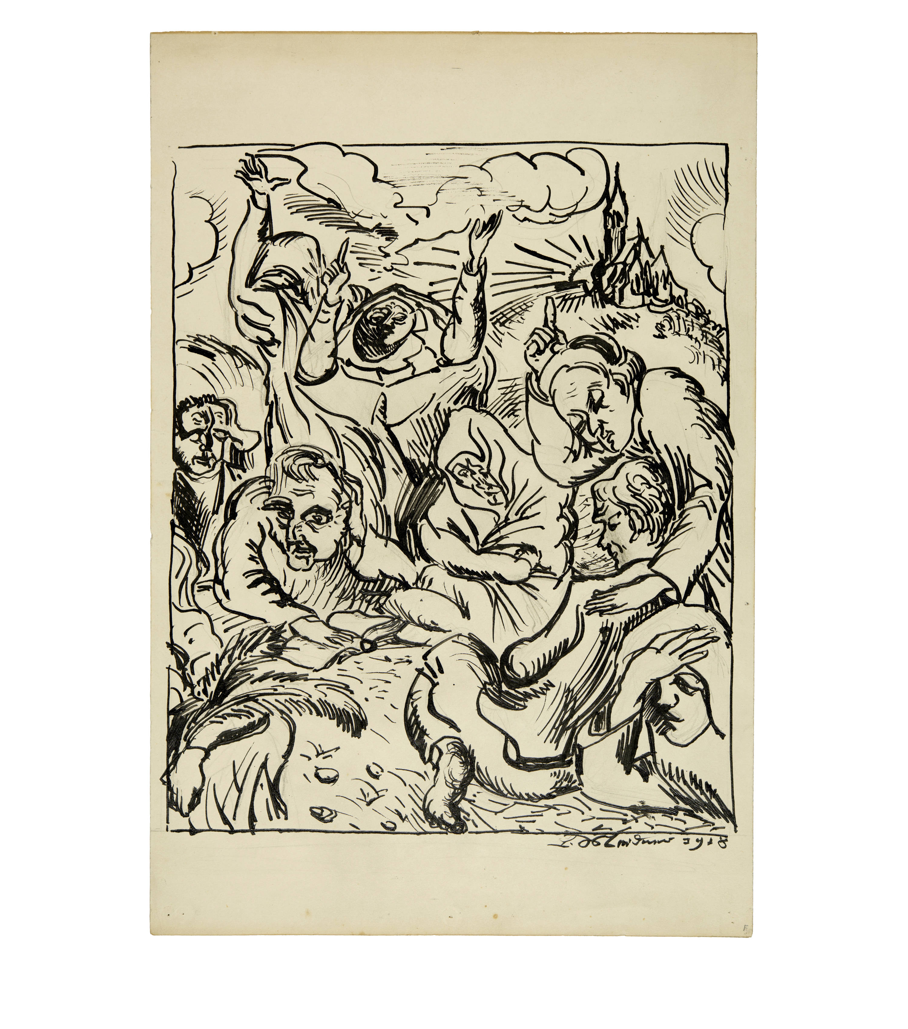 From 1916 to 1918, Ludwig Meidner did military service as an interpreter in a prisoner-of-war camp near Cottbus, where he also began his literary activities. His first solo exhibition followed in February 1918 at Paul Cassirer in Berlin and then at the Kestner-Gesellschaft in Hanover. An expressive drawing typical of the artist.