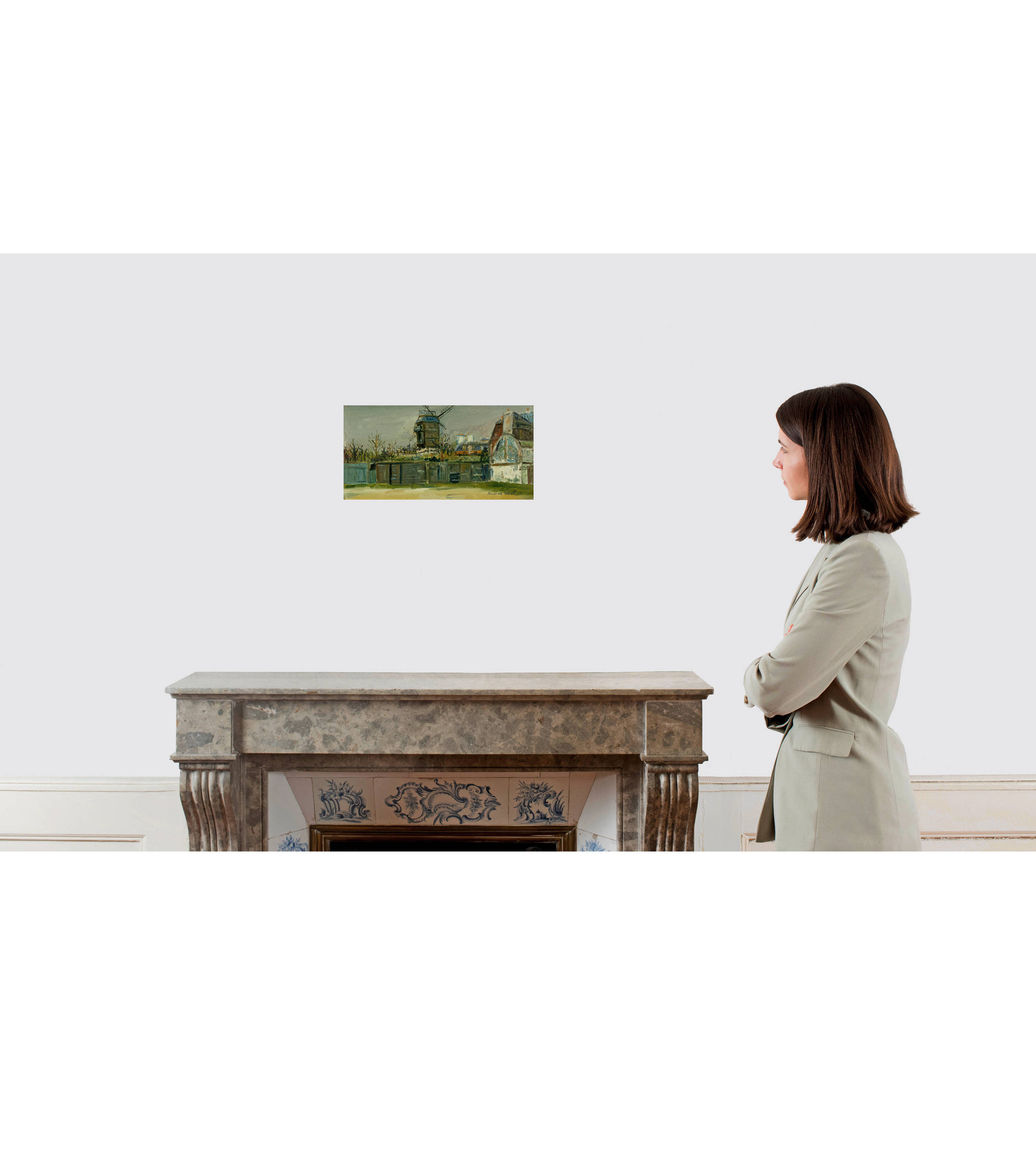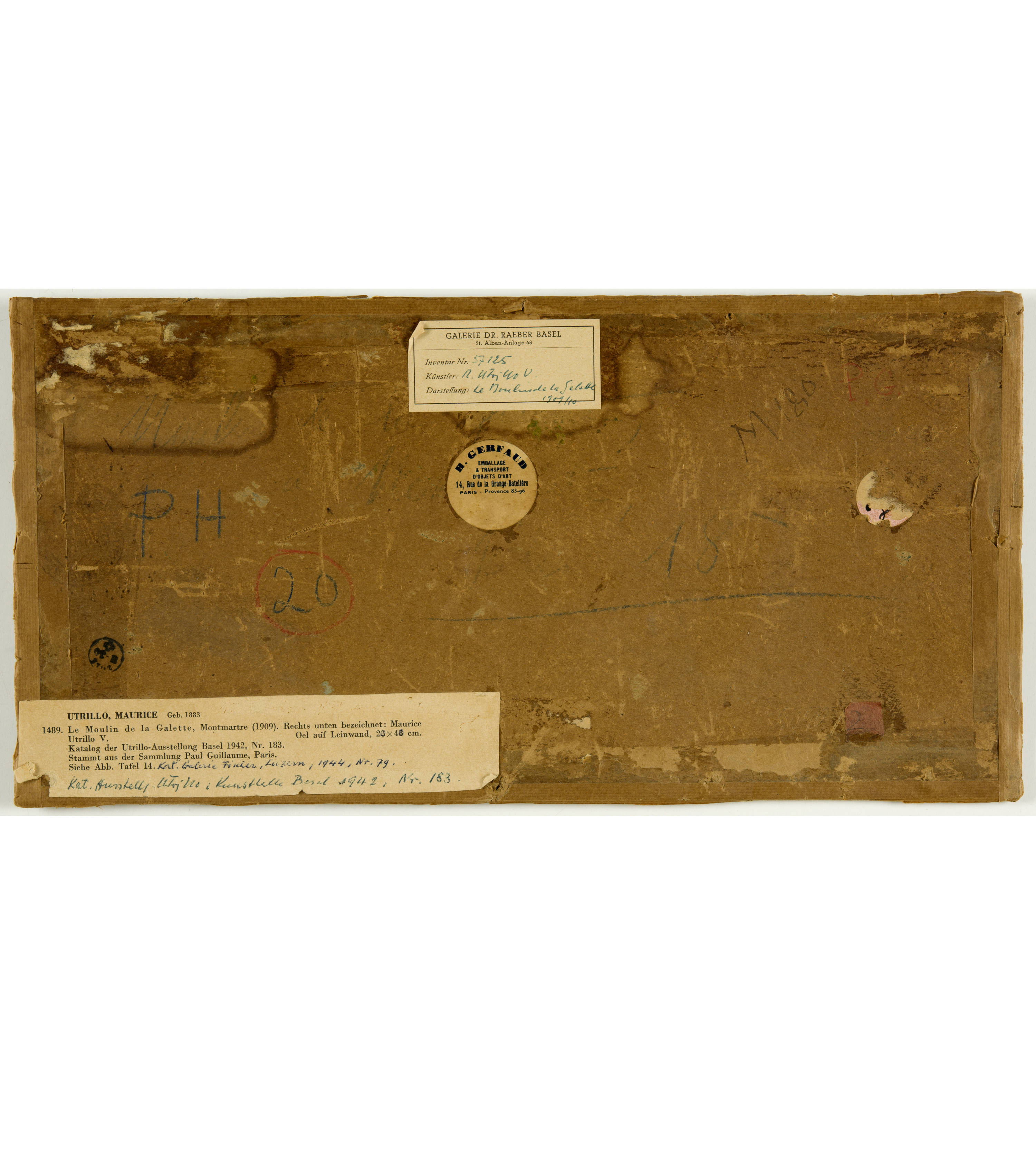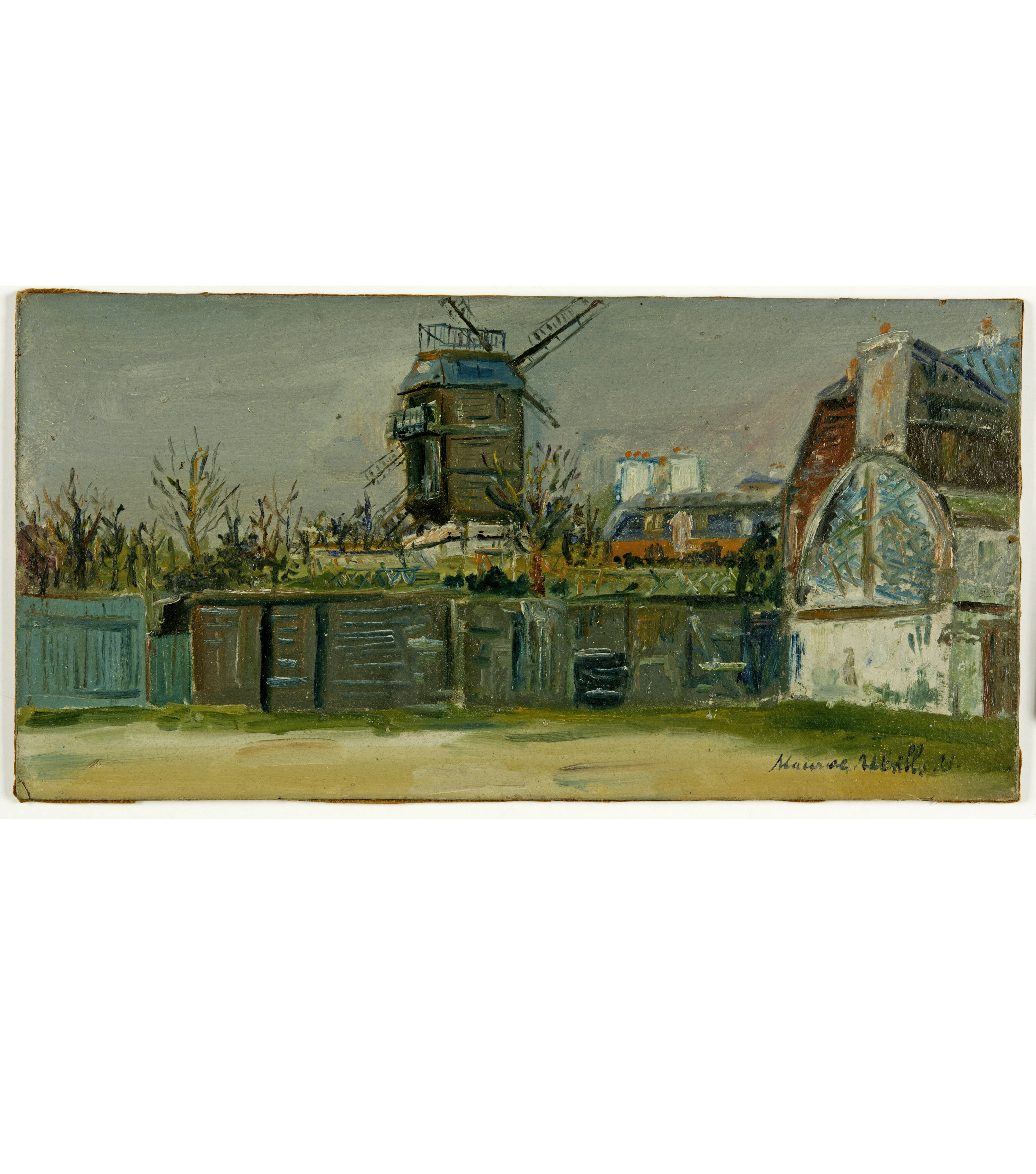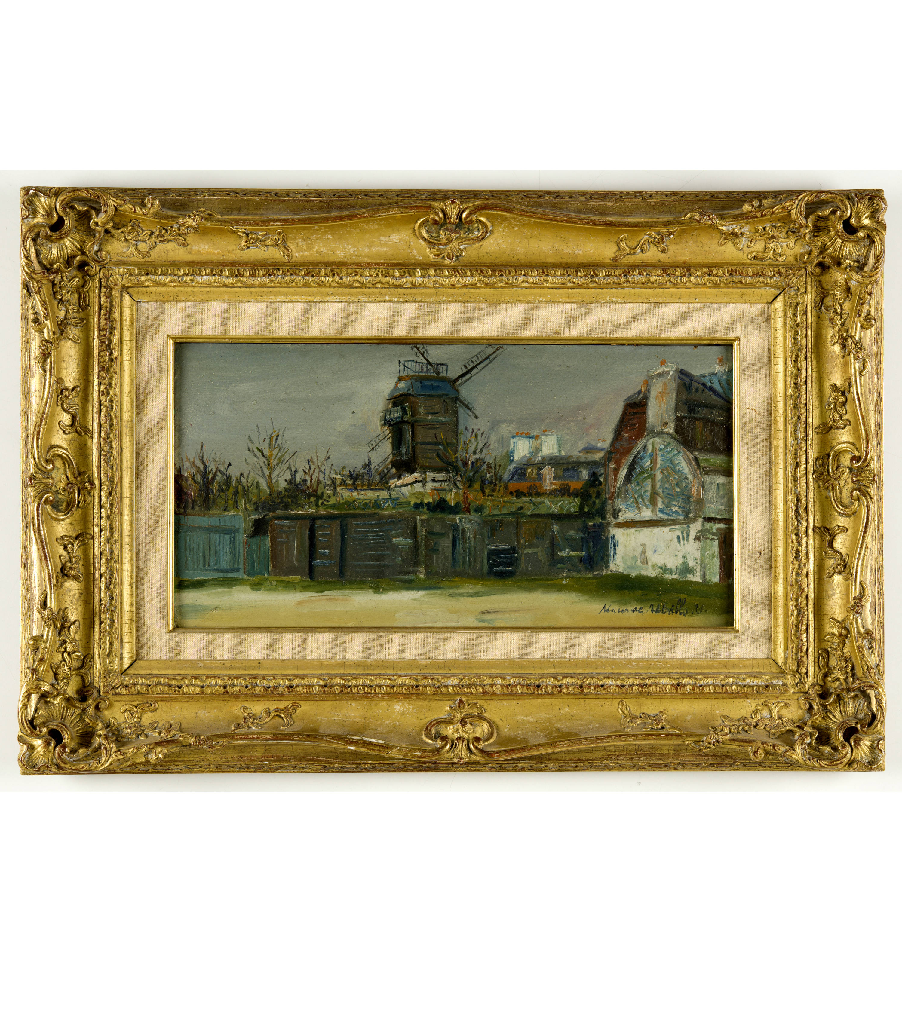 Reizvolle kleinformatige Darstellung eines der Lieblingssujets von Maurice Utrillo. Unter dem Begriff "Moulin de la Galette" versteht man eigentlich zwei alte Windmühlen, die wohl schon im 17. Jahrhundert auf dem Hügel von Montmartre standen. 1834 wurde neben einer der Mühlen eine Taverne eröffnet, die kurz danach vergrössert und zum Cabaret ausgebaut wurde, in dem sich bald zahlreiche Künstler trafen.