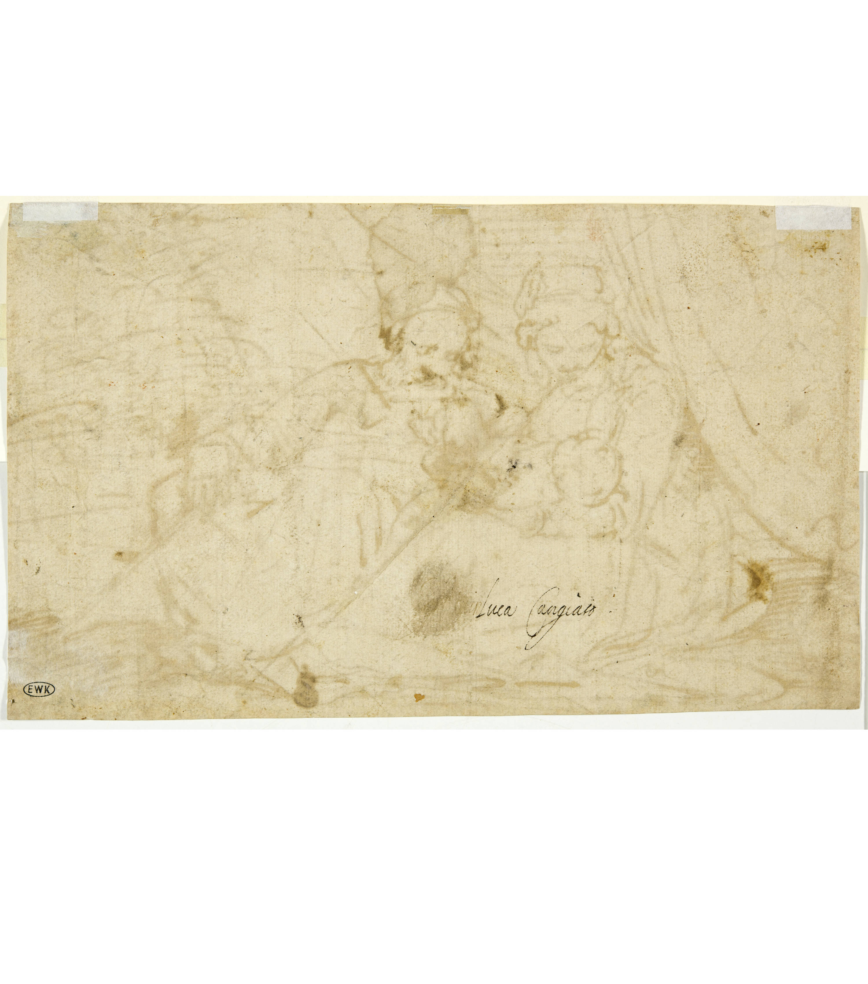 The overall layout and the general drawing style clearly reveal Cambiaso's language. Nevertheless, the strokes are too uniform and summarised. The figures lack physicality. The drawing was probably created in the workshop but hardly by the master himself.
