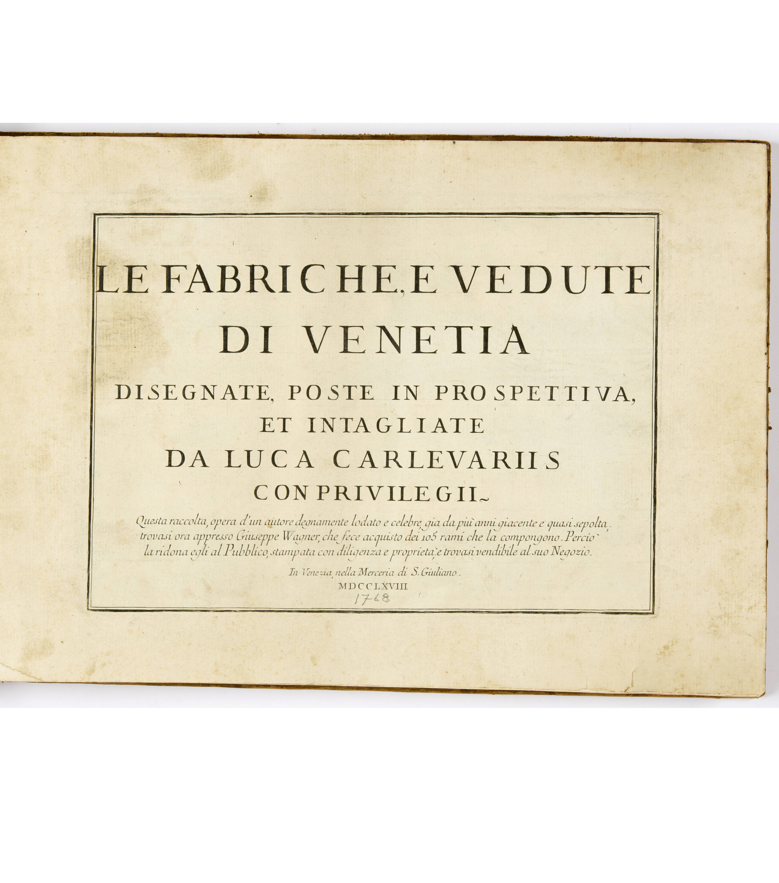 Die Folge enthält 102 Ansichten von Venedig, laut Titelblatt die Ausgabe von 1768 von Giuseppe Wagner unter Verwendung des Privilegs von 1703 und sicherlich unter Einbeziehung zahlreicher Drucke aus früheren Ausgaben, wie die Wasserzeichen "Tre Lune" und andere frühe Wasserzeichen belegen. Sämtliche Blätter in dieser Ausgabe liegen im II. Zustand mit den Nummern vor, aber vor dem III. Zustand mit der Verlegeradresse auf jedem Blatt. Fazit: Neue Titelseite des Verlegers Wagner, aber Ansichten weitgehend aus früheren Ausgaben übernommen und damit viel früher als 1768 gedruckt.