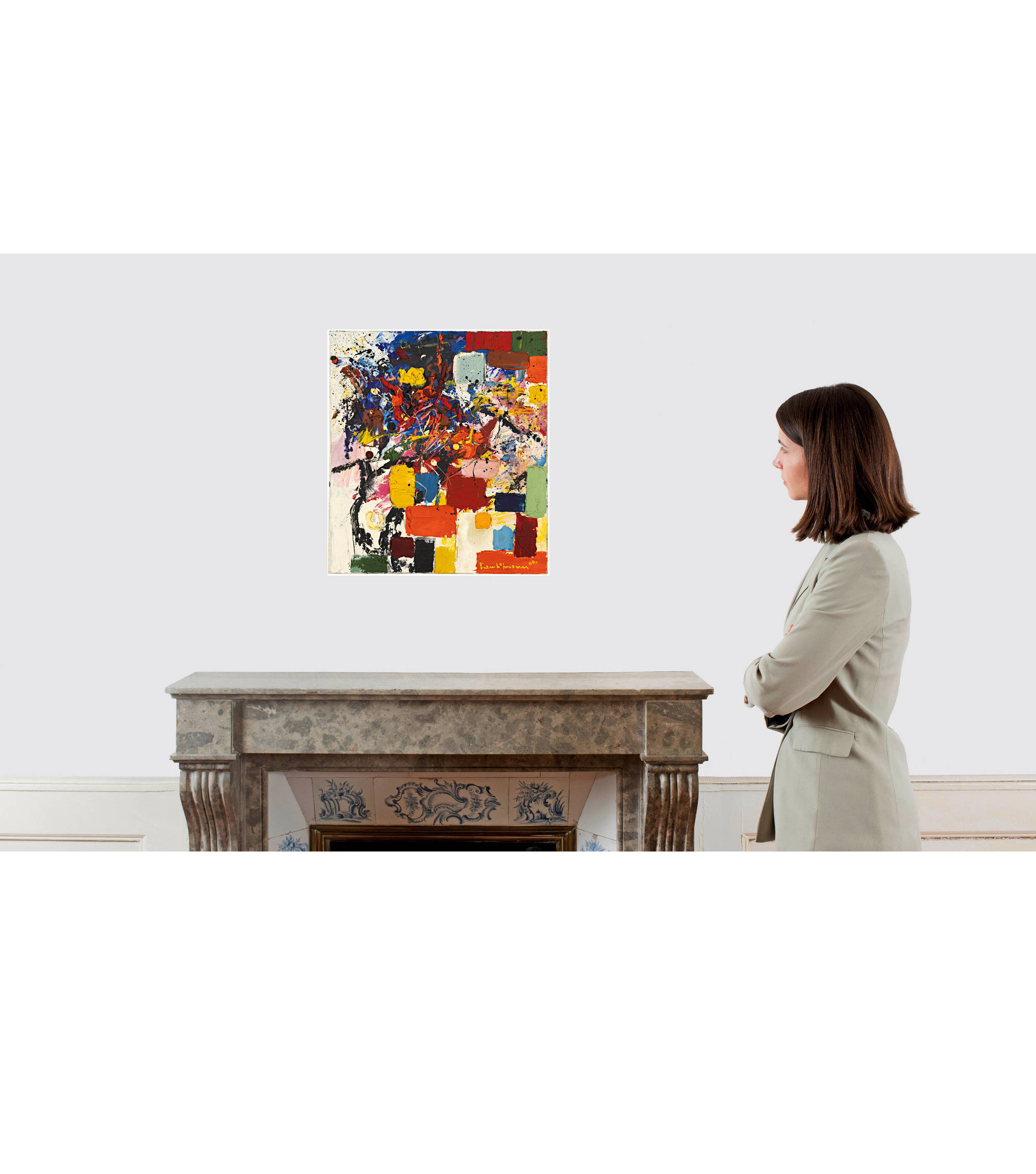 In the present work, 'Pink Dream', Hofmann's characteristic 'push and pull' concept comes to the fore. This is based on the idea that a painting is not simply a flat surface, but rather an interplay of forces that create depth and movement. Hofmann achieves this through the interaction of warm and cool colours as well as through juxtaposed, contrasting forms, lines and textures. The seemingly chaotic lines and palette-knifed blocks of colour form layer upon layer of paint, with individual drops and splashes appearing to float above others, thus creating an illusion of three-dimensionality. The contrast of bright and cool colours further enhances this plasticity: some elements push towards the viewer, while others recede into the background. The overlapping and intersecting colour elements of varying depth thus expand the perception of two-dimensional painting and create a visual rhythm that leads the viewer's gaze across the canvas and captures their attention.