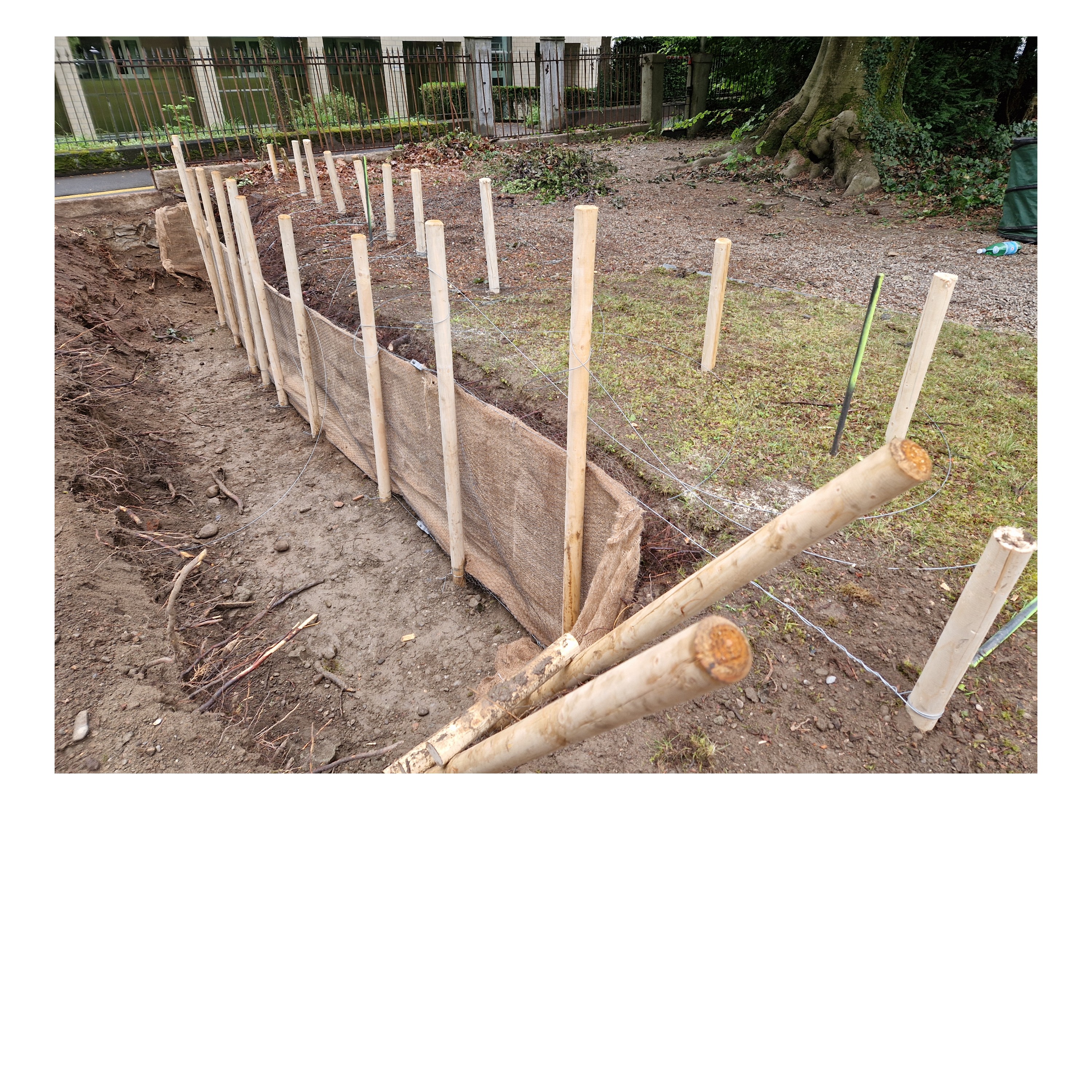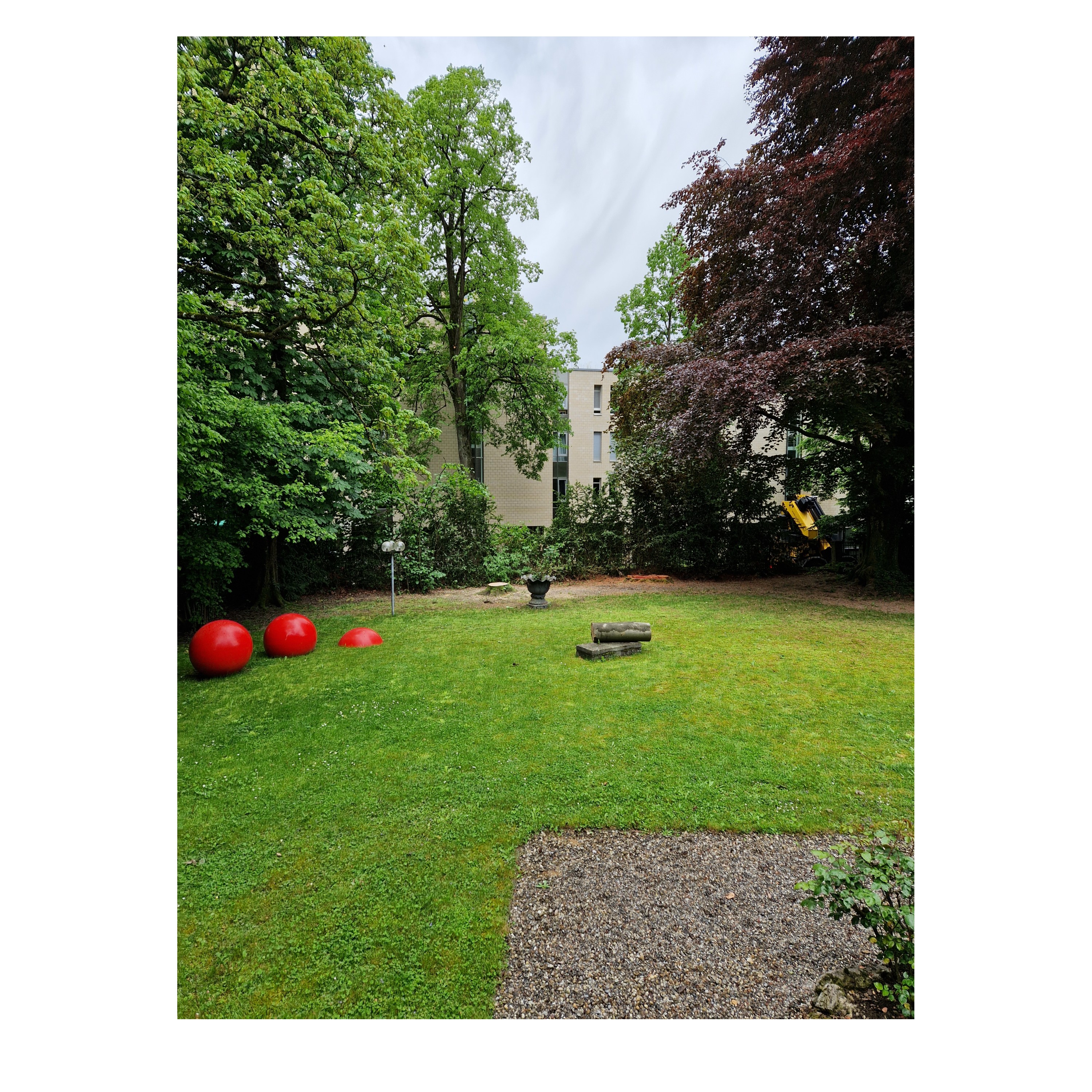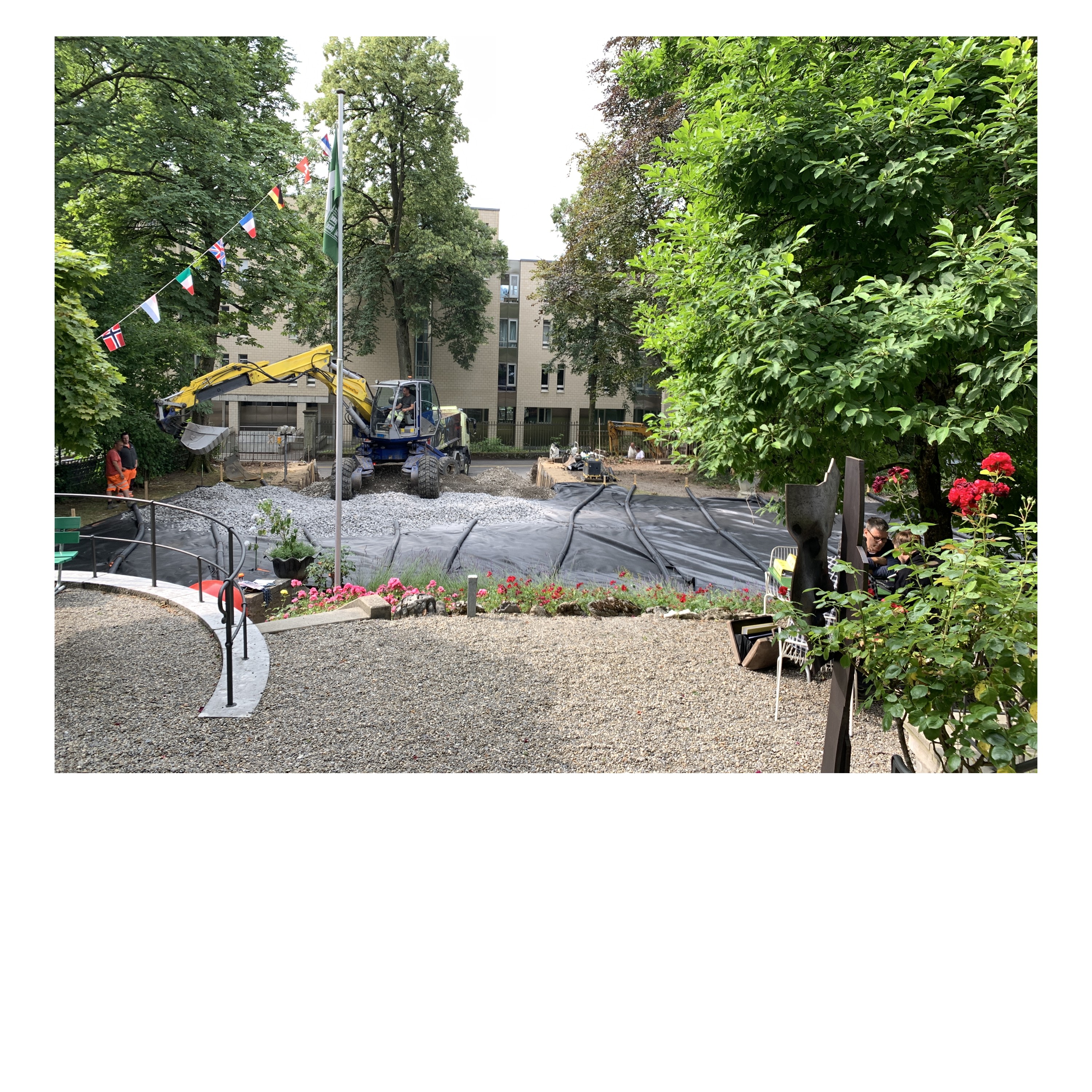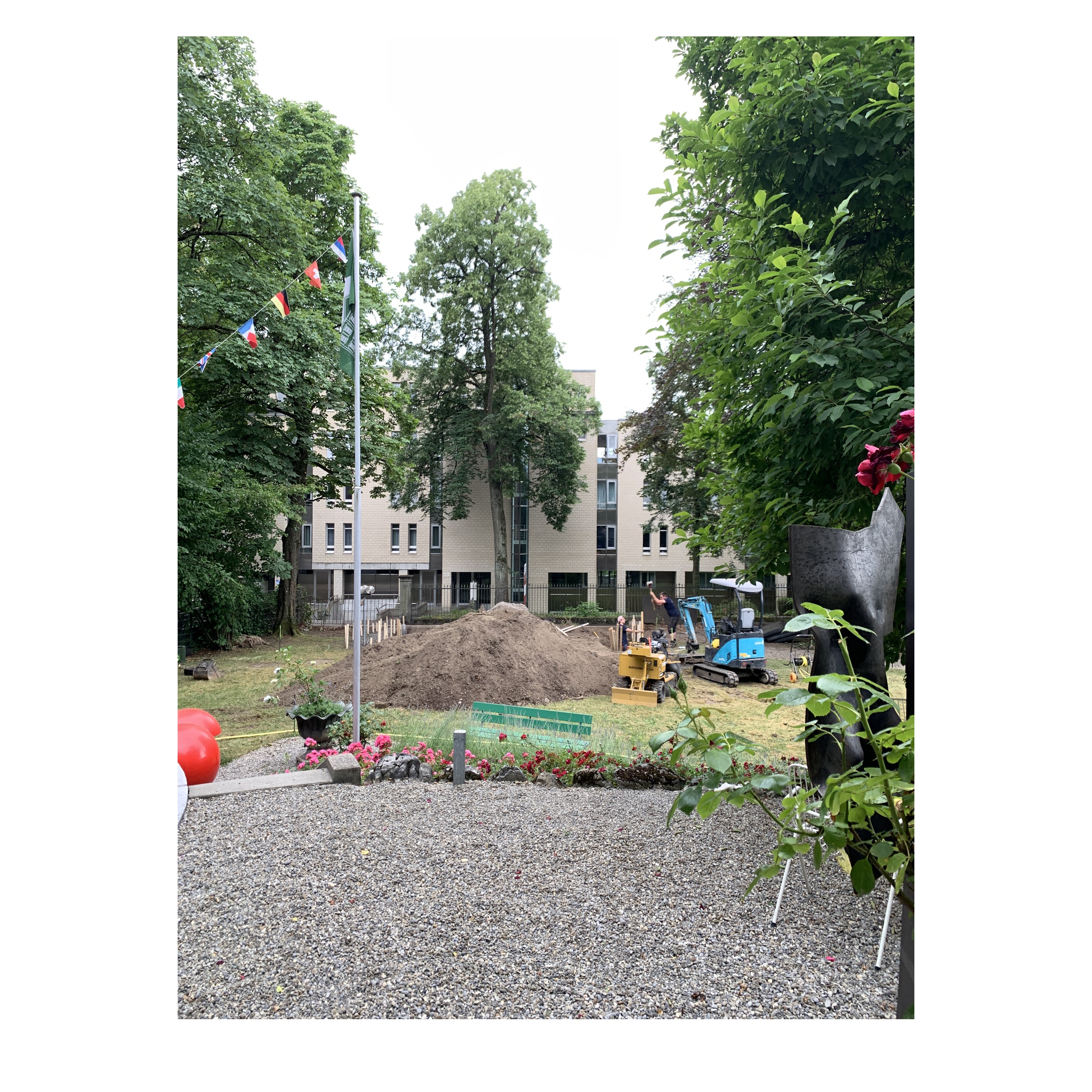 Nous montrons ici, à intervalles irréguliers, l'avancement du chantier pendant les 11 mois de travaux. Comme le jardin doit être conservé ou restauré, de gros efforts sont déployés pour protéger les arbres ; le chantier est aménagé sur la pelouse.