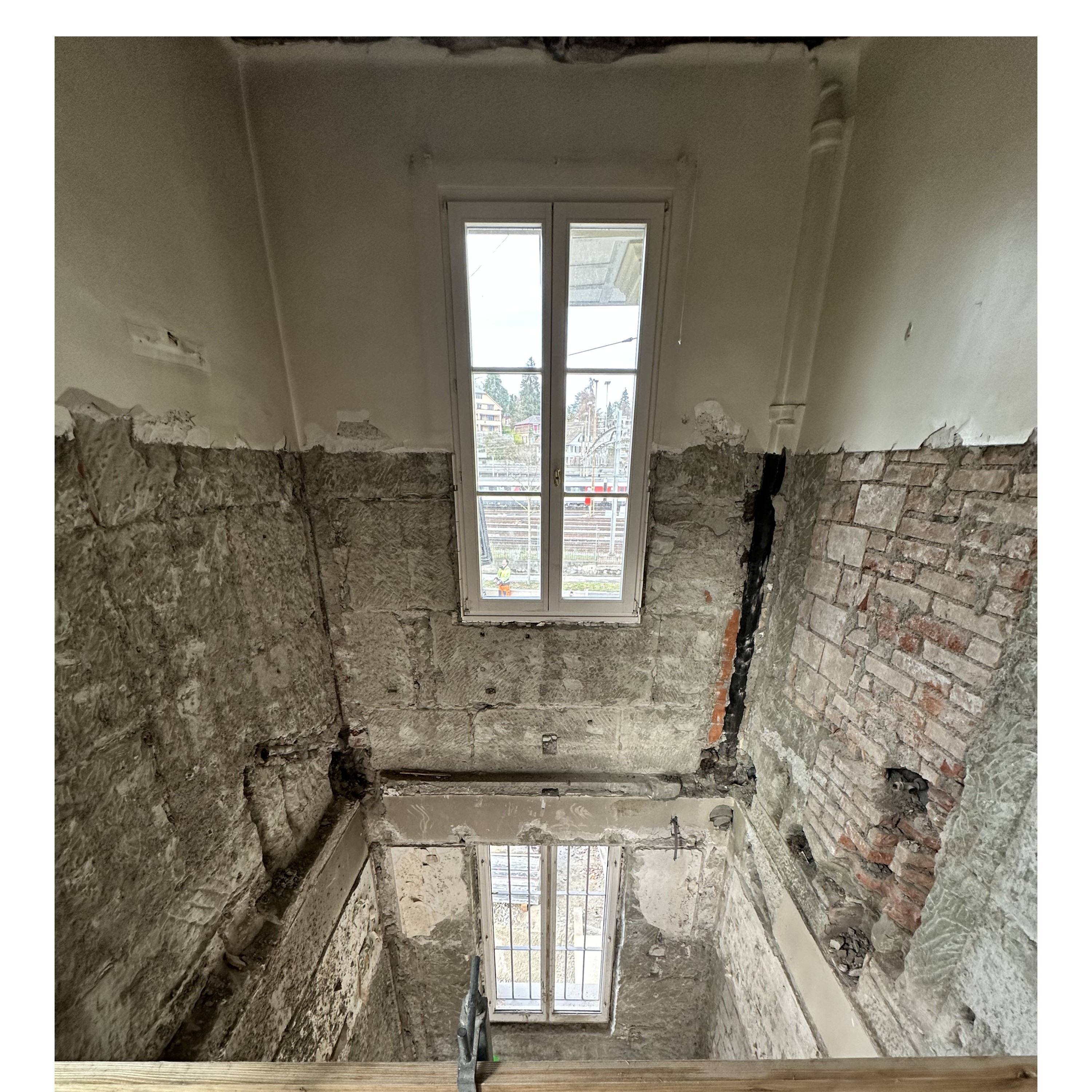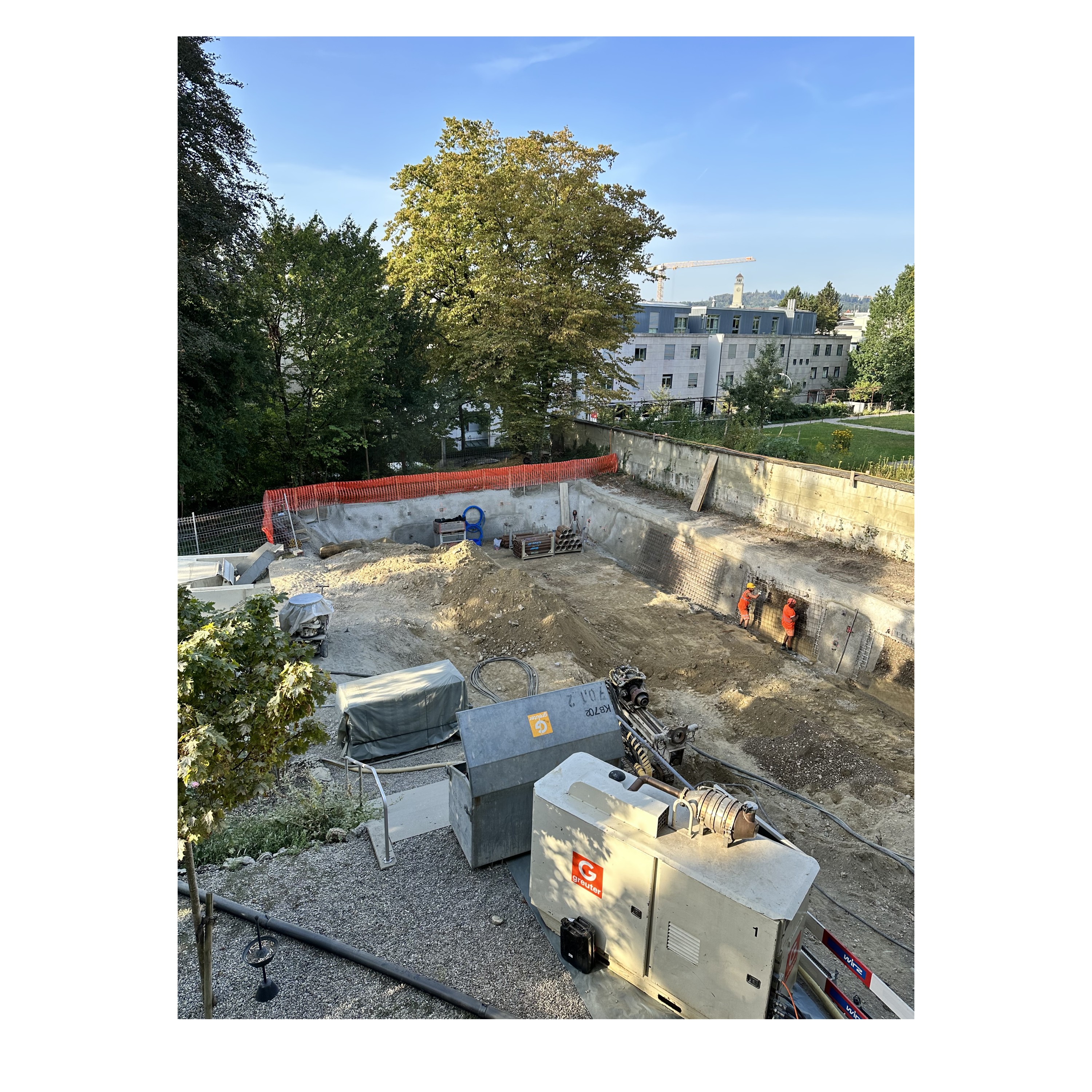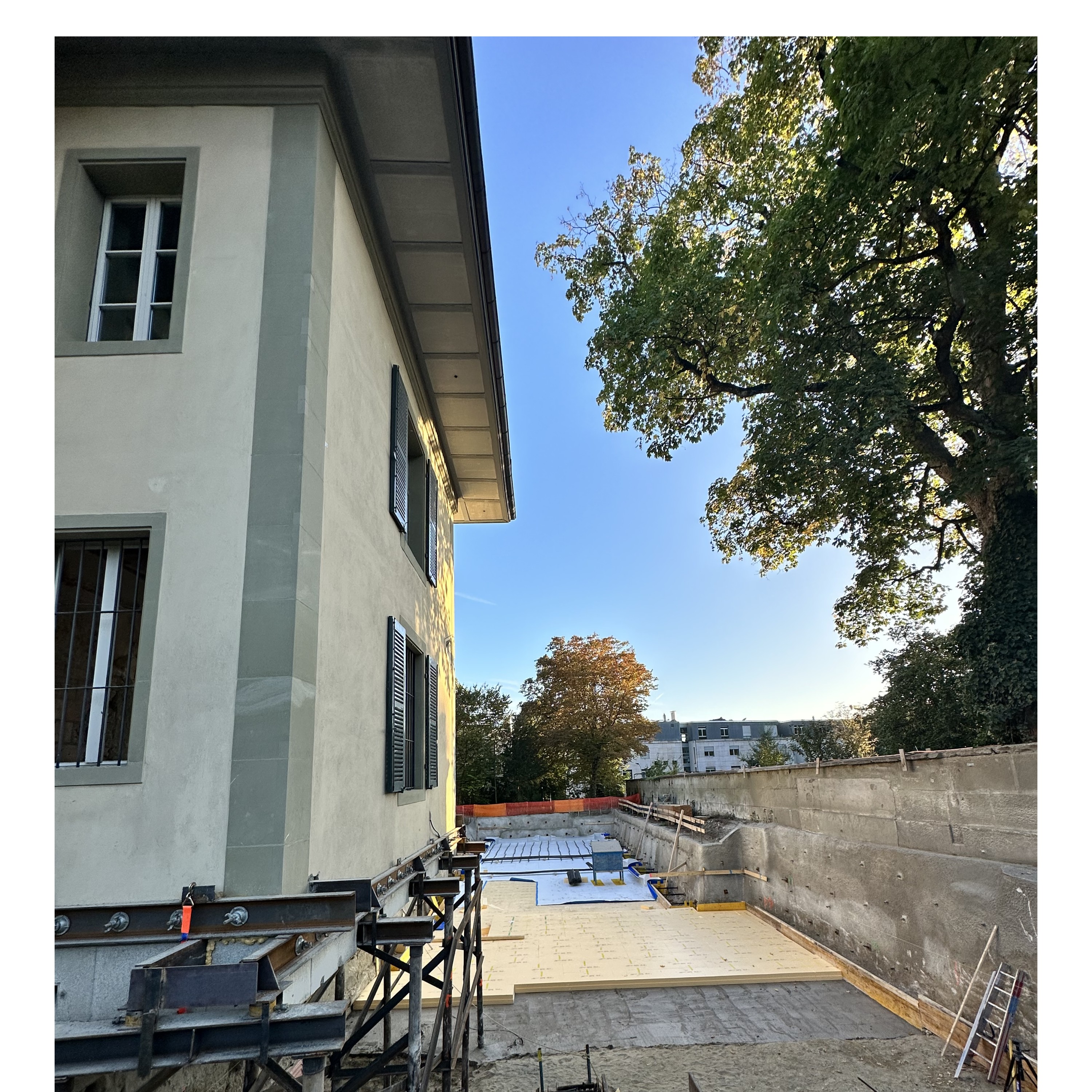 L'excavation du sous-sol commence maintenant. Parallèlement, les murs latéraux sont consolidés et l'ancien bâtiment est soutenu.
