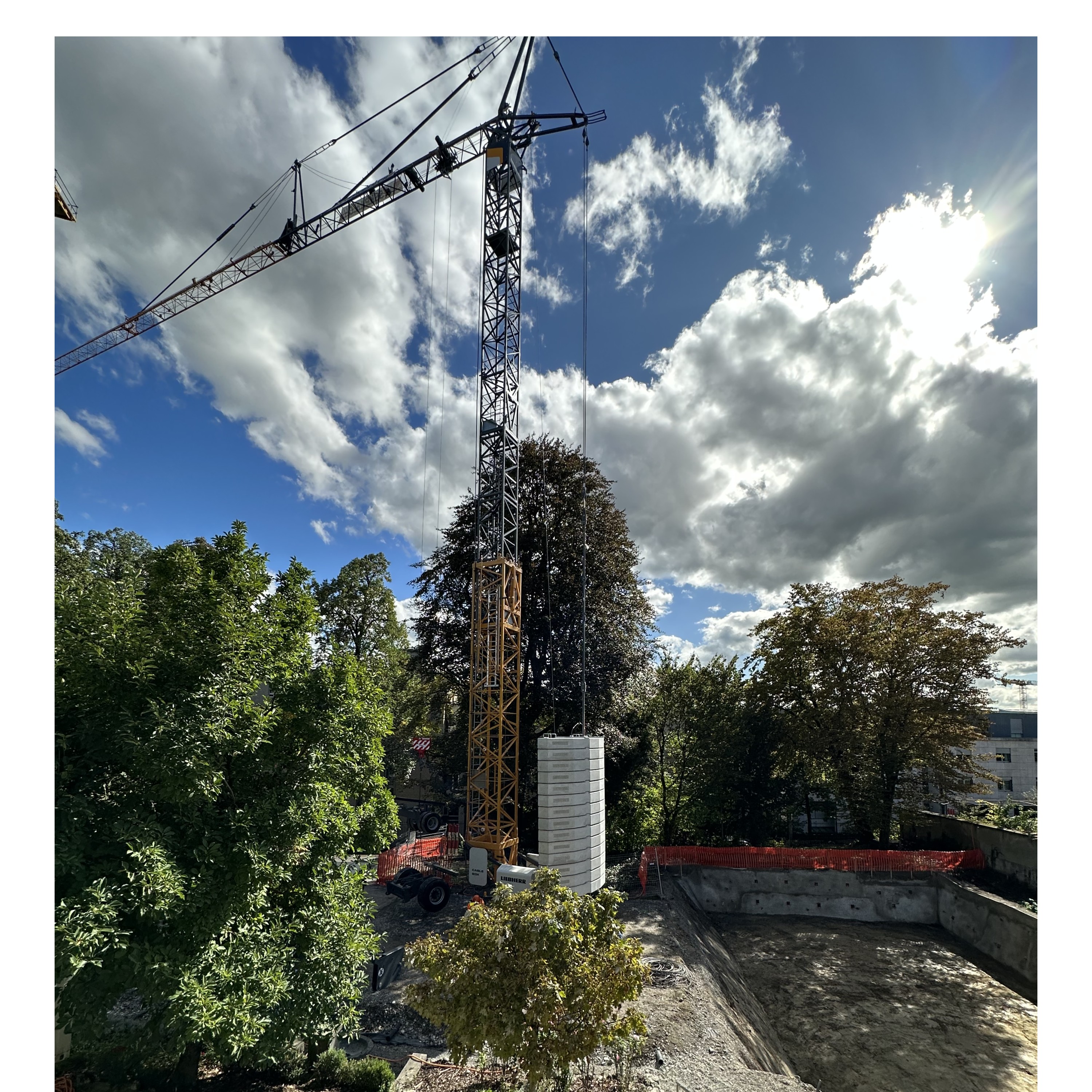 C'est le moment de mettre en place la grue qui sera nécessaire pour les travaux ultérieurs. Le sol du sous-sol est isolé. Le sol en béton est ensuite coulé.