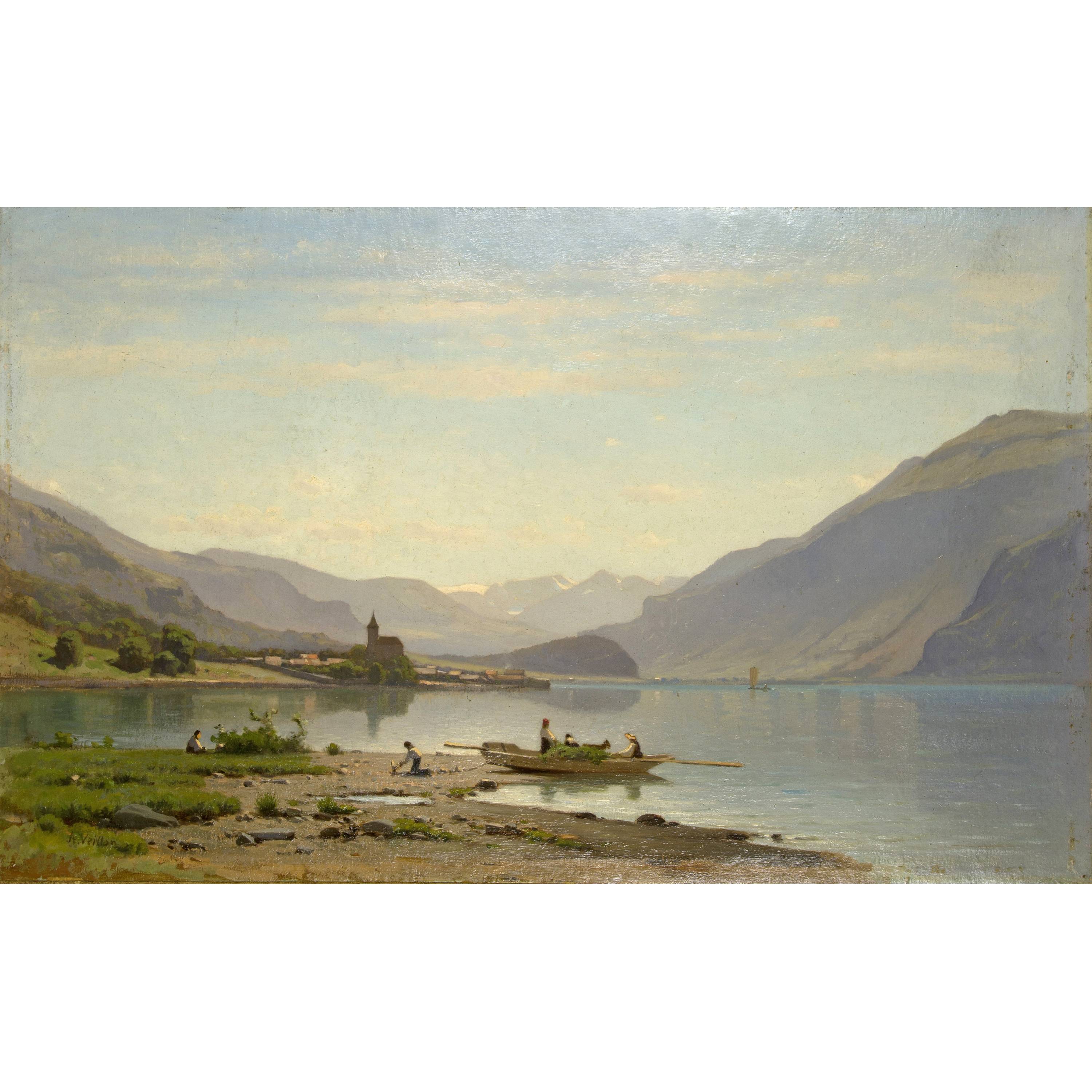 Louis-Auguste Veillon : 738 Blick von Ebligen auf die Kirche von Brienz und Brienzersee (Lac de Brienz)