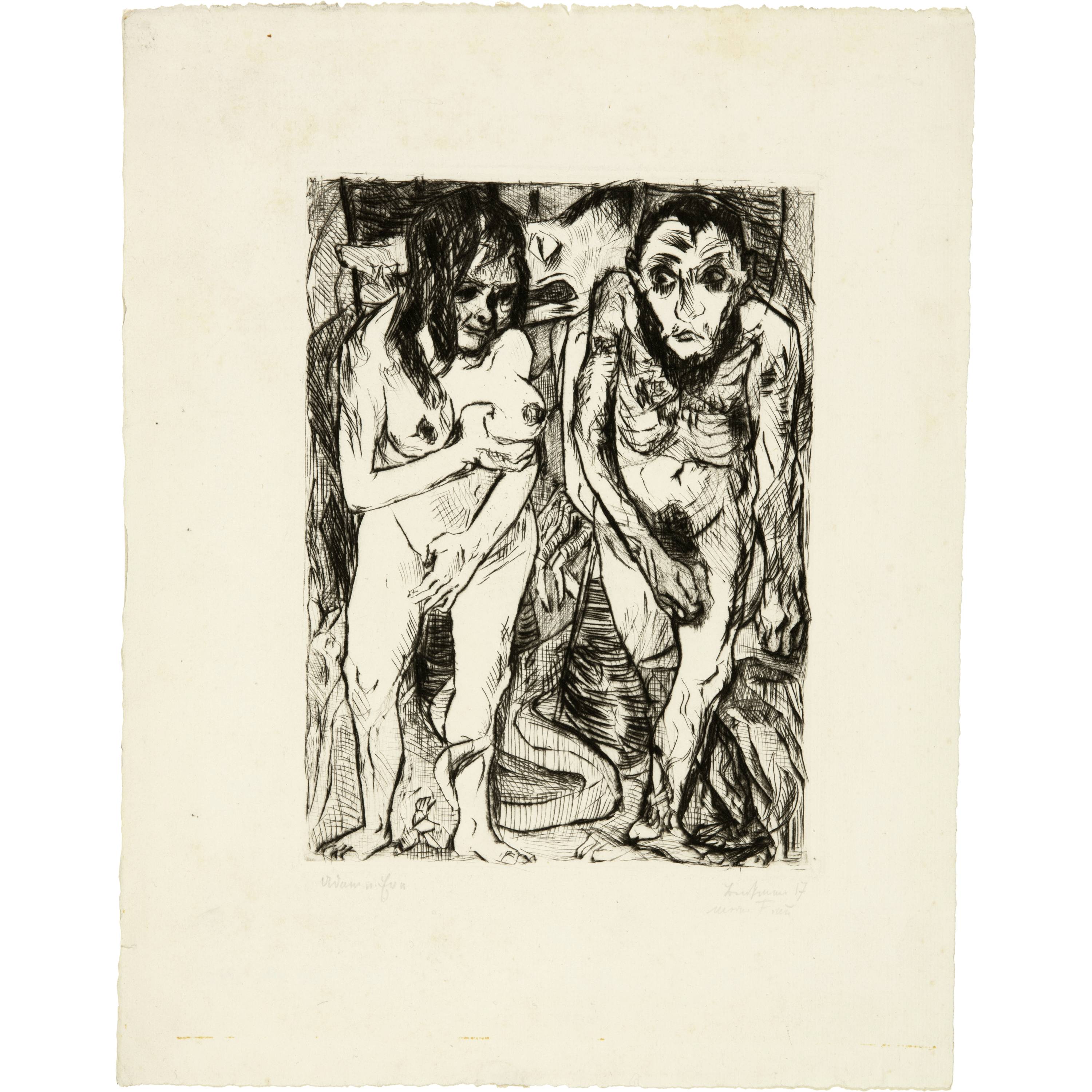Unten rechts vom Künstler in Bleistift signiert und datiert "Beckmann 17", darunter dediziert "meiner Frau", links eigenhändig betitelt "Adam und Eva"
