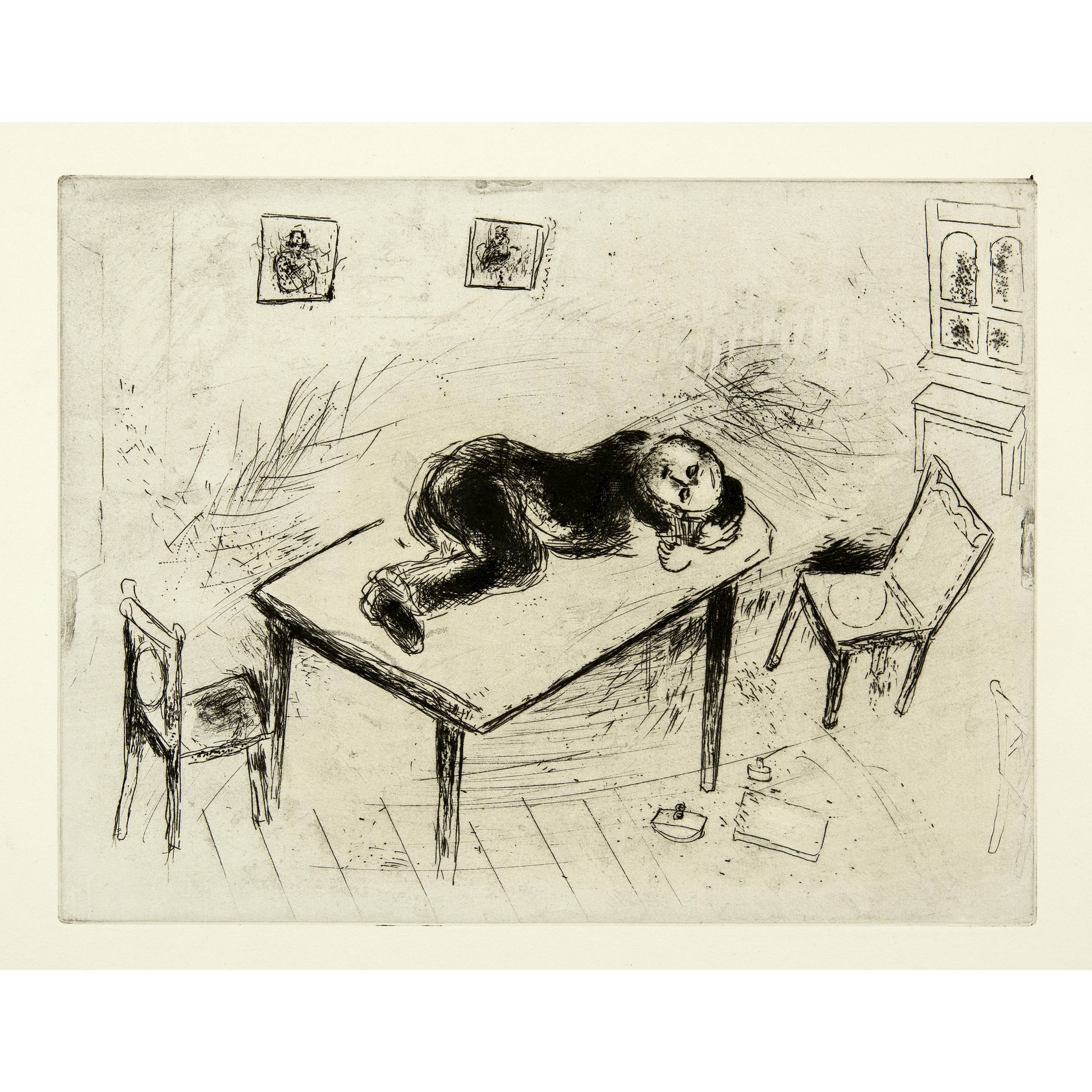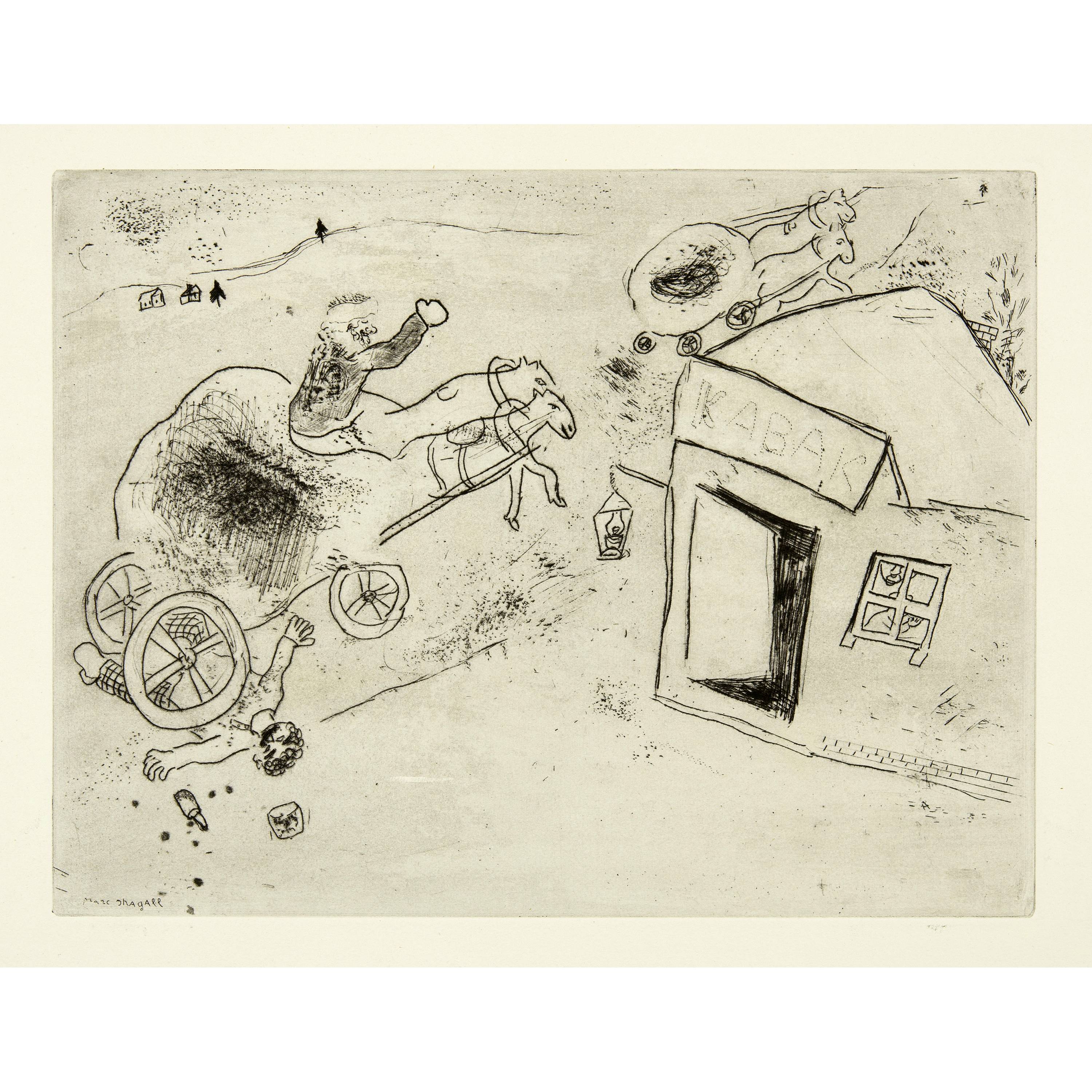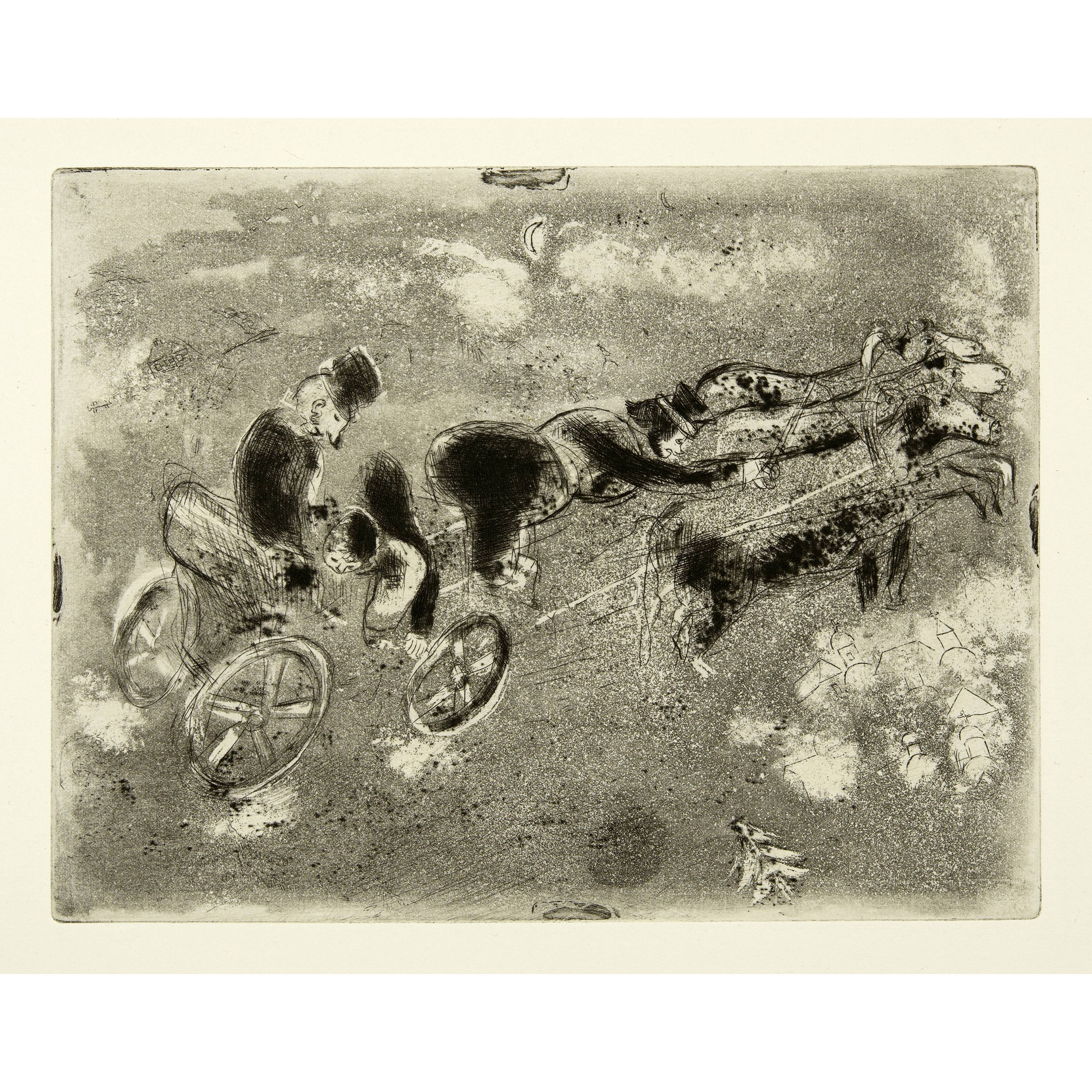 Das erste von Ambroise Vollard nach der Übersiedlung von Marc Chagall und seiner Familie nach Paris in Auftrag gegebene Buchprojekt, aber von Vollard bis zu seinem Tode 1939 nie publiziert. Die Radierungen entstanden in den Jahren von 1927 bis 1930. Nach Kriegsende 1945 übernahm Tériade aus dem Nachlass Vollard alle Vorarbeiten und die zum Teil ausgedruckten Auflagen der Illustrationen und publizierte das Werk 1948. "Les Âmes mortes" ist sicherlich eines der schönsten illustrierten Bücher von Marc Chagall. Die Illustrationen erfassen in einem seltenen Detailreichtum das Leben in Russland vor 1914. Schöne Exemplare sind heute selten geworden