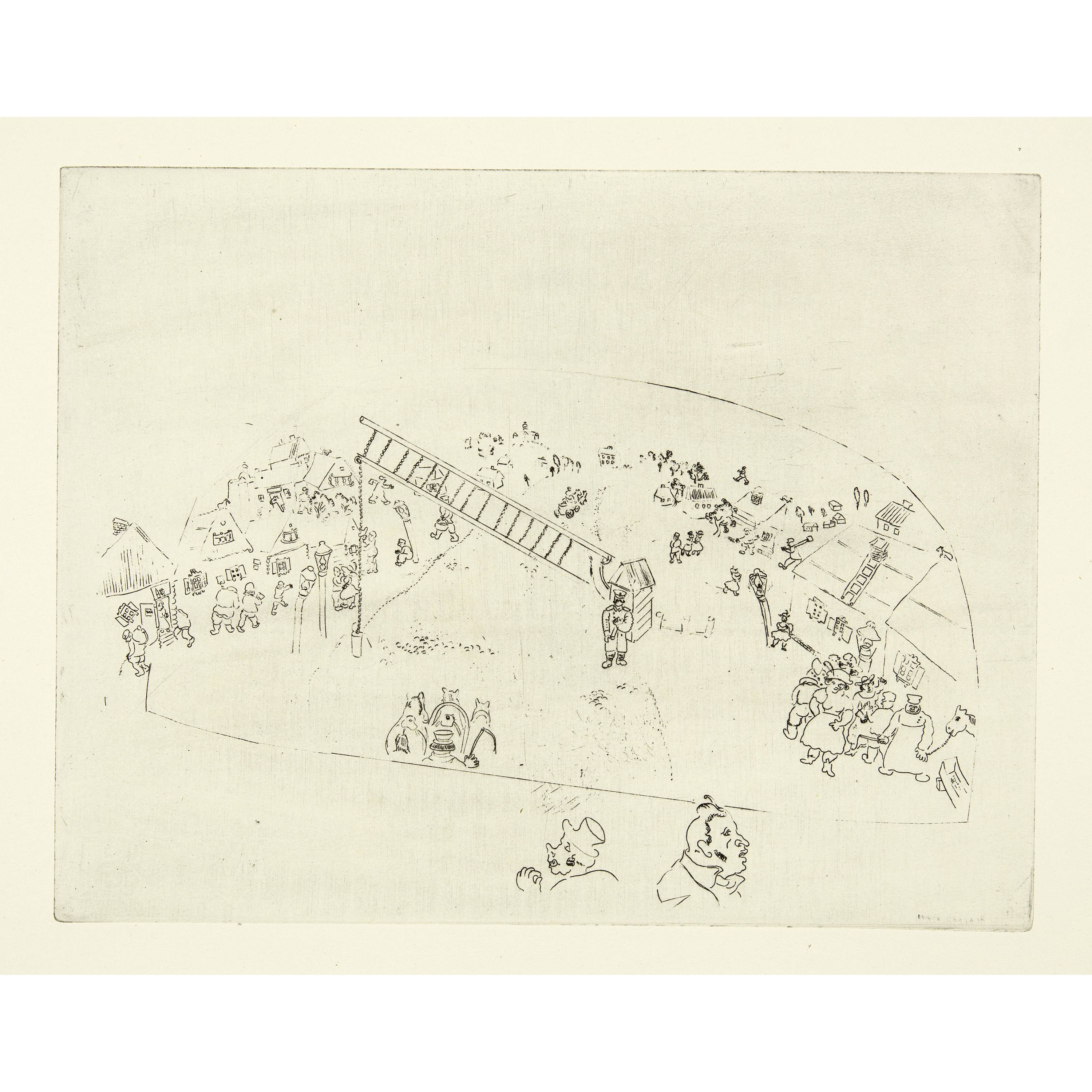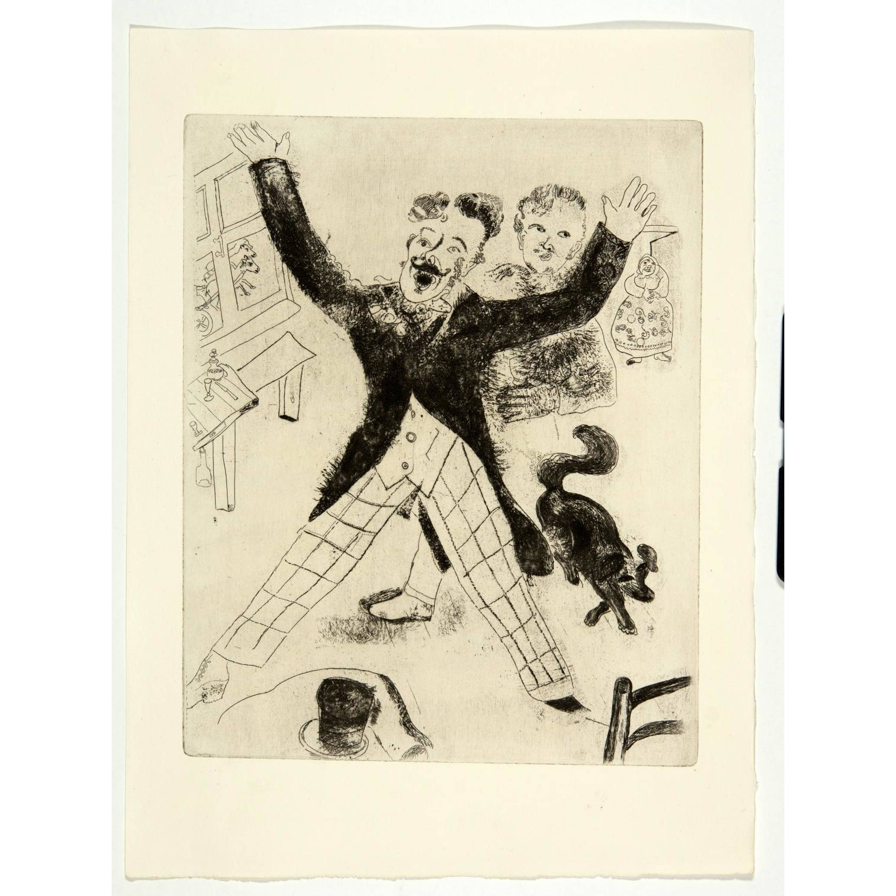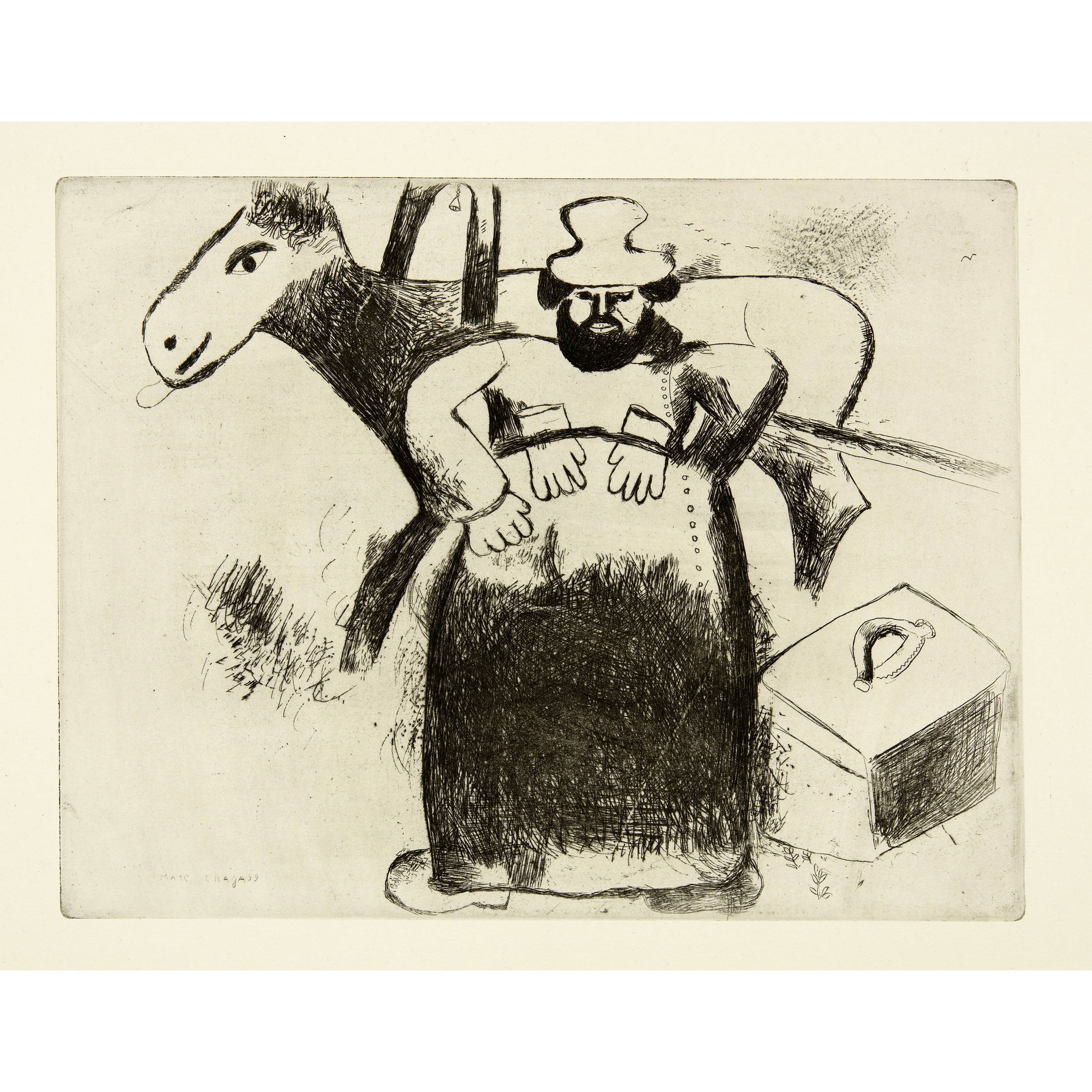Das erste von Ambroise Vollard nach der Übersiedlung von Marc Chagall und seiner Familie nach Paris in Auftrag gegebene Buchprojekt, aber von Vollard bis zu seinem Tode 1939 nie publiziert. Die Radierungen entstanden in den Jahren von 1927 bis 1930. Nach Kriegsende 1945 übernahm Tériade aus dem Nachlass Vollard alle Vorarbeiten und die zum Teil ausgedruckten Auflagen der Illustrationen und publizierte das Werk 1948. "Les Âmes mortes" ist sicherlich eines der schönsten illustrierten Bücher von Marc Chagall. Die Illustrationen erfassen in einem seltenen Detailreichtum das Leben in Russland vor 1914. Schöne Exemplare sind heute selten geworden