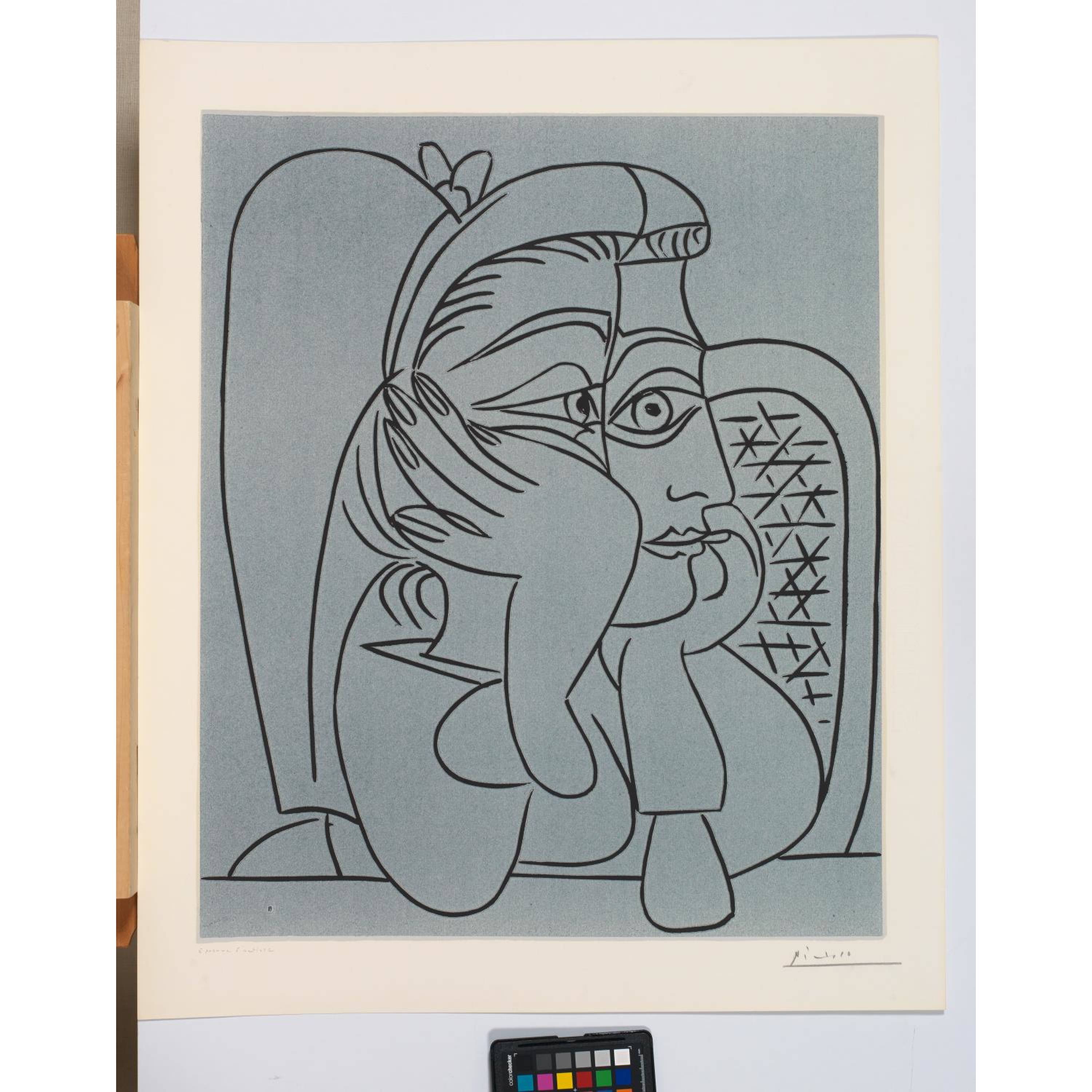 One of the particularly beautiful, large-format portraits of Picasso's companion and model Jacqueline Roque from the first series of linocuts, created in Cannes on 2 October 1959