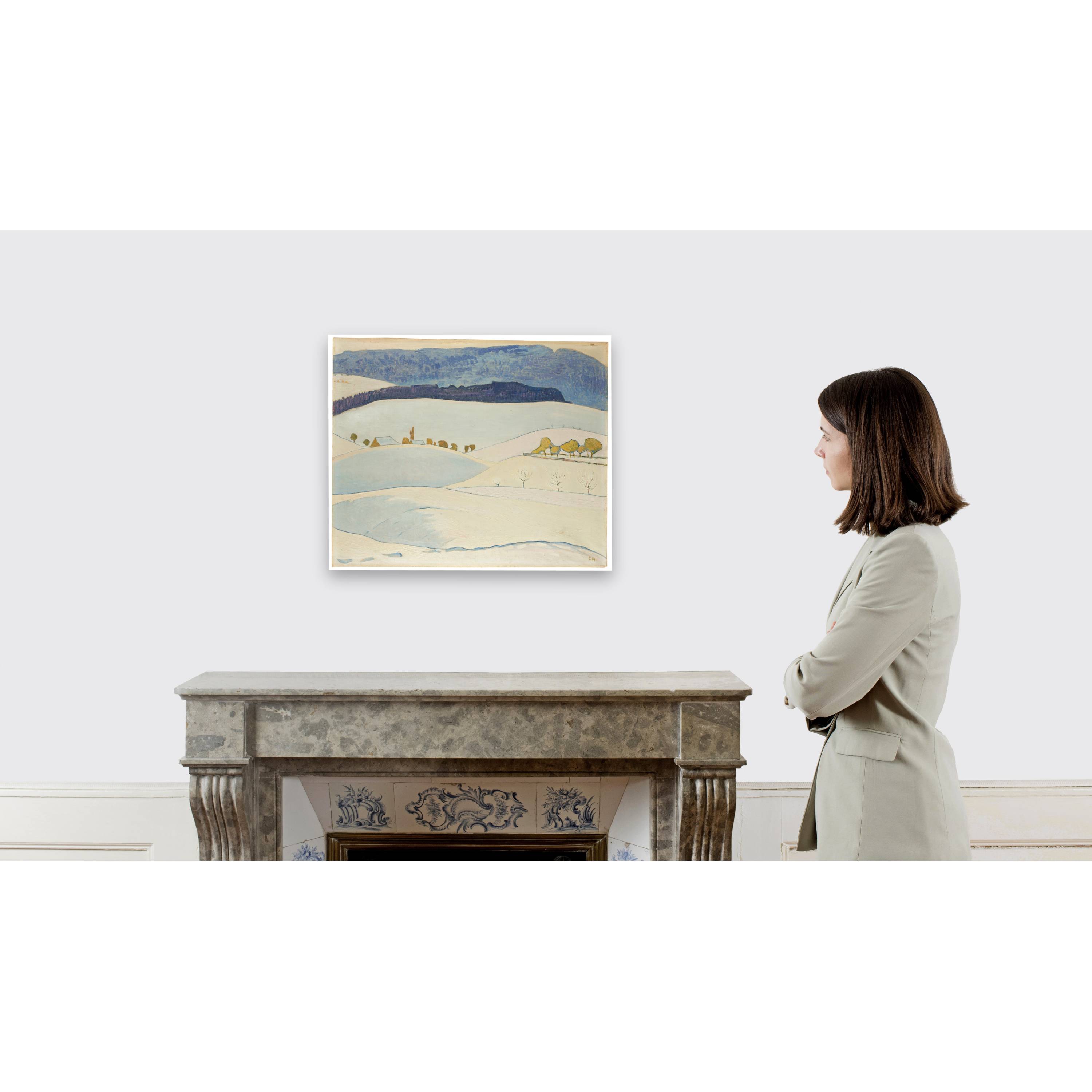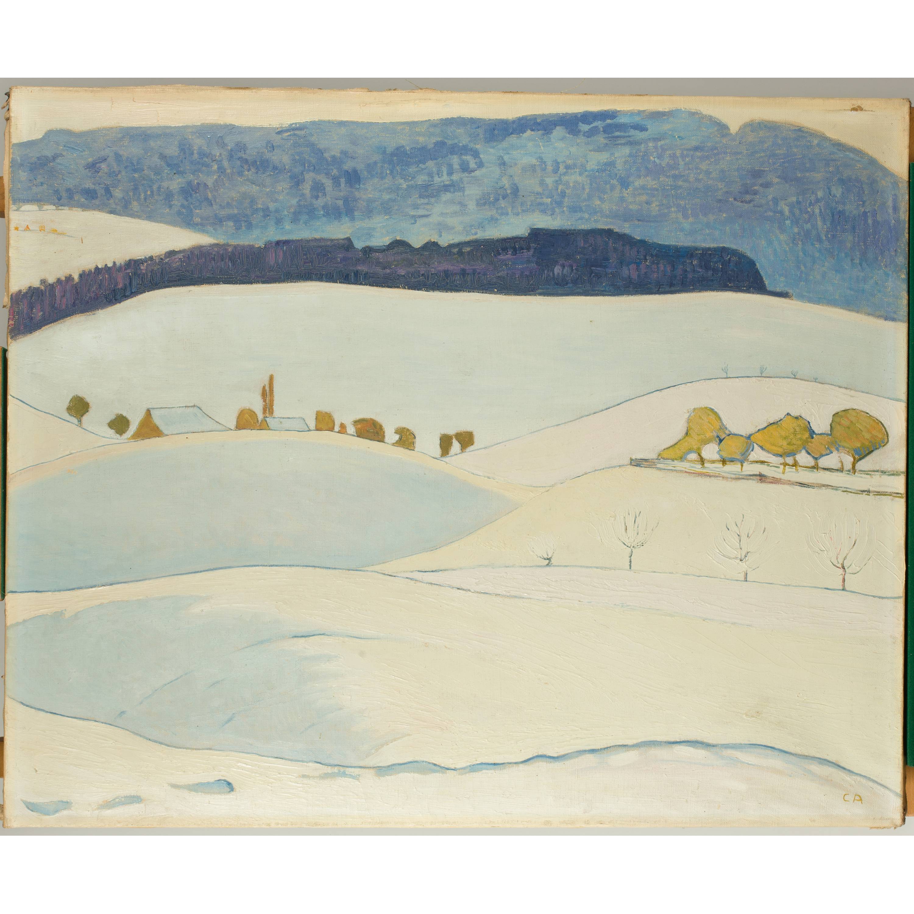 The present undated painting from 1908 differs only minimally from the original: Amiet added another small bare tree in the middle ground, thus increasing the mightiness of the snowy landscape. The almost monochrome composition of the picture with the horizon line far above allows the snowy expanse with the curving hills to unfold across the picture. The atmospheric and tranquil winter landscape with its reduced colour palette of ochre and pink, the fine gradations from off-white to light to dark blue, is of great luminosity