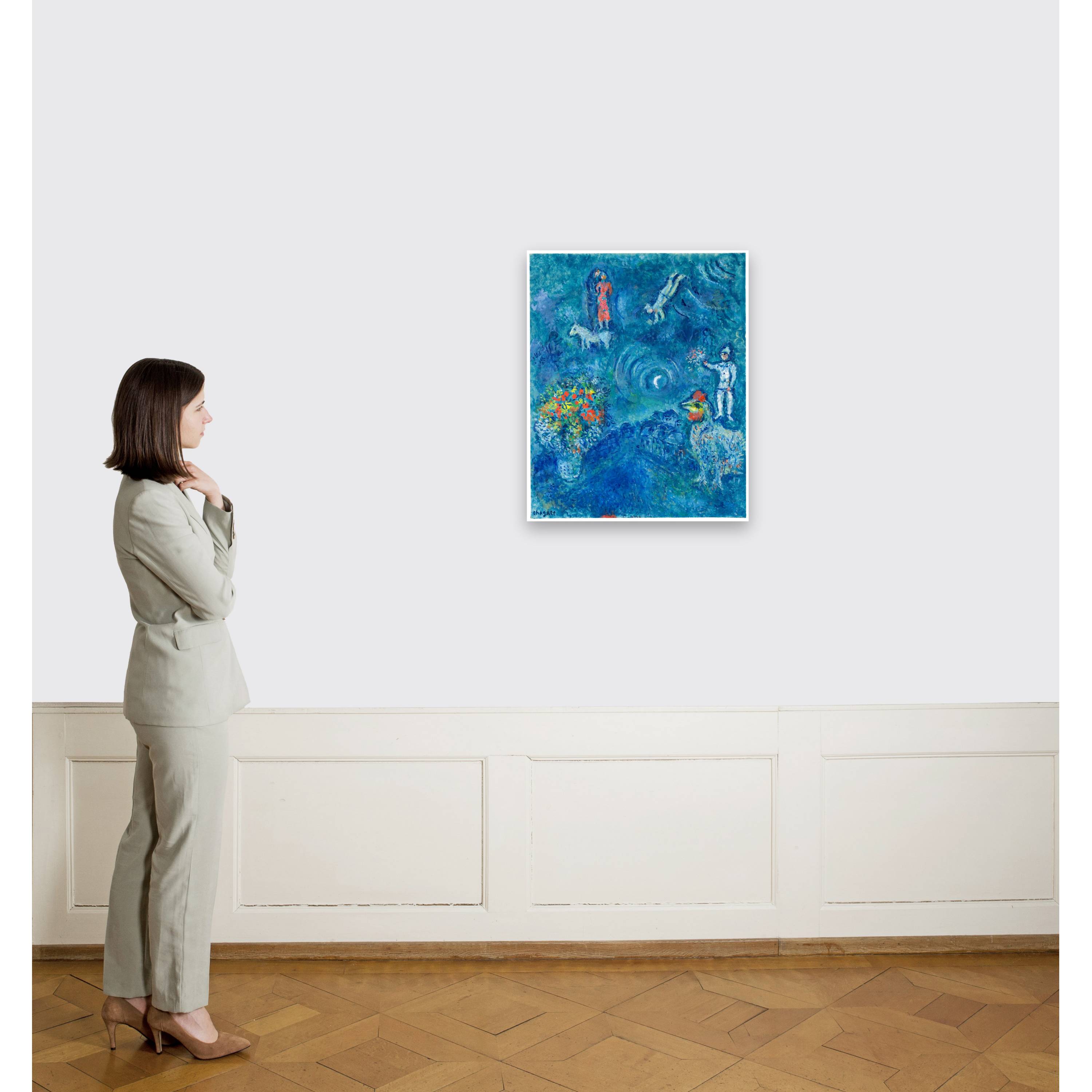 The painting offered here represents a very special vision of the painter, peppered with elements characteristic of Chagall from different times and places: a pair of lovers, the rooster, the mystical animal, the bouquet of flowers on earth and in the sky, artists, the painter on the left as a witness and the moon in the centre - all symbols of life as a stage for the artist. And the whole scene takes place on or above the village square of his native Vitebsk. A rich depiction of life, immersed in wonderfully vibrant blue tones