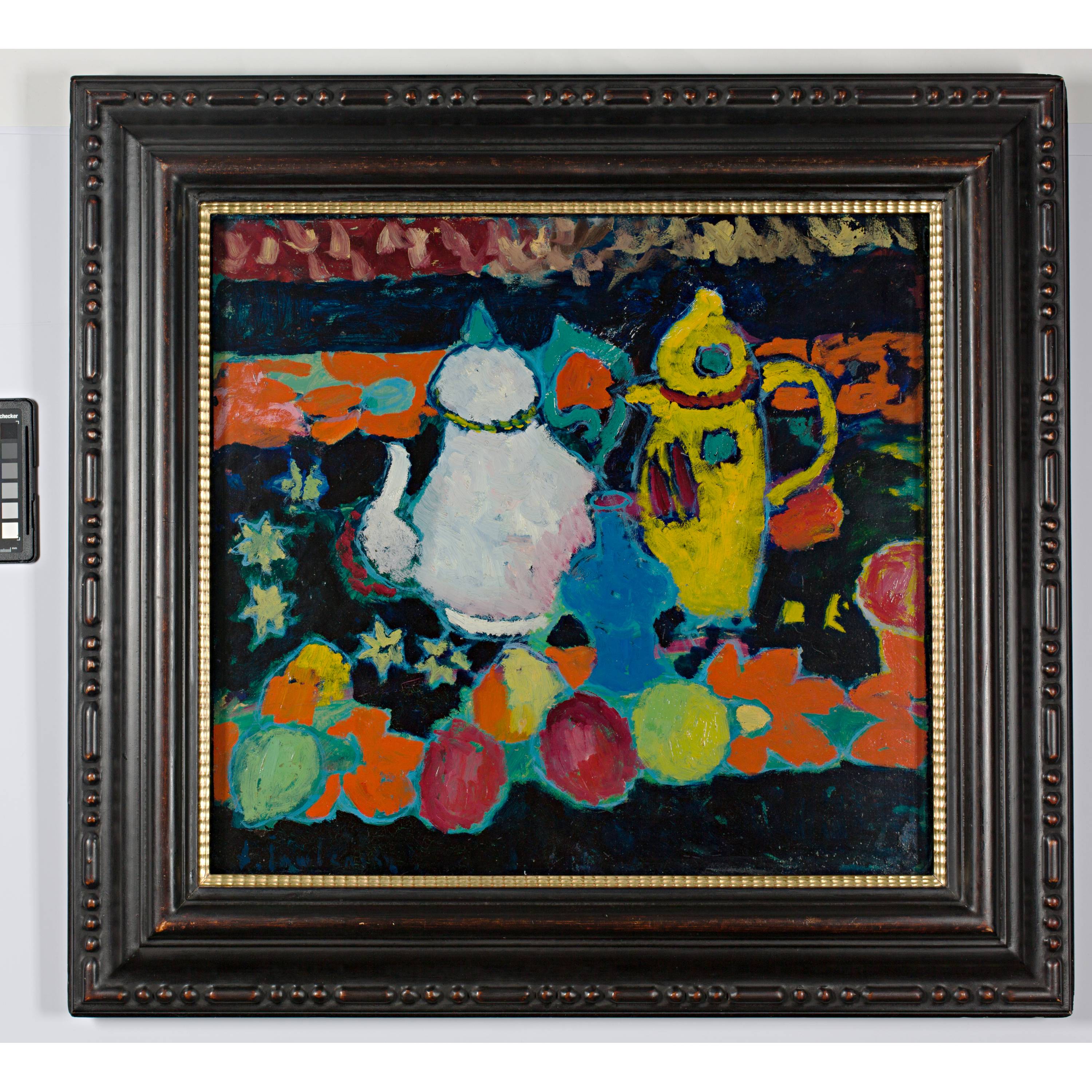 Das vorliegende Gemälde ist mit seiner Komposition und Bildanlage und den nuanciert gesetzten Farben sicher eines der wichtigsten Gemälde aus dieser Zeit überhaupt. Es lässt sich darin auch Jawlenskys klarer «Zeichenstrich» in der Malerei erkennen, der später zu einem Charakteristikum seiner Arbeiten werden wird. Es ist ein sphärisches Bild, die akkurat gesetzten Kannen und Früchte verschmelzen mit der Tischdecke zu einem eindrücklichen «Ganzen». Die Importanz dieses Stilllebens für den Künstler belegt auch die Tatsache, dass er es für sich behalten hat, und es nun erstmals zum Verkauf angeboten wird
