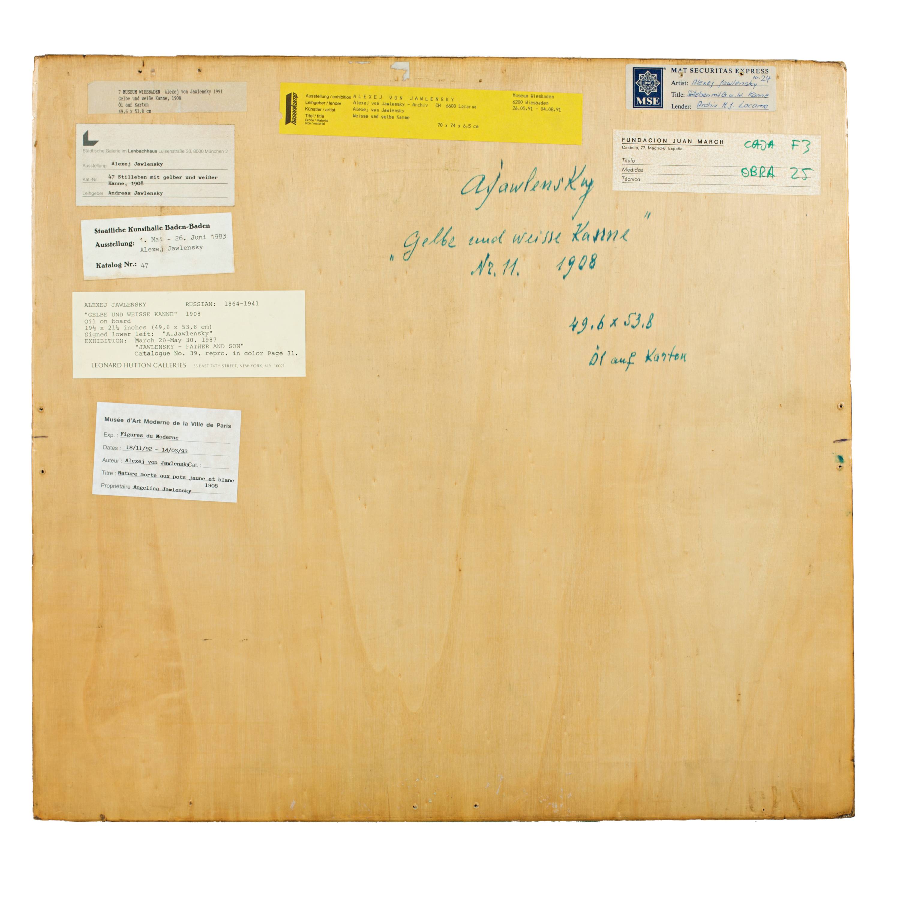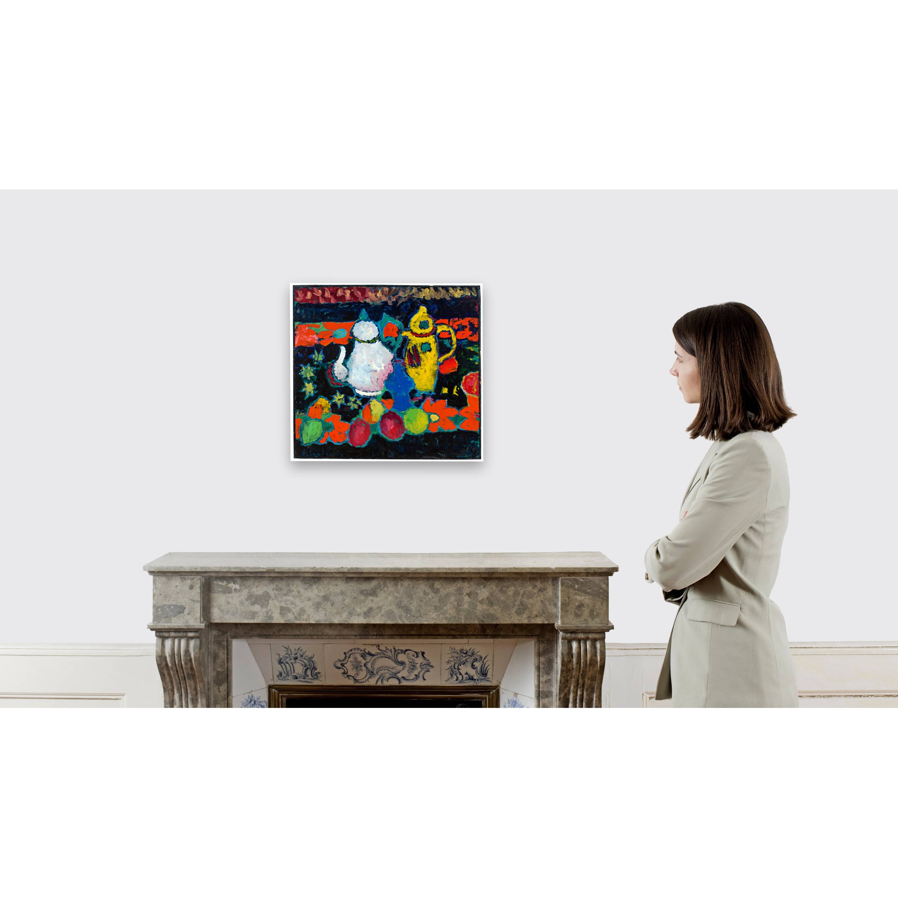 The present painting, with its composition and composition of the picture and the nuanced use of colour, is certainly one of the most important paintings of this period. It also reveals Jawlensky's clear "stroke" in painting, which would later become a characteristic of his work. It is a spherical picture, the accurately placed pots and fruits merge with the tablecloth to form an impressive "whole". The importance of this still life for the artist is also evidenced by the fact that he kept it for himself and that it is now being offered for sale for the first time