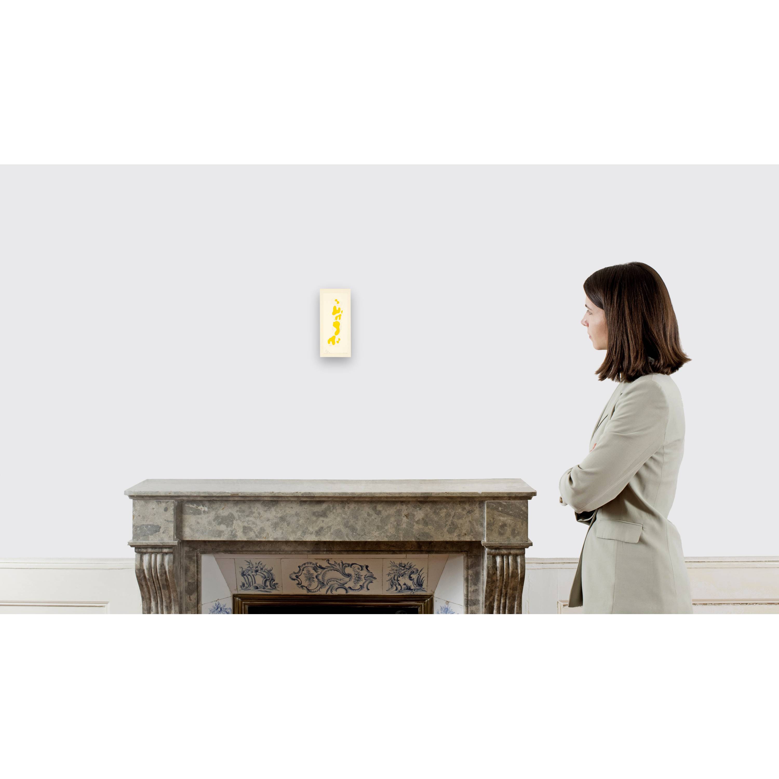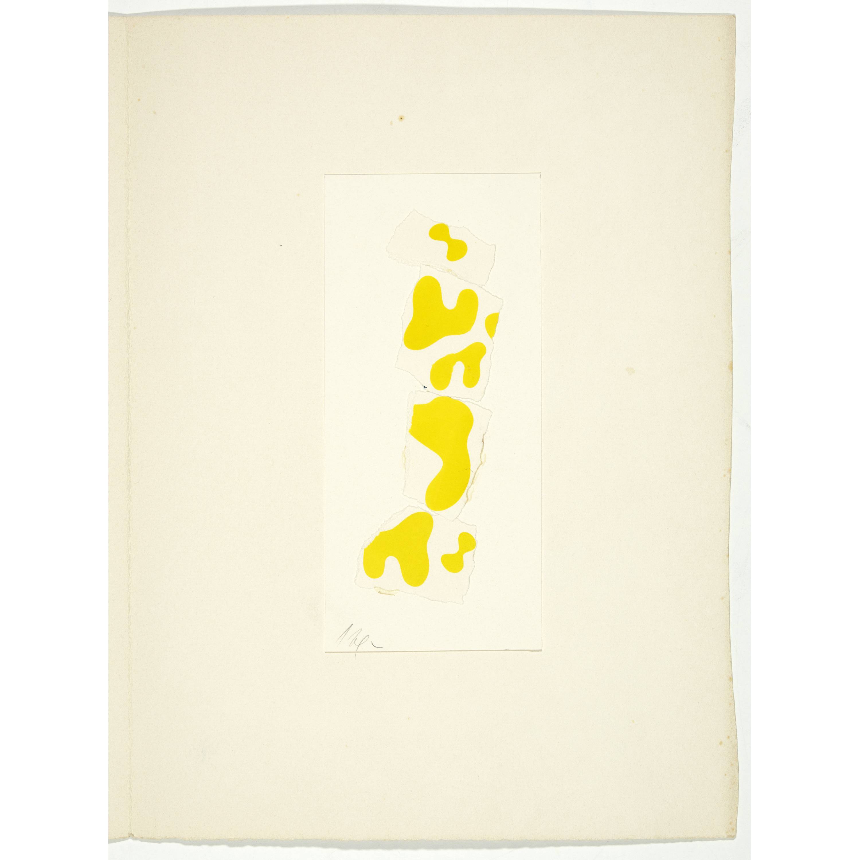 Collage with yellow figures on torn paper, glued to backing and pasted in a double sheet