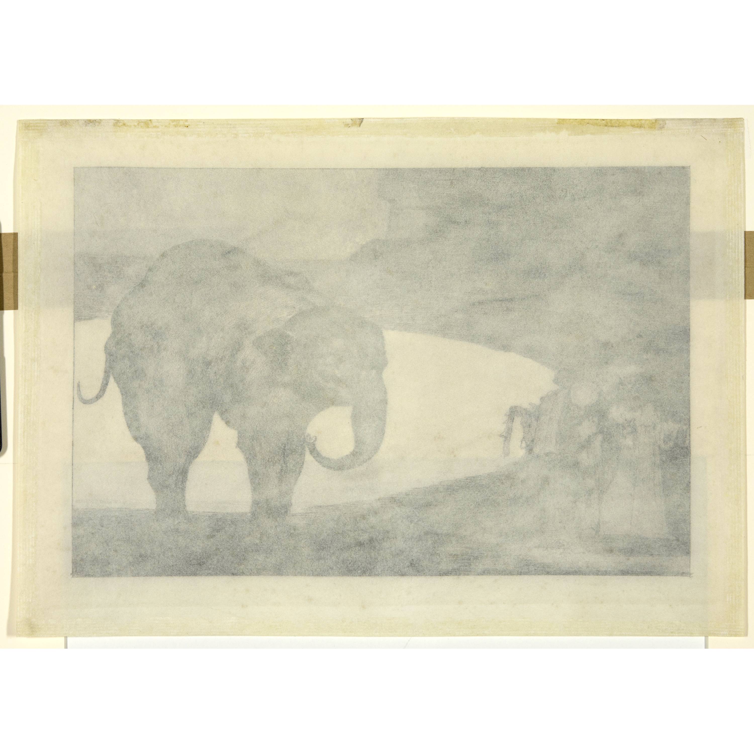 Very nice deep black, transparent print on vellum, before all inscription. Proof, in very nice condition, traces of old hinges in the upper outer paper margin on the reverse side.