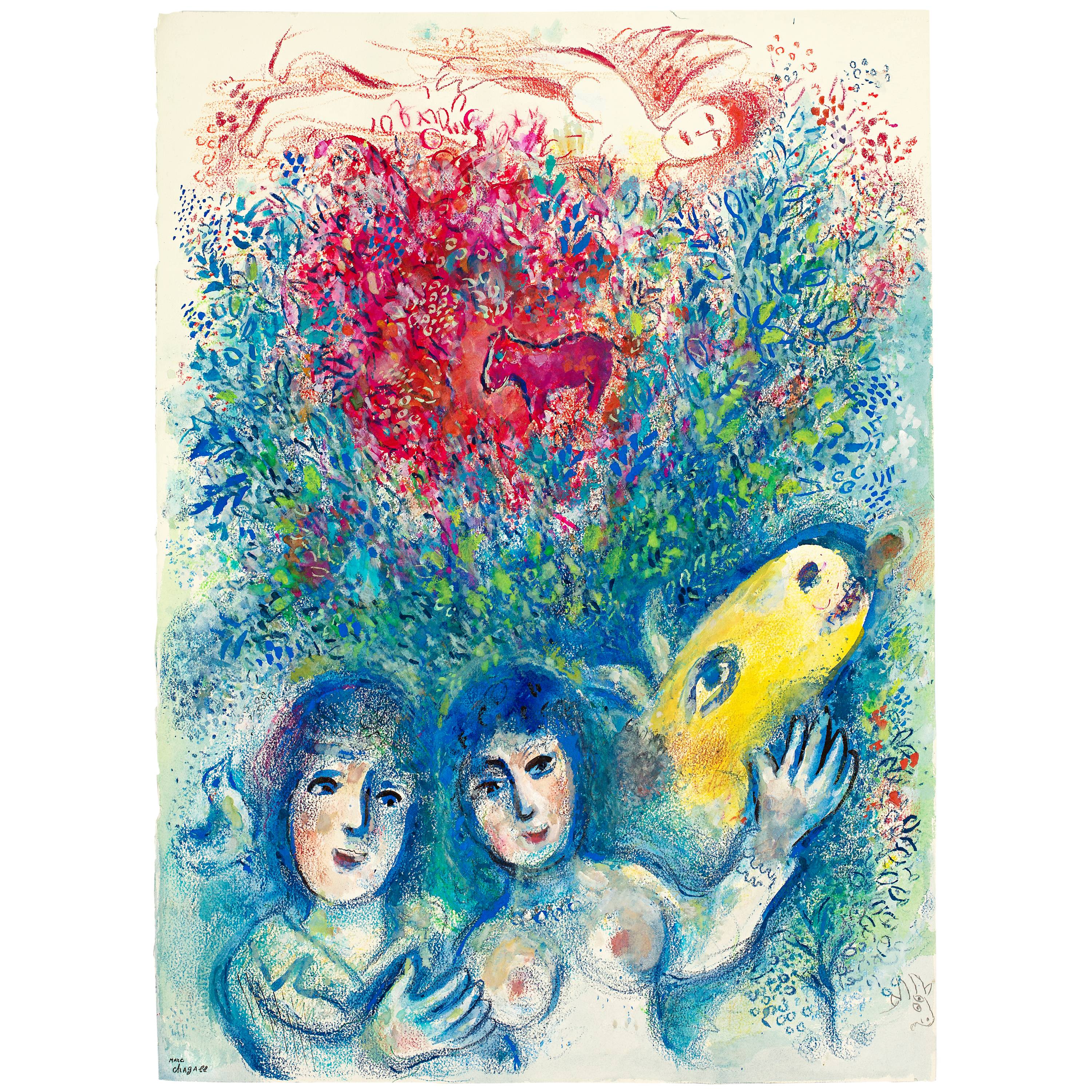 An incredibly dense, vibrant composition. The lovers stand beneath the lush Tree of Life, waving to the viewer as if to involve us all in the action. The mystical animal, the creativity, seems to grow out of the lovers, while the angel floating above the tree frames the scene with happiness and blessings. The composition is a veritable firework display of colour, applied almost pointillistically and it demonstrates Chagall’s distinctive ability to capture movements, emotions and the ambiance of the pictorial space using a range of expressive techniques