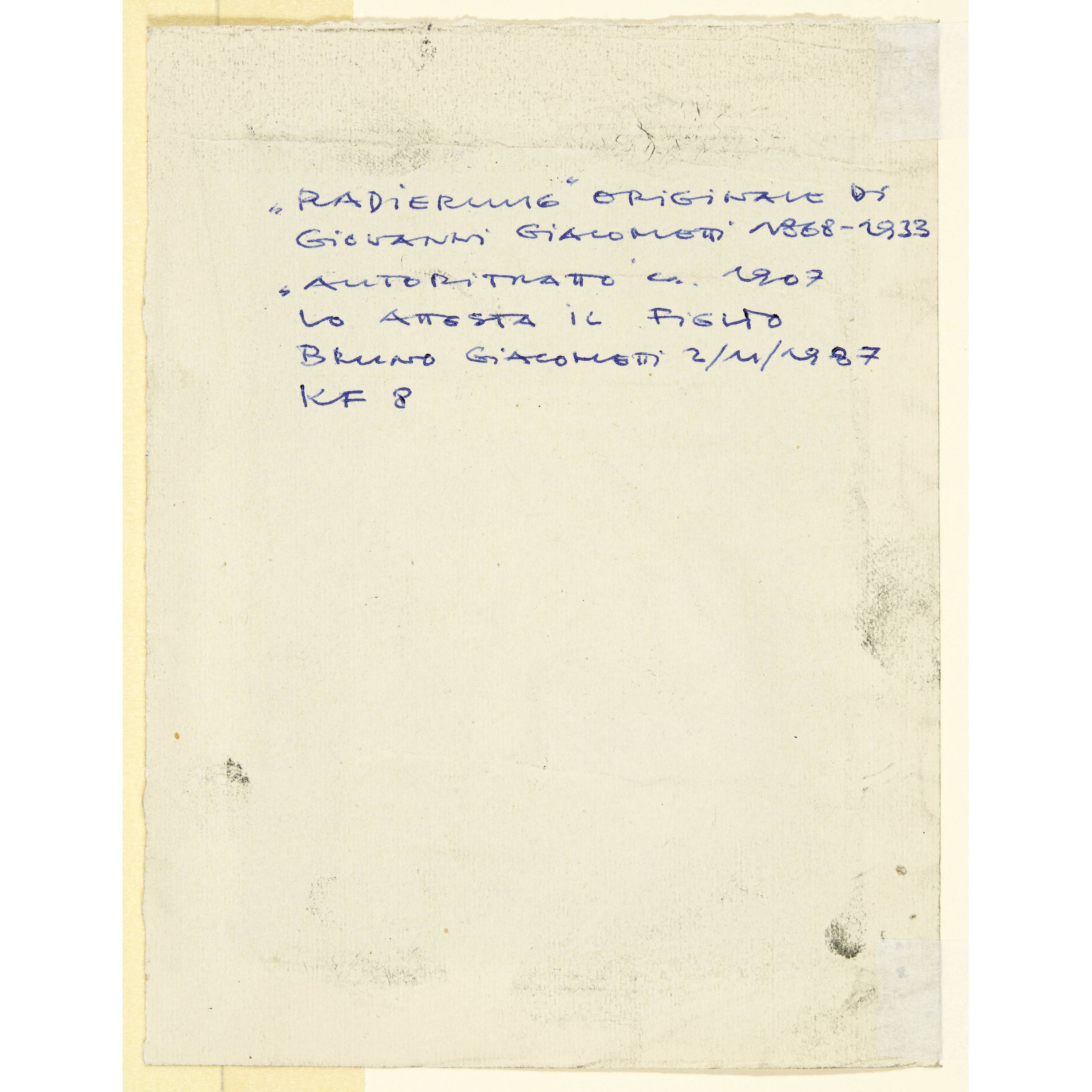 Stauffer 11. Rückseitig mit der handschriftlichen Echtheitsbestätigung von Bruno Giacometti, dem Sohn des Künstlers, datiert vom 2.11.1987
