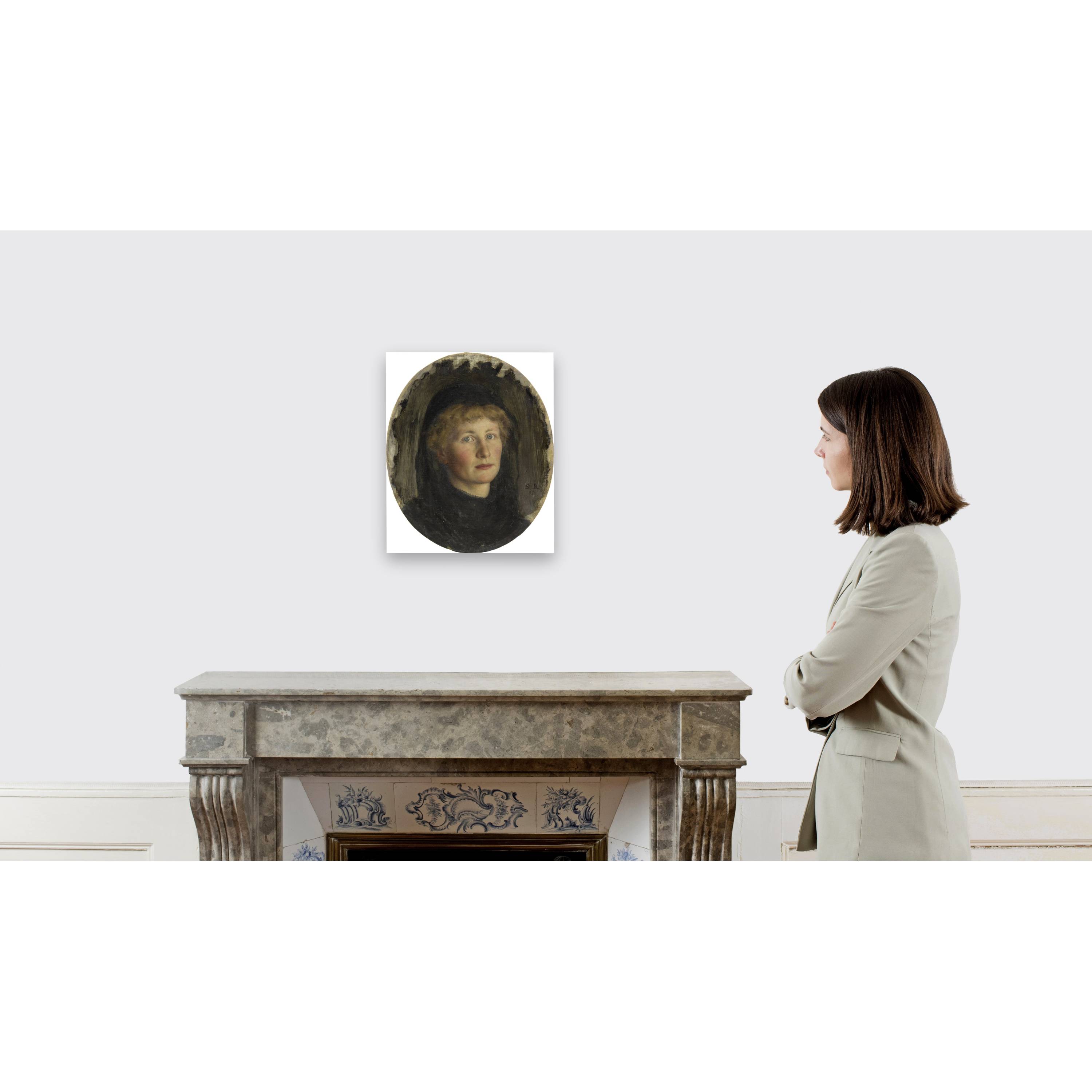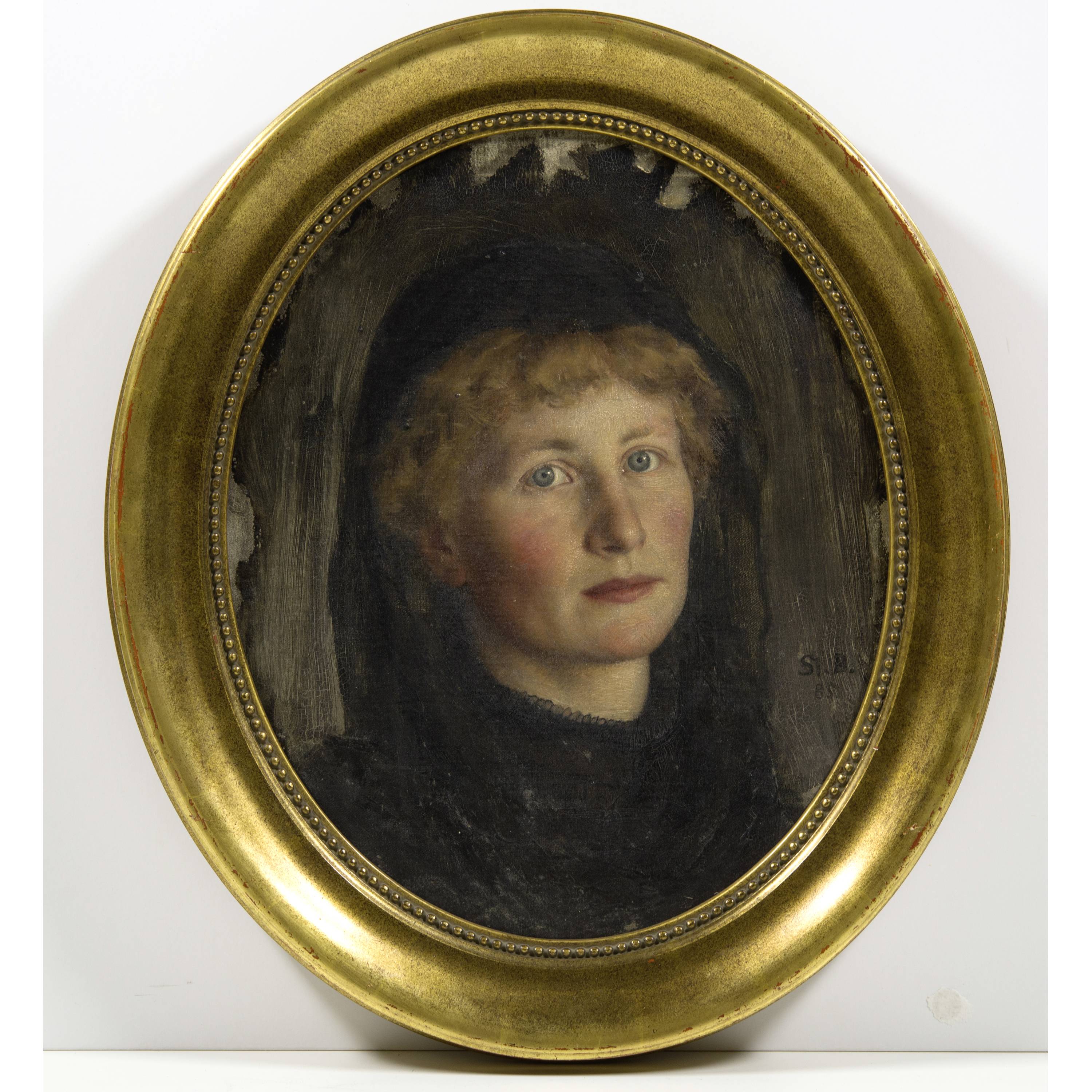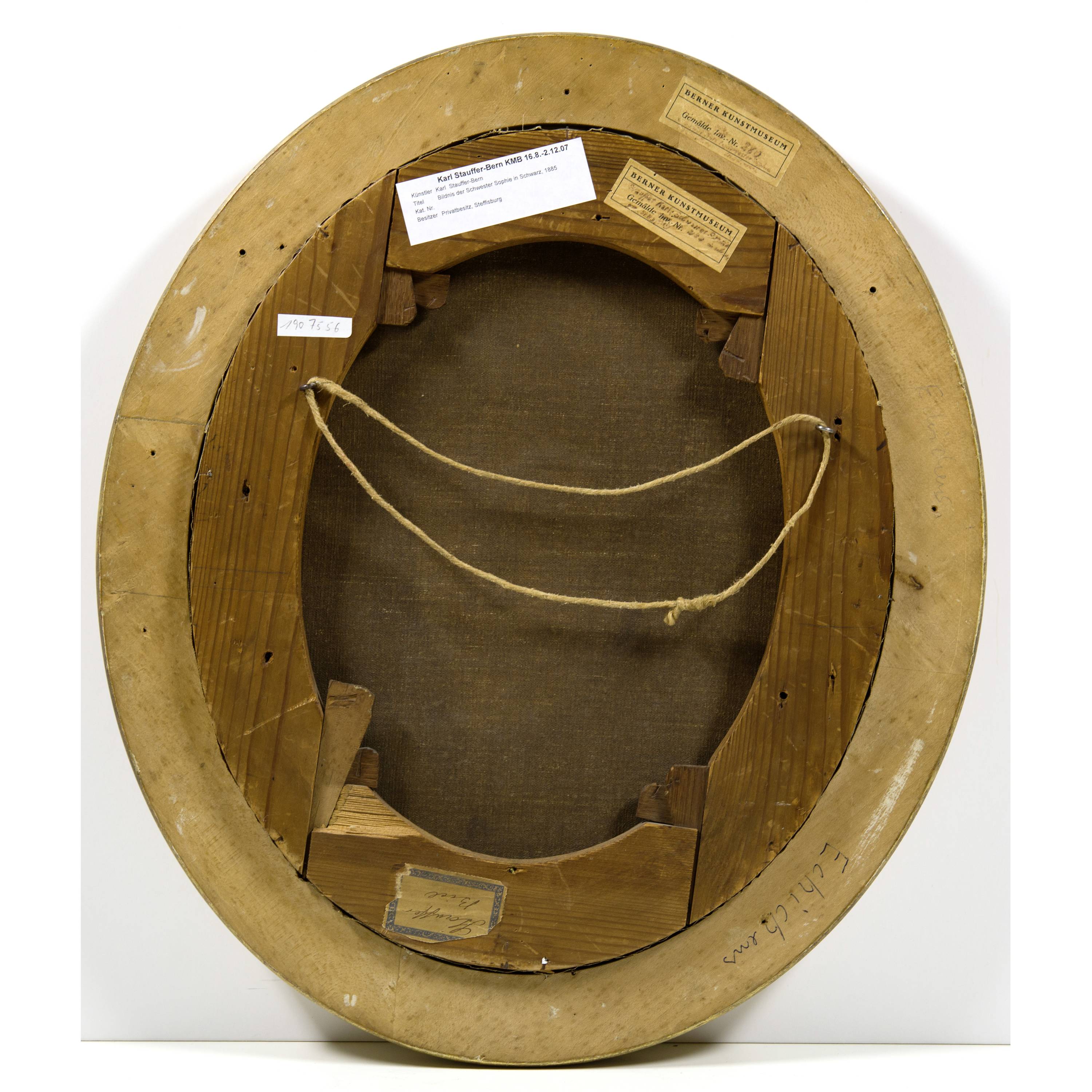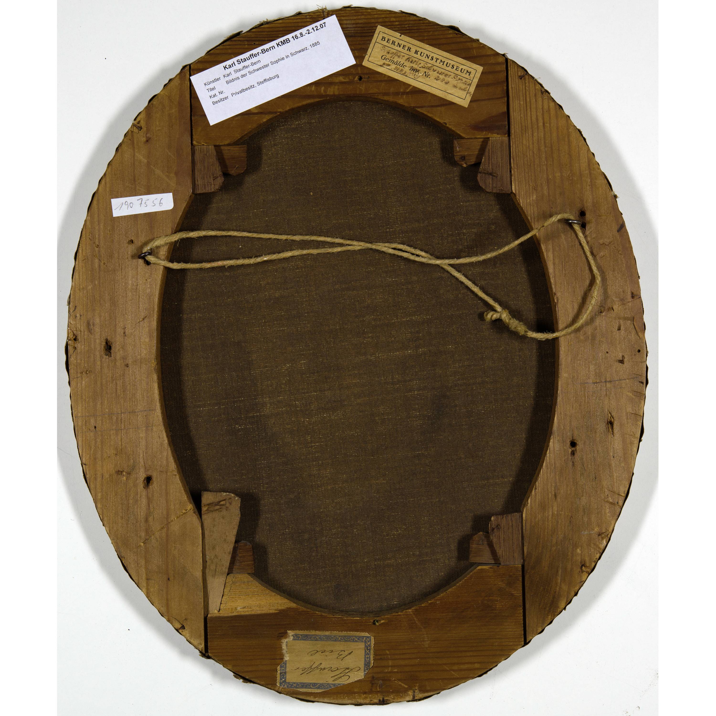 The sitter is the artist's eldest sister Sophie Stauffer, born in 1858. He portrayed her in 1885 with a black veil after her father had died after a long depression on 13 July 1885 in the Waldau Clinic. The painting, which was not yet completed at the edge, was probably trimmed to oval format and fitted into a ready-made frame only after Stauffer's death (from: exhibition catalogue Bern 2007, pag. 158)