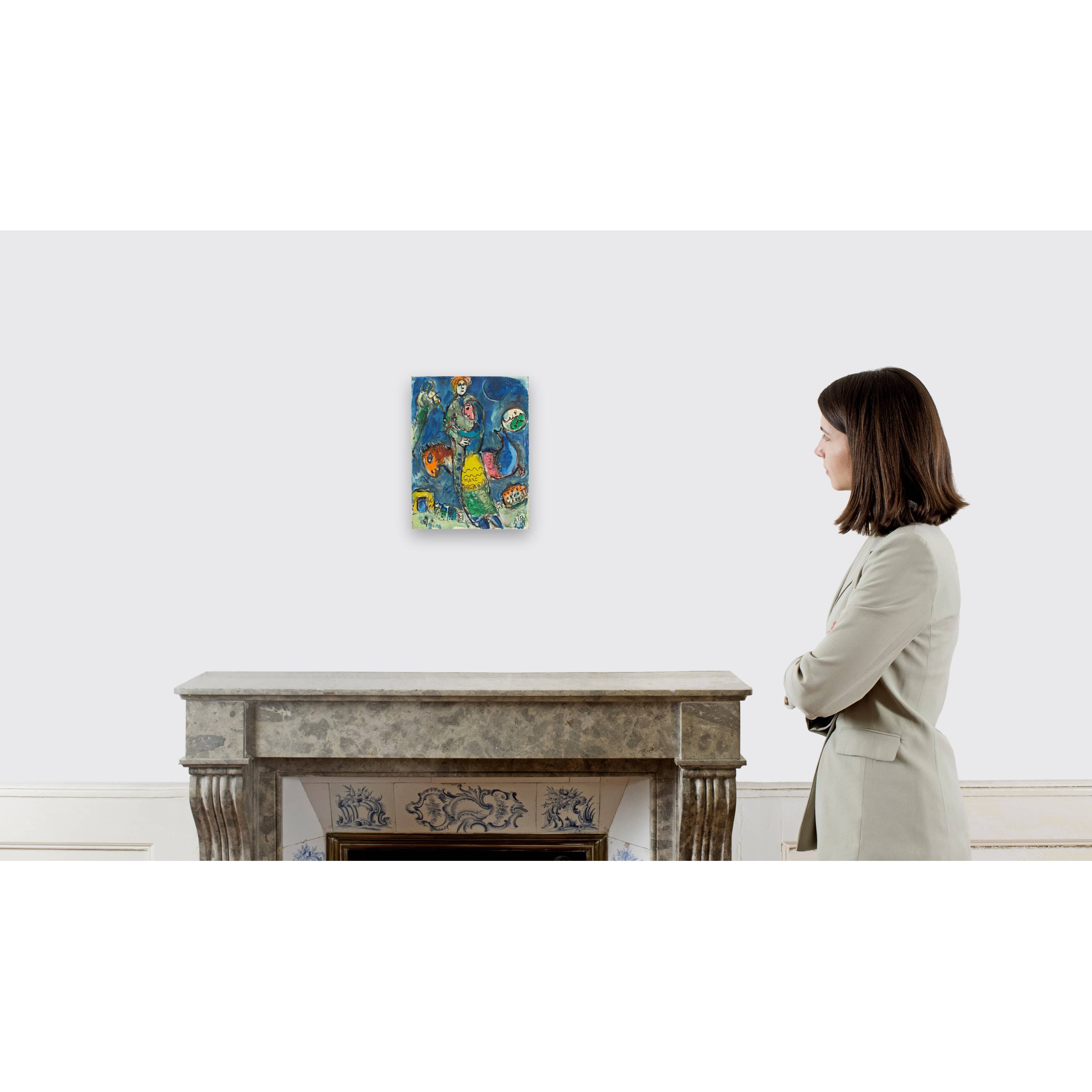 A pair of intimate lovers with a bouquet of flowers floats above Paris, on the left a violinist, the mystical animal, symbol of creativity, peers mischievously out from behind the lovers. A very inspired depiction in accentuated colours. Throughout his life, Paris was one of the most important places for Chagall to live and work. With the painting of the ceiling in the Opéra Garnier from 1963 to 1964, he also created one of the most impressive works there. The opera can also be seen in many works from this period; here it is on the right