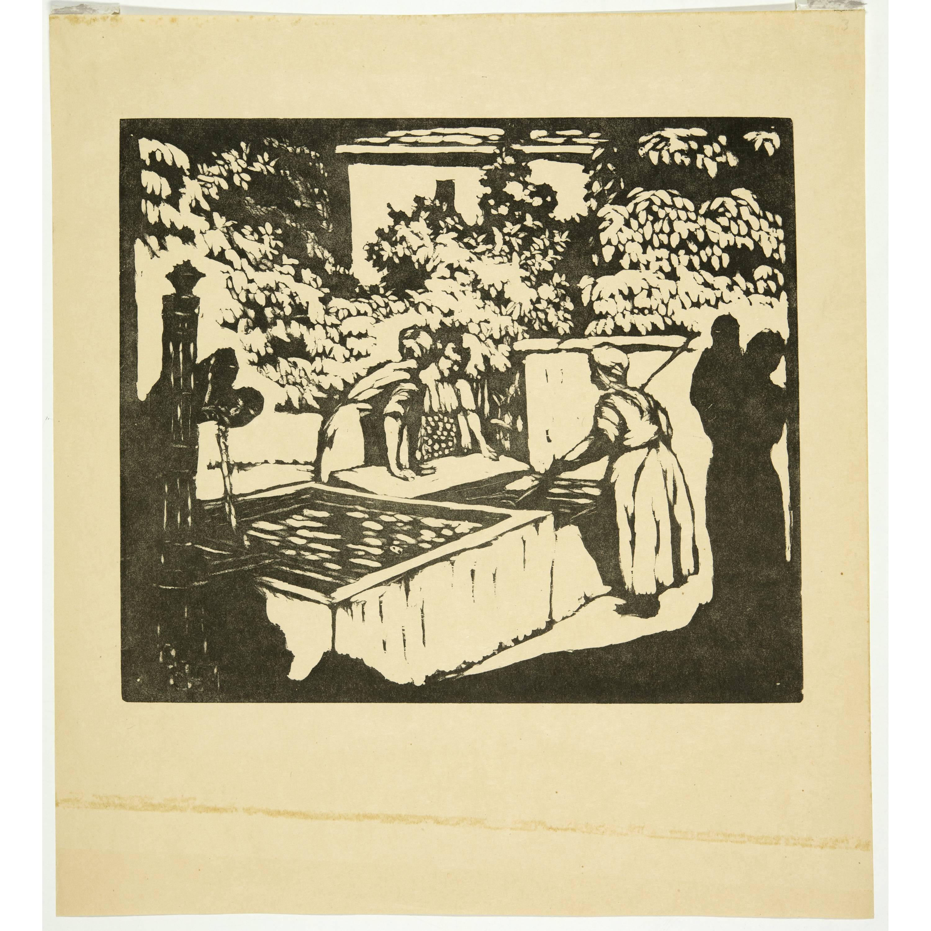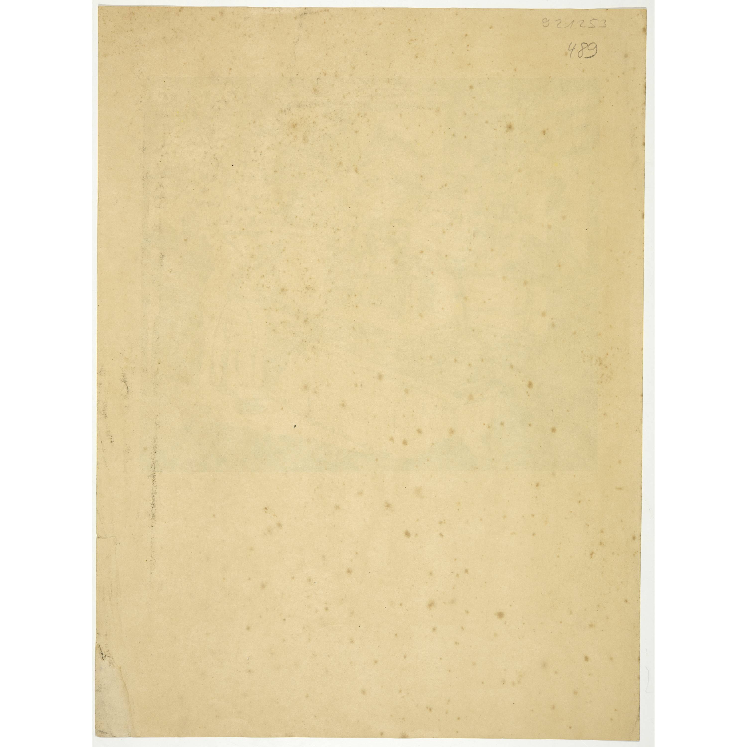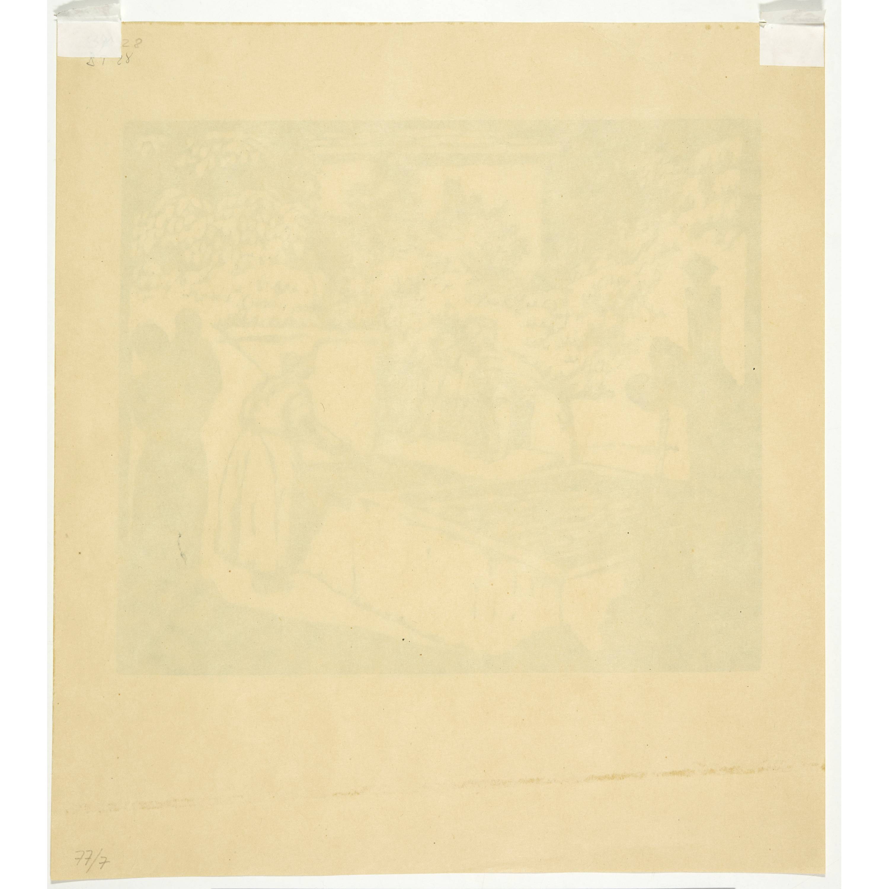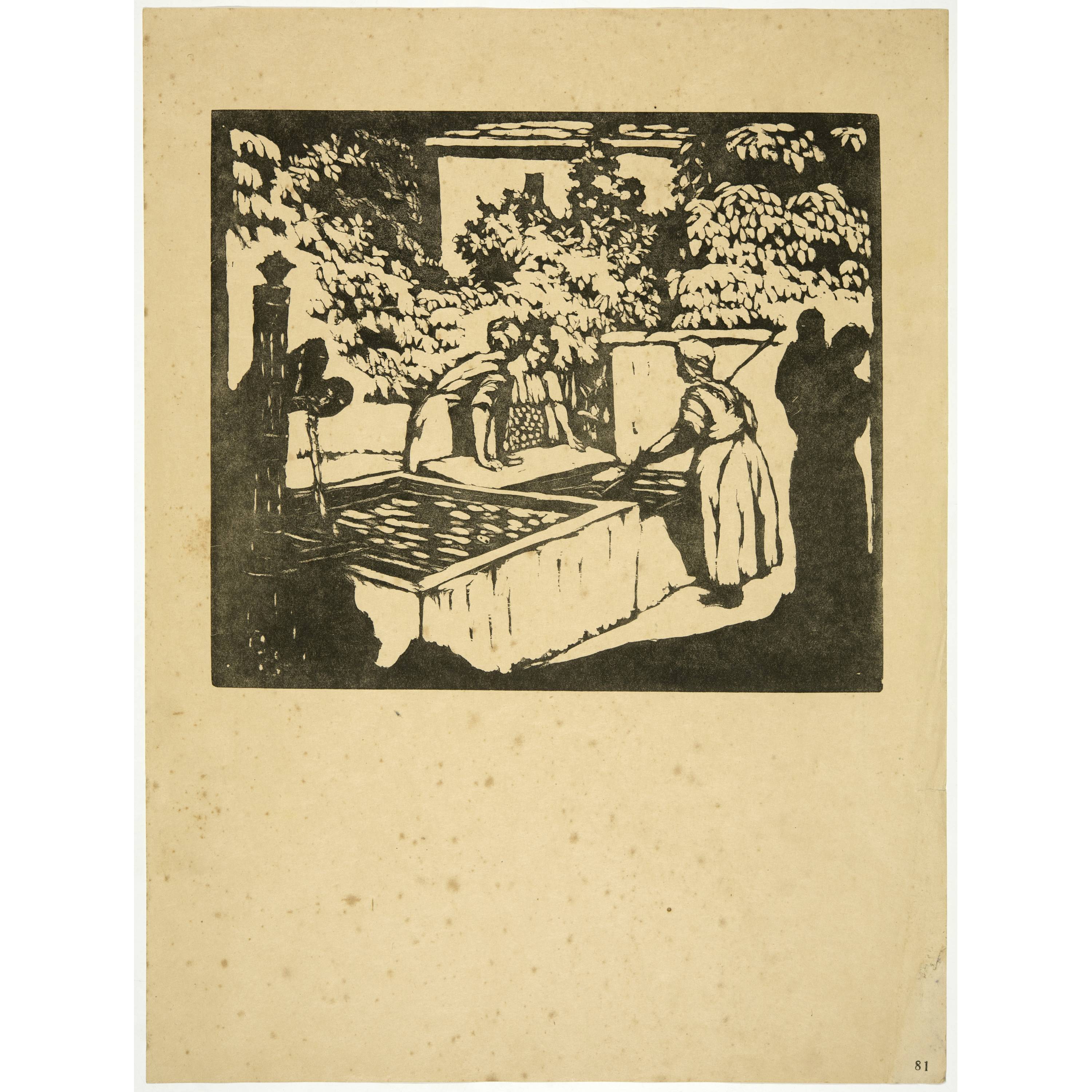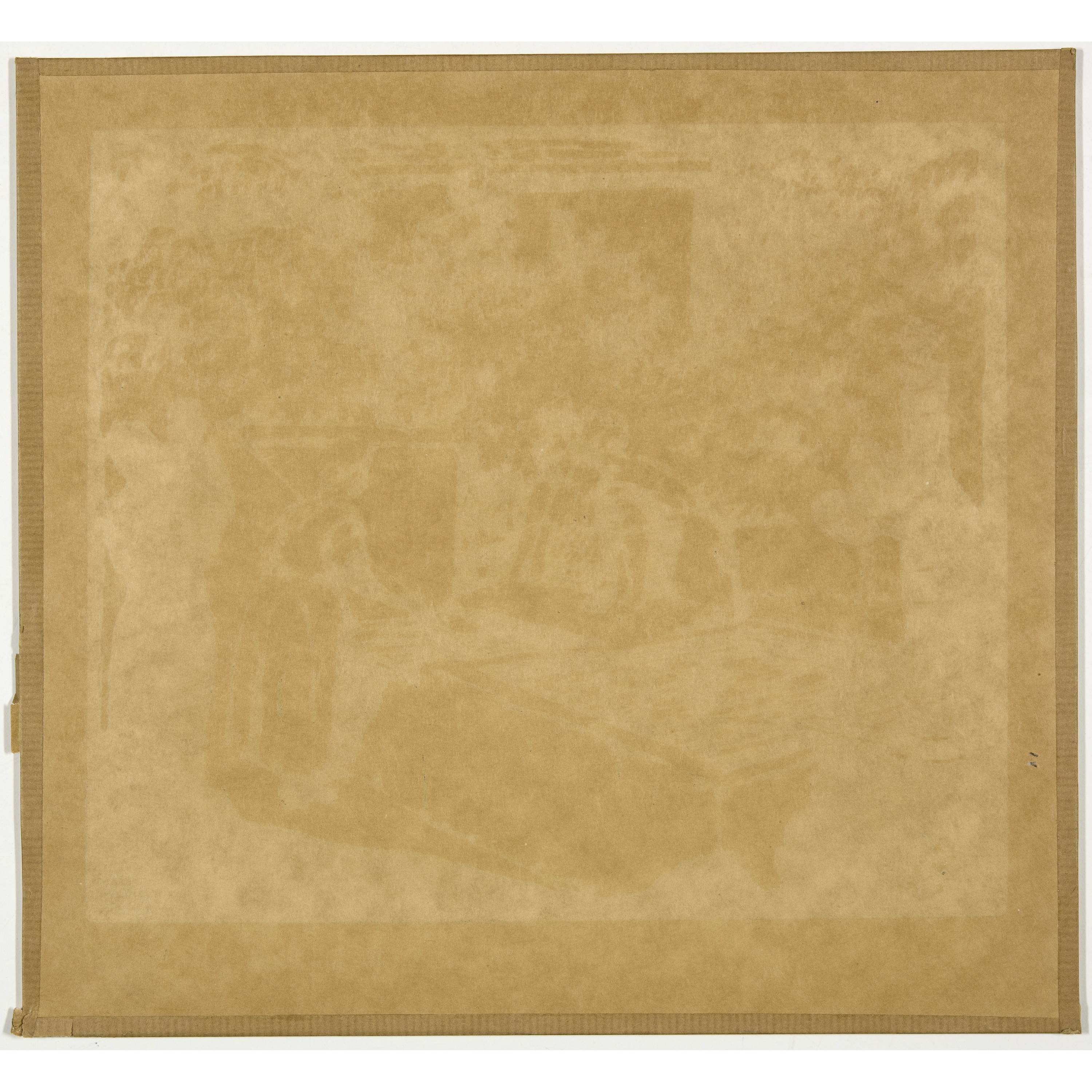 Dabei: 2 weitere Abzüge: Selbes Blatt. Auf Similijapan. Unten rechts mit der gestempelten Nummer "81". 40x30 cm, Blattgrösse. Stockfleckig und unten rechts mit zwei Einrissen. – Selbes Blatt. Auf Similijapan. 33,2x30 cm, Blattgrösse. In der oberen linken Ecke mit Knicken, unten mit Rückständen eines Klebestreifens. - Zus. 3 Blatt