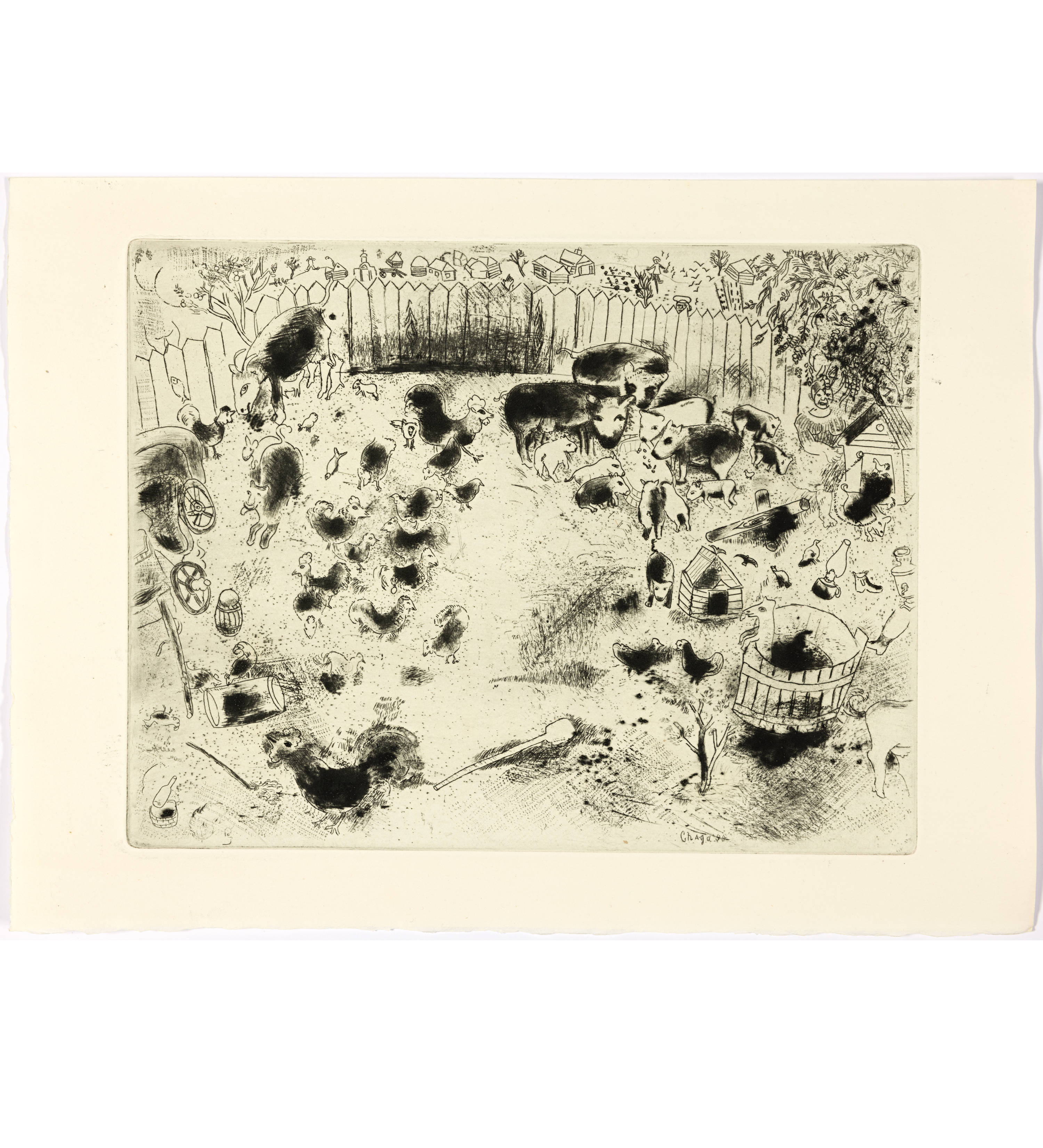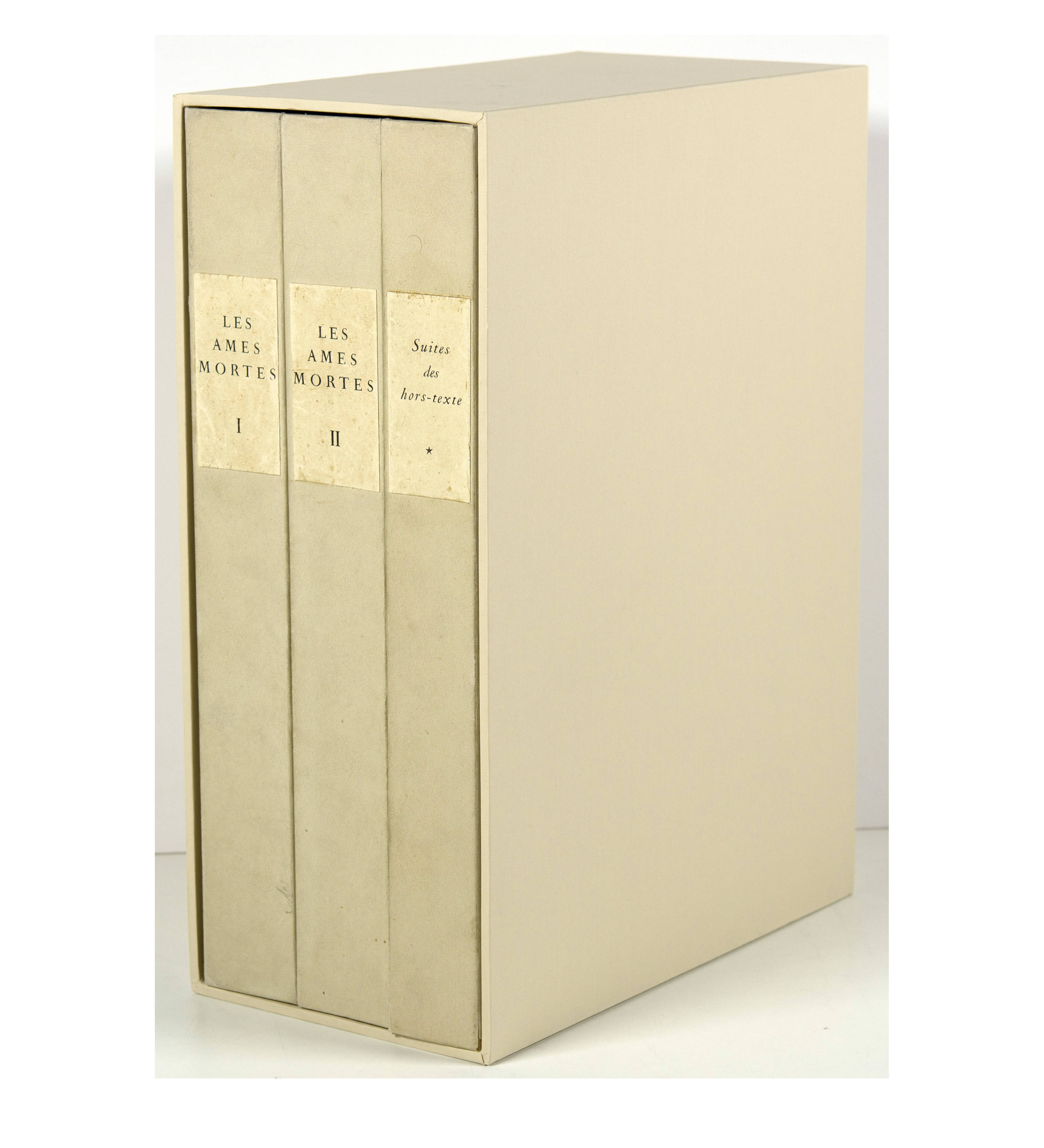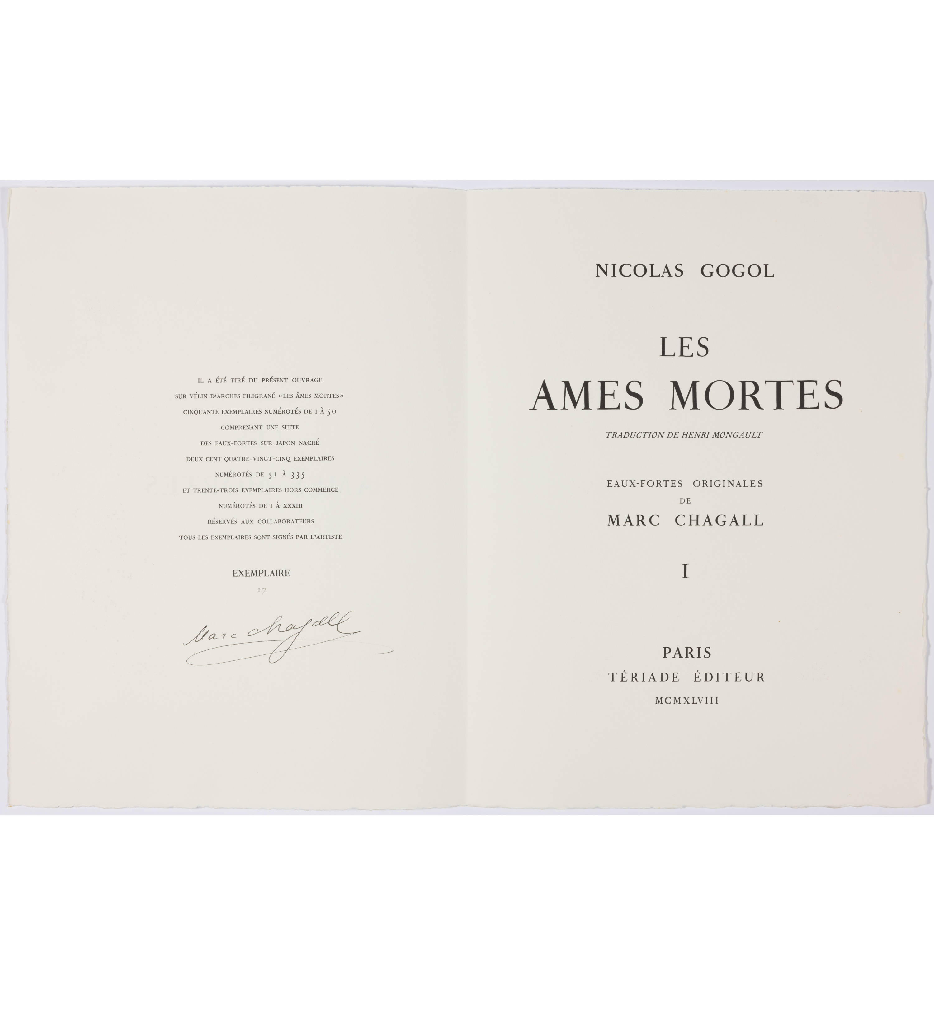 Im Impressum vom Künstler in Tusche signiert "Marc Chagall" und mit der Nummer "17" als eines der 50 Vorzugsexemplare (Gesamtauflage 368 Exemplare) ausgewiesen. Mit 96 Radierungen lose den zwei Textbänden beiliegend und mit 22 radierten Initialen und Vignetten. Zusätzlich mit der Suite der 96 Radierungen, auf "Japon nacré" gedruckt, in einem dritten Band lose beiliegend