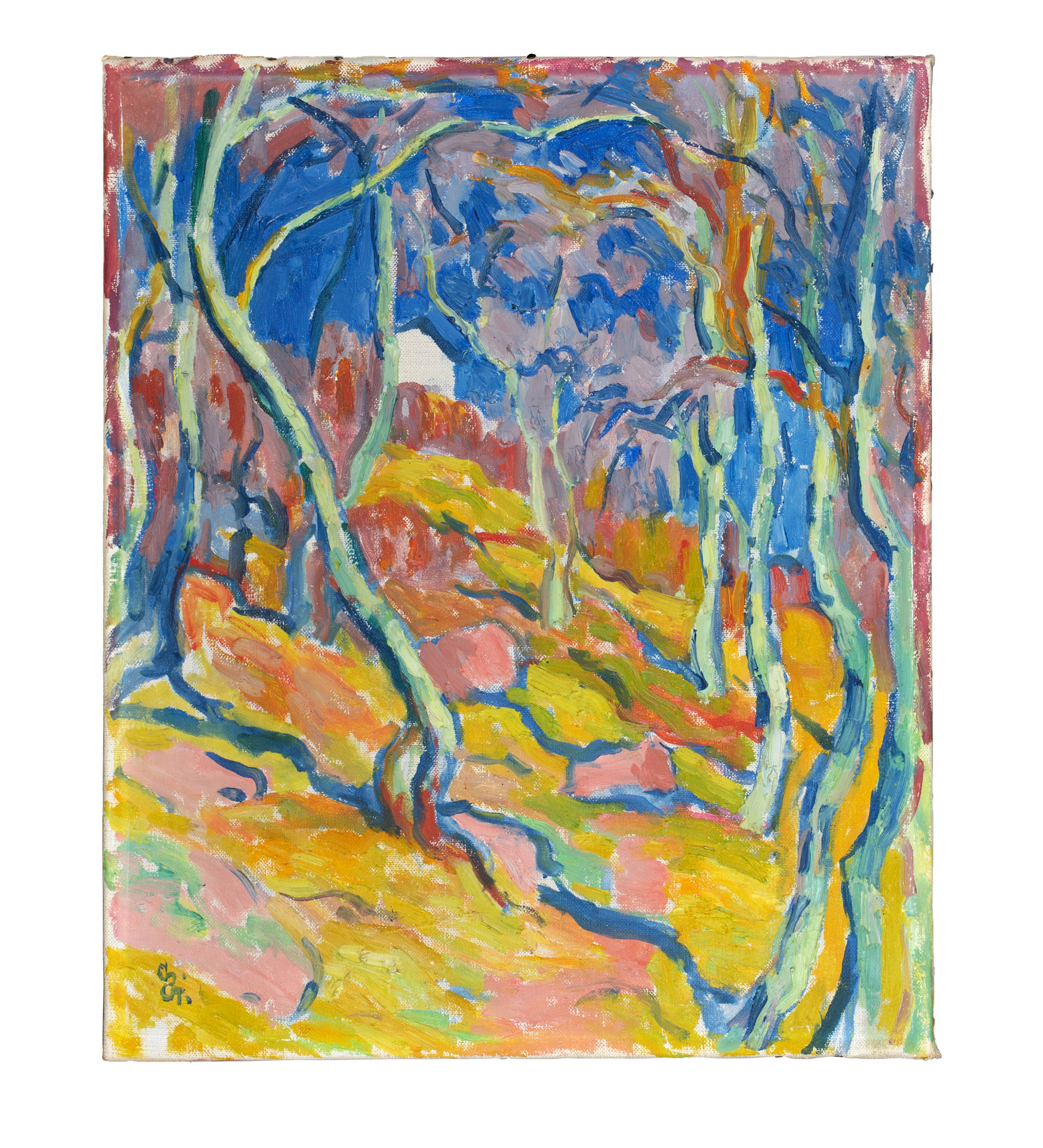 Charming forest scene in Bergell, whose title in the catalogue raisonné "Waldinneres" can be specified by the enclosed letter from Giovanni Giacometti to Etienne Perincioli, dated 11 June 1921, in "Paesaggio di Bregaglia". Etienne Perincioli (1881-1944), a sculptor in Bern who had immigrated from Italy, received this work from the artist in exchange for another commitment. Etienne Perincioli is the father of the Bernese sculptor Marcel Perincioli (1911-2005). The work is accompanied by a letter card with envelope, inscribed on both sides and signed by Giovanni Giacometti