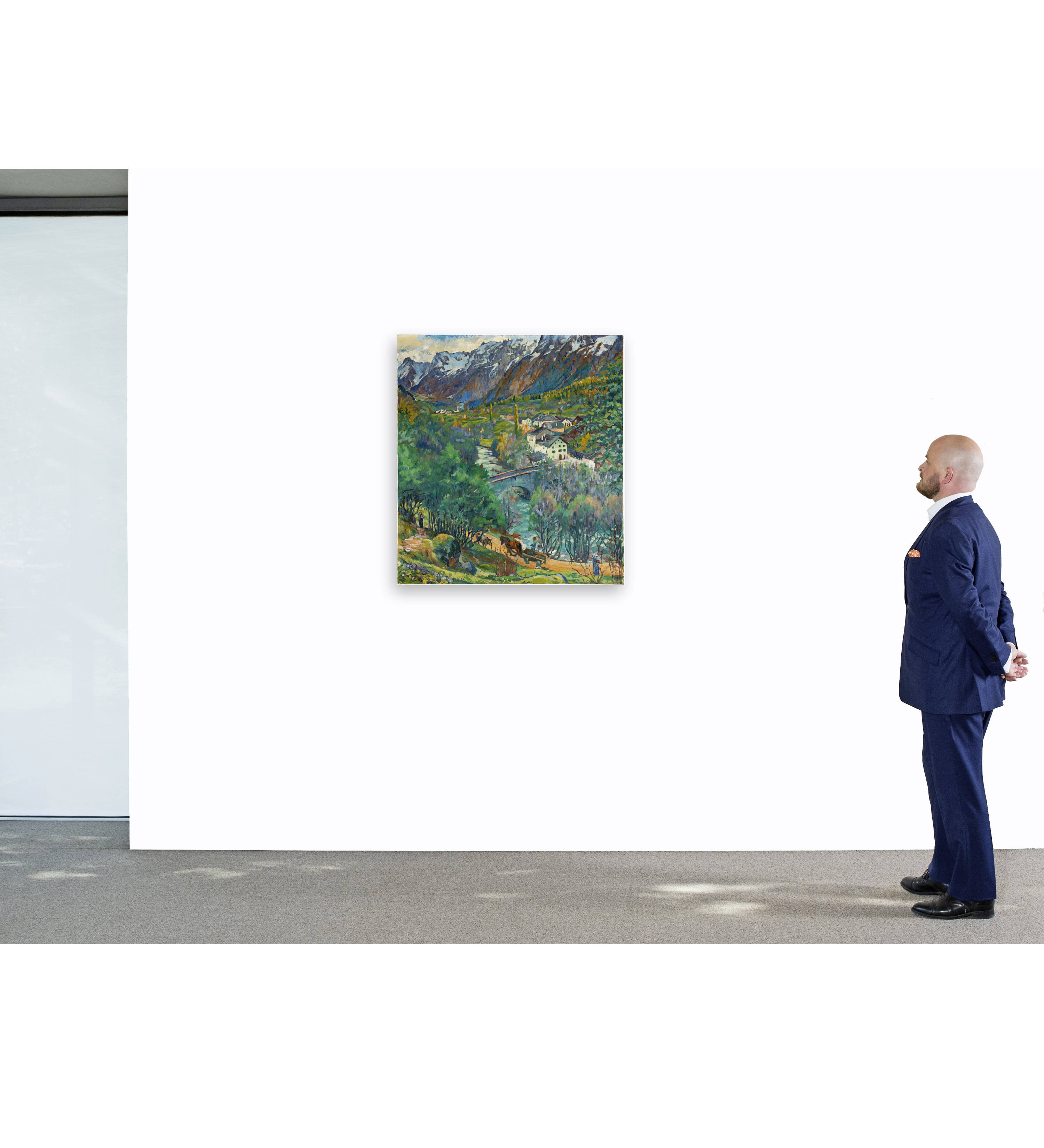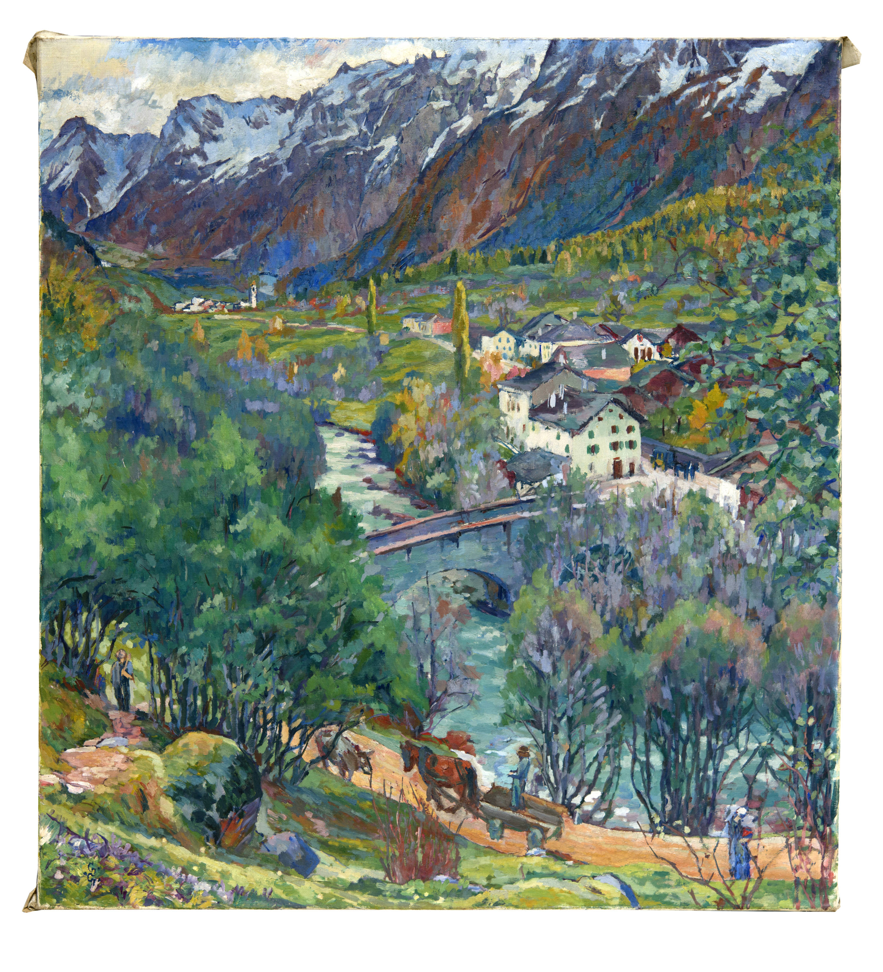 The painter's location is on the steep slope above the road and the river Maira. The view from this height allows Giacometti an overview of the valley floor of the central Bergell. In the centre of the painting is the village of Stampa, the artist's home, with the bridge over the river Maira. The small village with its sturdy stone houses, small stables and orchards lies on the left bank of the river. The house that looks very dominant in the picture, with a small square at the bridgehead, is the "house at the bridge", the "Piz Duan" inn, which in addition to the hotel and restaurant also housed a shop, the post office and a telegraph. In 1927, this house was partially washed away by the floods. It is the artist's birthplace, where he also spent his childhood. Somewhat hidden by this building, behind it on the opposite side of the street, is a house where Giovanni Giacometti lived with his wife Annetta and their children from 1906. The artist's studio, where he worked from 1906 onwards, is located directly adjacent to the house on the same side of the street. On the square in front of the "Haus an der Brücke", the village centre, a stagecoach stands ready. Further down the road towards Promontogno, somewhat hidden by the trees, is the "Ciäsa Granda", which has been restored and now houses the Bergell Valley Museum. In the background you can see the village of Borgonovo, the birthplace of his son Alberto, born in 1901, with the church of San Giorgio, built in 1694, just outside the village. Most of the Giacometti family members are buried in the cemetery. The graves of Giovanni and Annetta, Alberto, Diego and Bruno, and Augusto are buried there. The road continues upwards to the left of the picture towards the Maloja Pass, which leads into the Engadine. In the background of the painting the steep granite mountains of the Bergell Alps can be seen. This painting is Giacometti's most comprehensive depiction of the Bergell landscape. It is not only a pure depiction of the landscape, but is also very narrative in the picture. Thus Giacometti shows the waiting stagecoach in the village square, a farmer returning home on the road with his horse-drawn cart, two women who have just met him on the road, a cow running down to the road, and a farmer with an axe on his shoulder climbing a small path at the bottom left of the picture. This combination of landscape and narrative makes the exceptionally large painting a major work in Giovanni Giacometti's œuvre