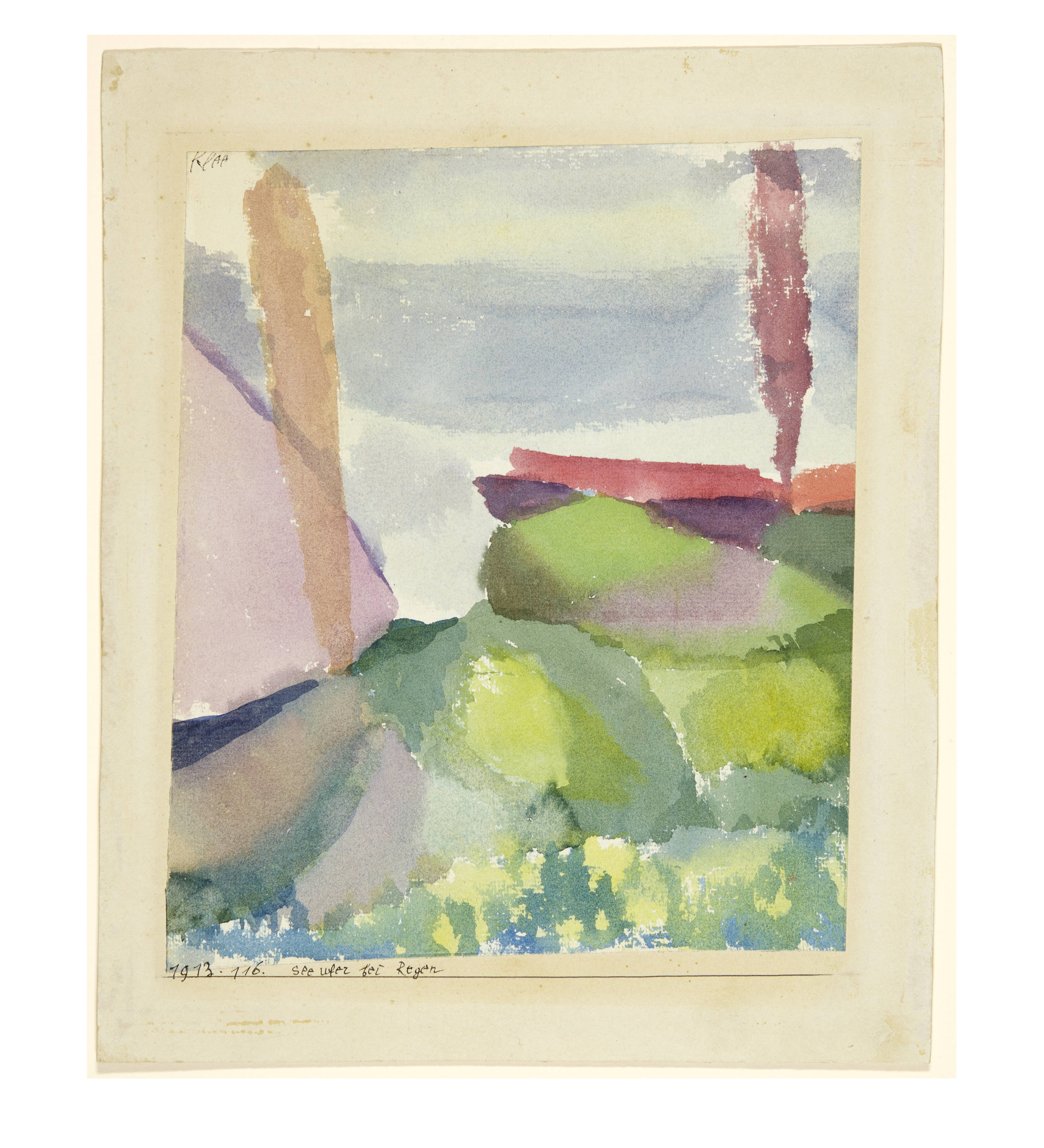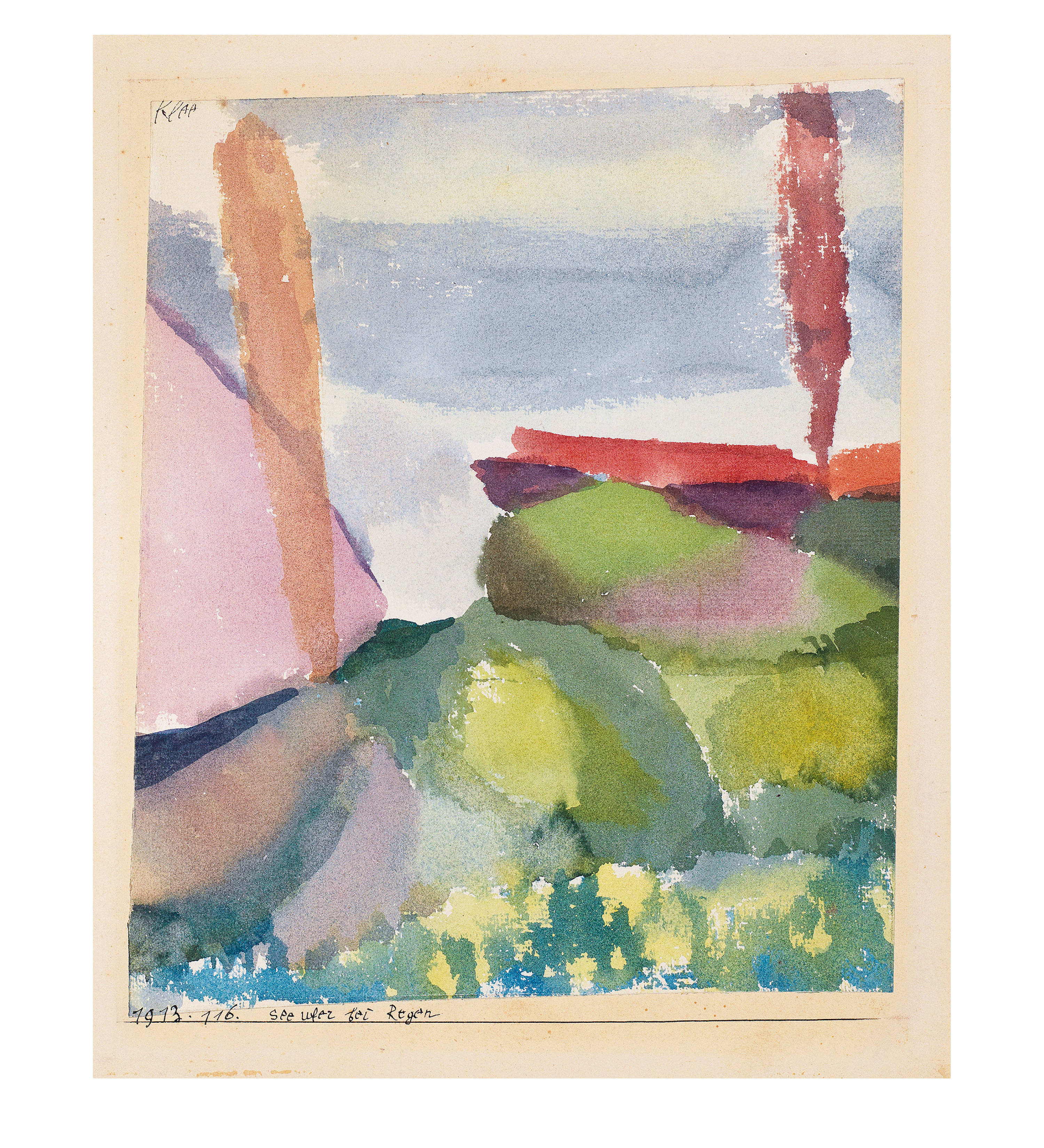 Paul Klee was often a guest on Lake Thun, for example in Beatenberg, where his mother's relatives, the Frick siblings, ran the "Waldrand" hotel. When Louis Moilliet moved to Gunten on Lake Thun with his wife, the pianist Hélène Gobat, in 1910, his childhood friend Klee and his family were often guests in the house during the summer. Klee also met August Macke at Moilliet's house. It was there, overlooking Lake Thun, that the idea of a trip to North Africa germinated. This was to go down in art history as the "Tunisreise" (Trip to Tunis). Paul, Lily and Felix Klee also spent the summer holidays of 1913 on Lake Thun. The route from Munich to Gunten can be reconstructed with the works: Cat. rais. 985 "Remembrance of Romanshorn", Cat. rais. 997 "Emmenthaler Landschaft", Cat. rais. 998 "Bei Bern (Wittigkofen)". Especially beautiful also the sheets Cat. rais. 1016 "Der Berg hinter Tannen", a typical view from Gunten through treetops to the Niesen on the opposite side of the lake, or Cat. rais. 1017 "Auf der Laube" with a view over Lake Thun. The watercolour offered here impressively shows that a summer rainy atmosphere by the lake also has its incredible charm and magic. In its two-dimensional, slightly abstract composition, it already anticipates the works after the Tunis journey. An exceptionally beautiful watercolour that bears witness to the carefree life of the "holidays"