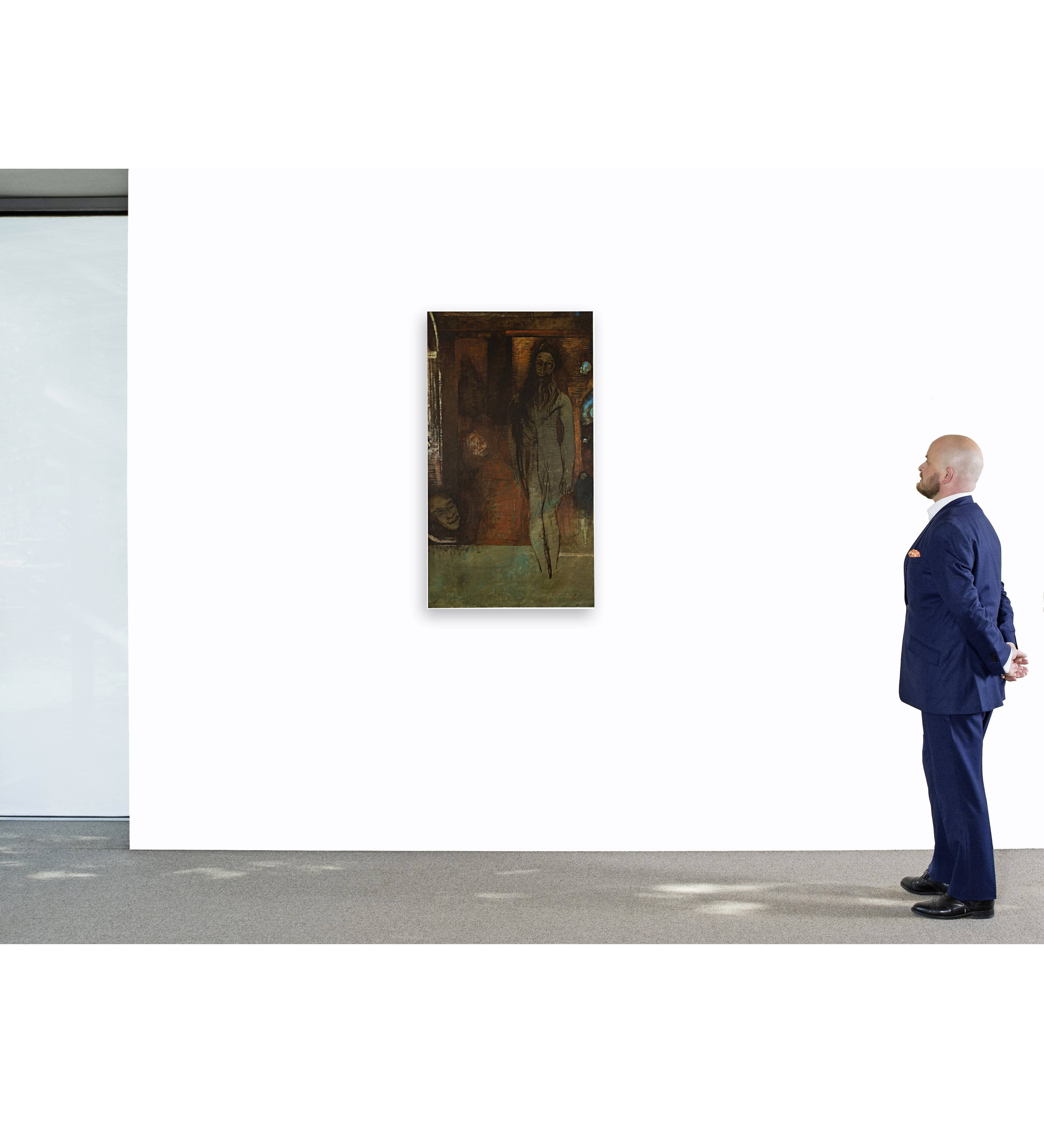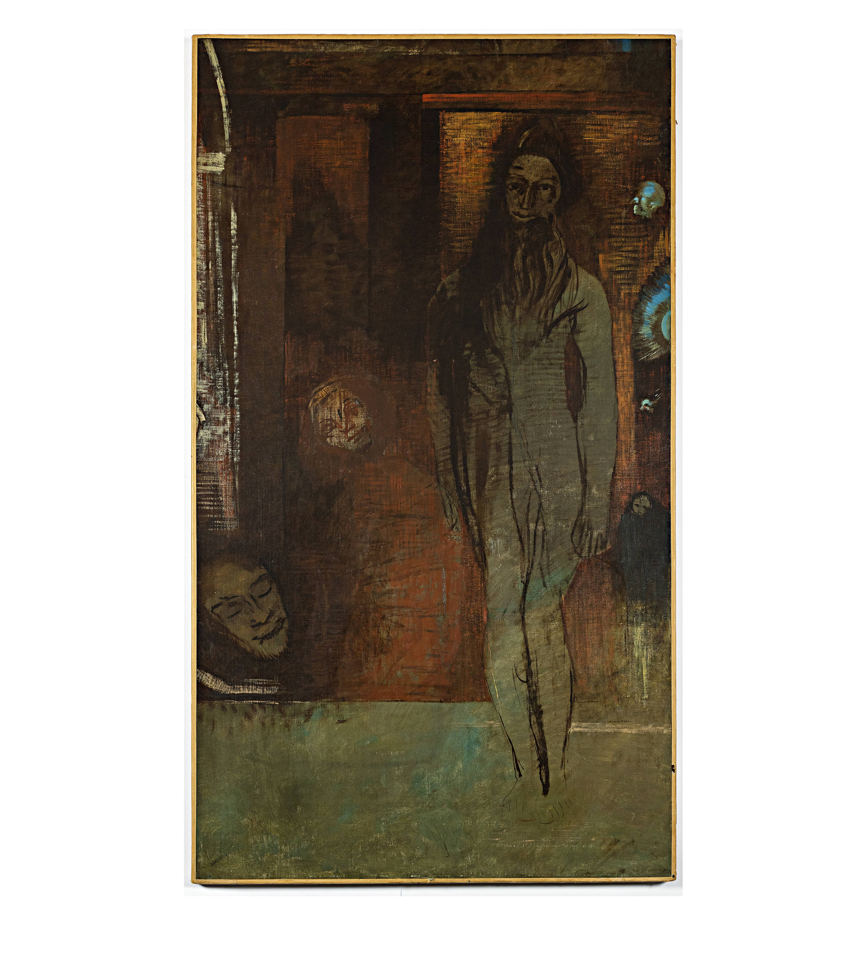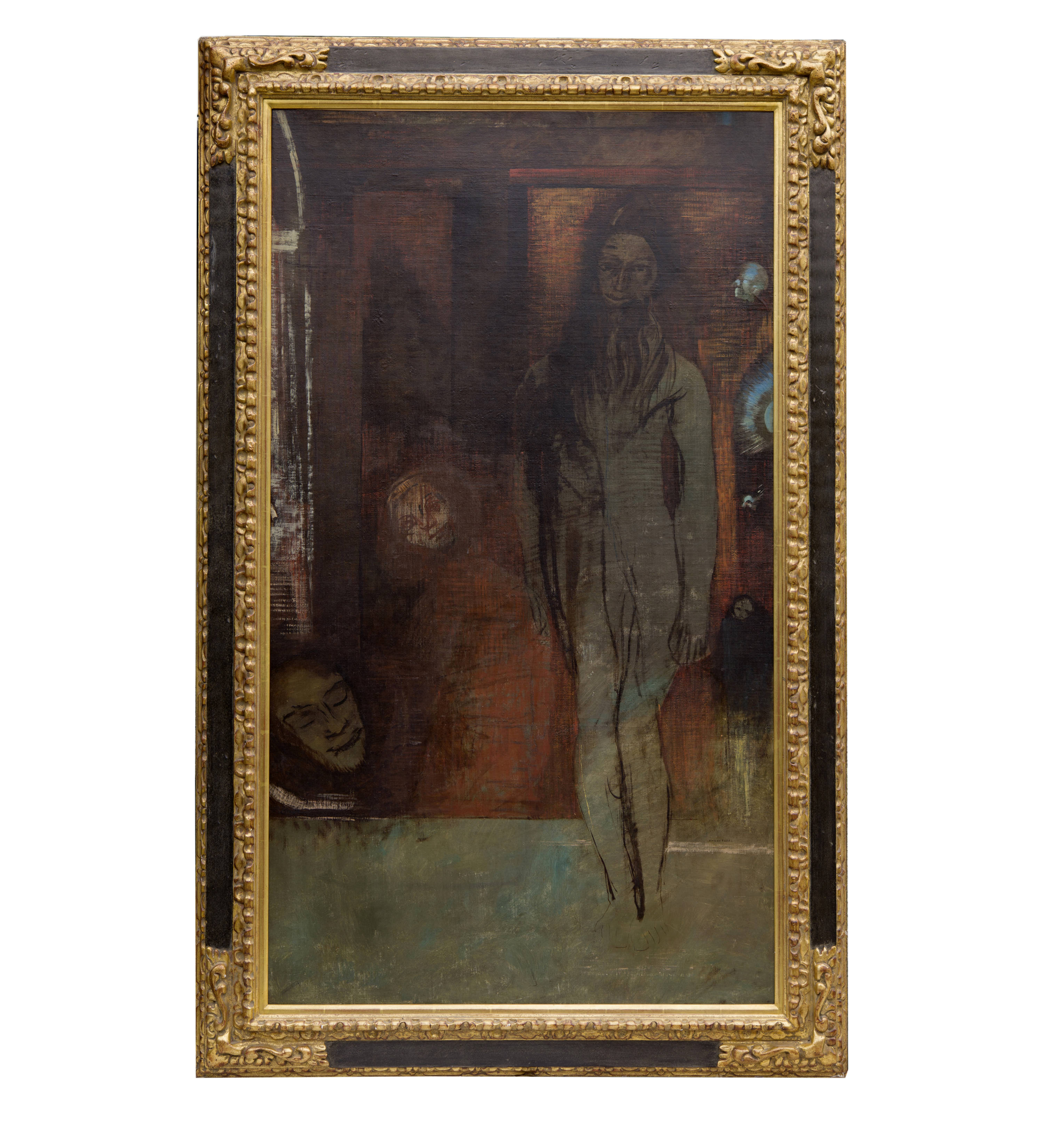 "L'Apparition", the apparition, is a reminiscence of the so-called "black period" of the symbolist Odilon Redon, in which he devoted himself to the human unconscious with its fears and nightmares, creating haunting, sometimes eerie works. Alec Wildenstein describes the painting as follows: "A thin man - shivering with cold or fear? - shivering with cold or fear, flying or frantic little heads without bodies appear in an eerie room painted in the colours of clay and hell, death and decay."