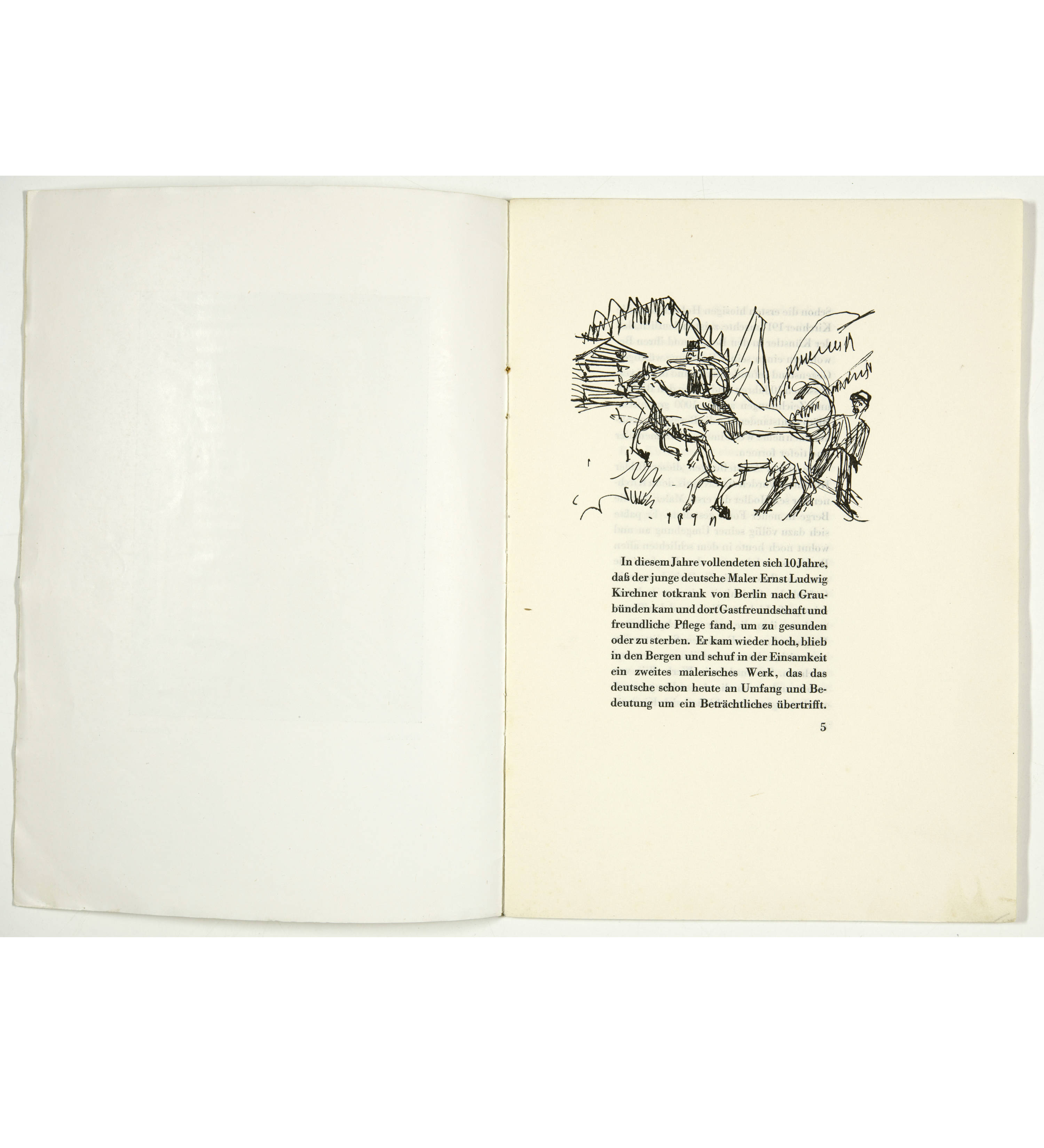 Auf dem Umschlag mit dem farbigen Holzschnitt "Selbstbildnis mit Erna mit Tinzenhorn", 1927 (Gercken A-321). Enthält nebst der Liste der ausgestellten Aquarelle, Zeichnungen und Graphikblätter einen Text von E. L. Kirchner unter dem Pseudonym "L. de Marsalle" mit einem Rückblick auf 10 Jahre Schaffen in Davos