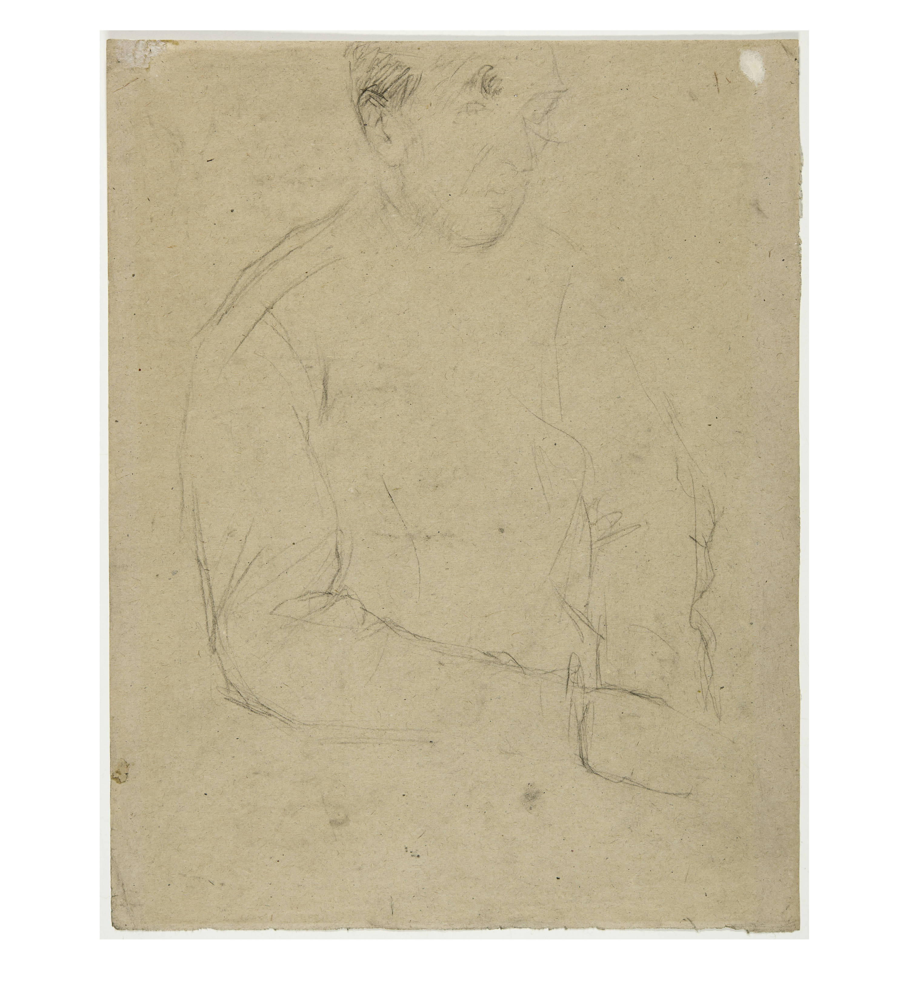 Auf grauem, dünnem Velin. Rückseitig mit weiterer Skizze des Bauern. Mit Lichtrand, im Papier stark gebräunt und vier kleinen Löchlein. An den Blatträndern mit Spuren einer alten Montierung und oben in der rechten Ecke mit kleiner, hinterlegter Fehlstelle
