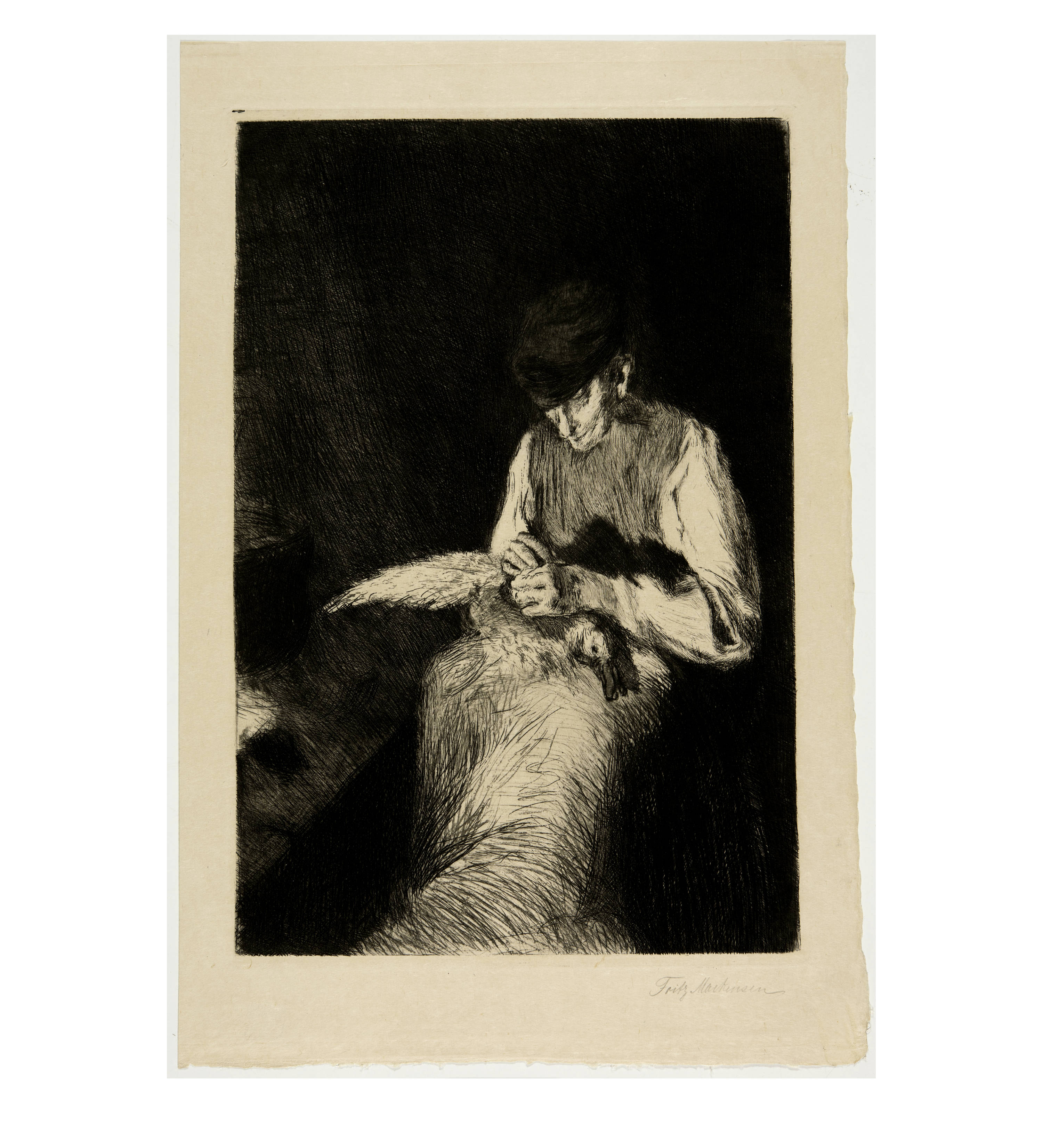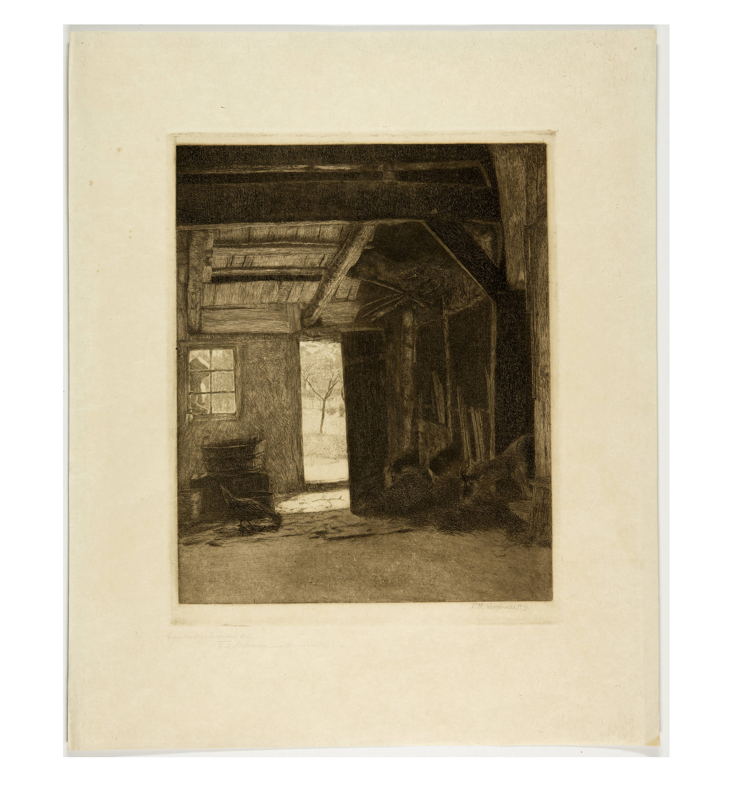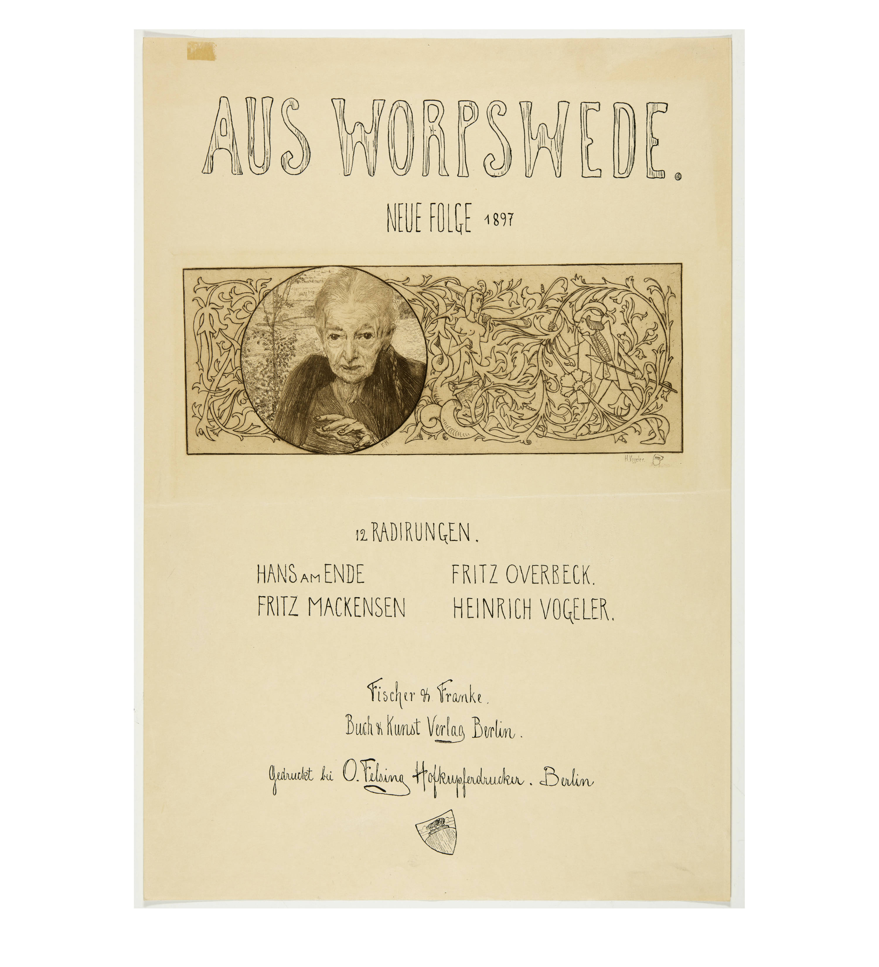 Included: Fritz Mackensen, "Gänserupfer" 1895, etching; "Im Stall, Worpswede" 1896, etching. - Fritz Overbeck, "Das Dorf Worpswede" 1898, etching. - Heinrich Vogeler, title page to portfolio "Aus Worpswede. Neue Folge" 1897, etching. Various sizes. - Together: 5 sheets