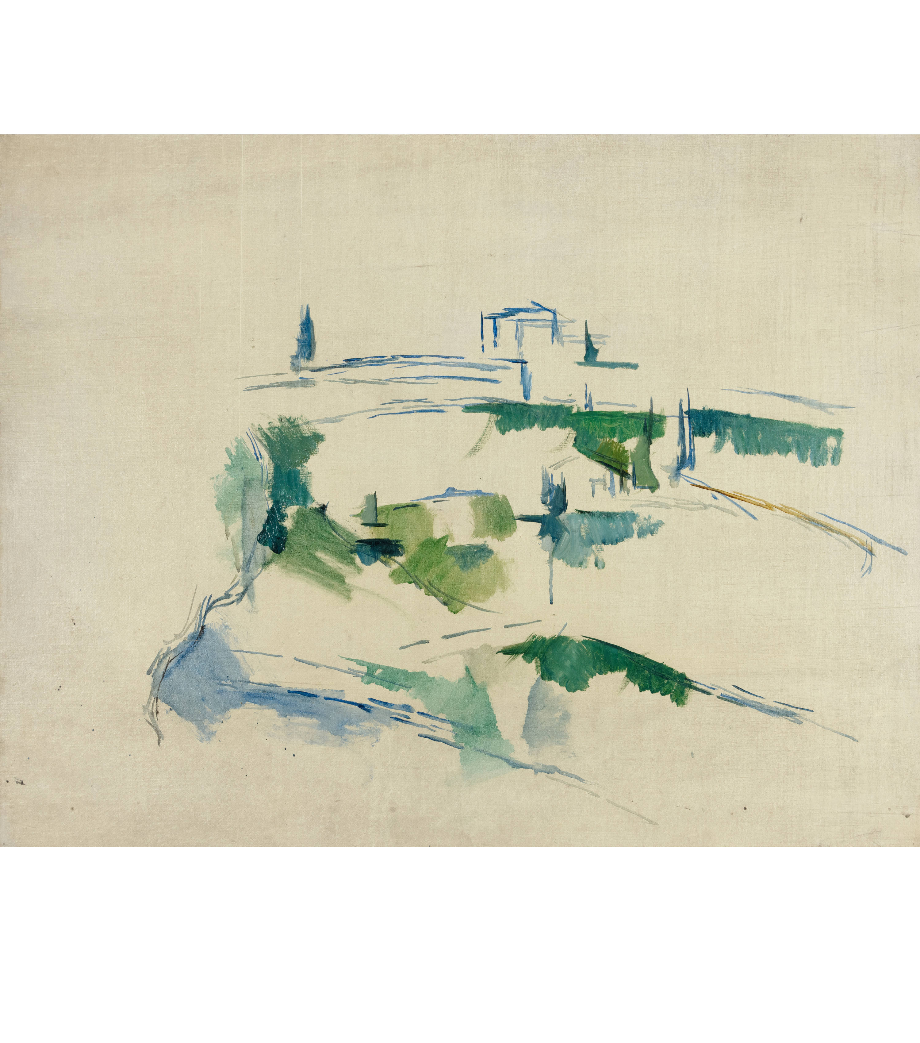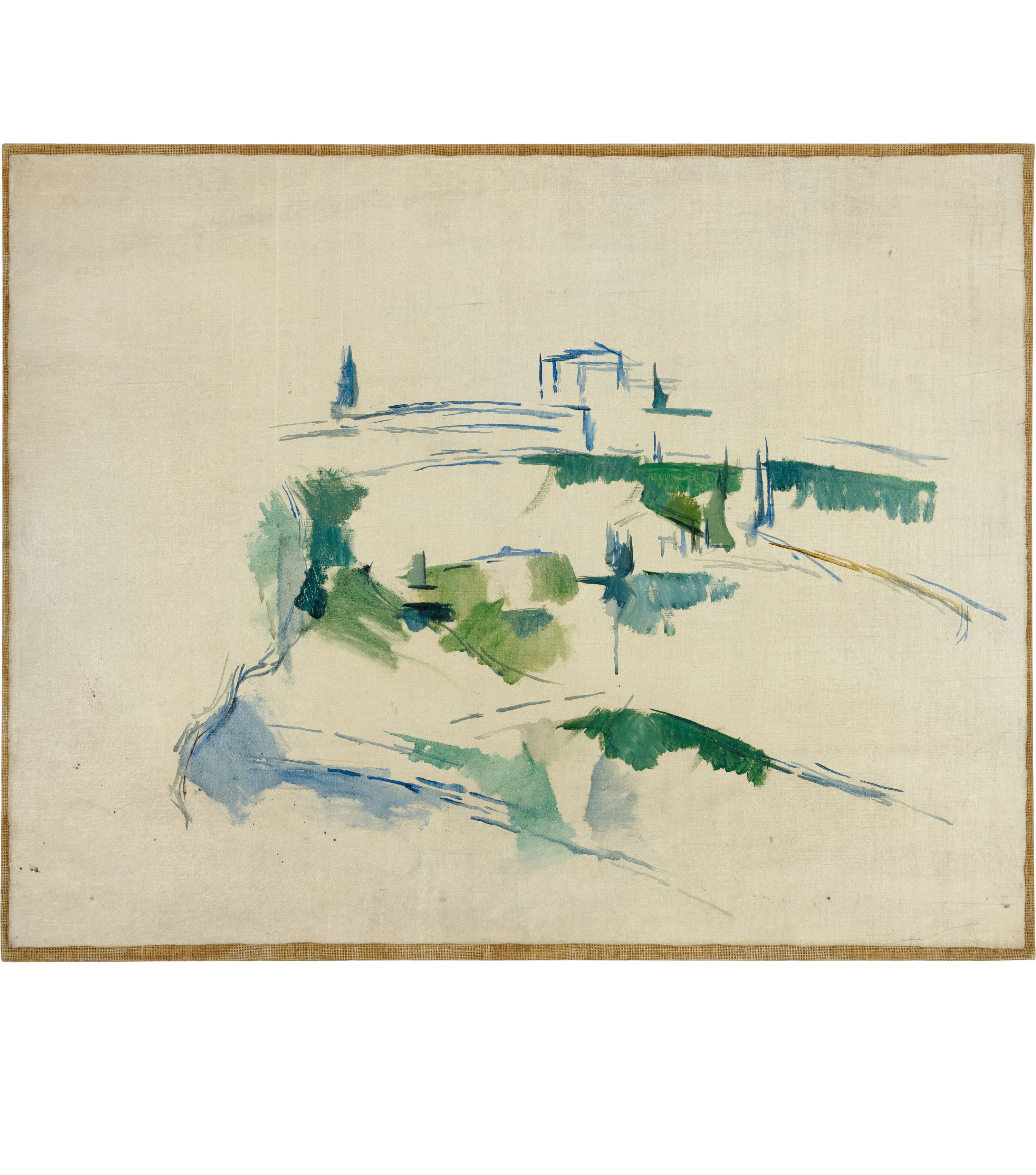 In this late work, Paul Cezanne shows the viewer how skilfully and courageously he knew how to handle brush and paint when designing and executing his compositions. Finely painted in shades of blue, green and yellow, this symphony of colours visualises his vision of "pure painting". He had discovered in the diversity of nature a subtle pattern of rhythm and proportions, an architectural structure that was contained in the random arrangements of forms like a crystalline pattern. One could almost see the old distinction between "natura" and "cultura", i.e. the original and the man-made, exemplified in the painting. "Paysage" probably depicts a section of the landscape at the foot of Mont Sainte-Victoire between Aix and Tholonet. Cezanne had known this part of Provence well since his youth, as he had often travelled through this region of southern France with his childhood friend Émile Zola.