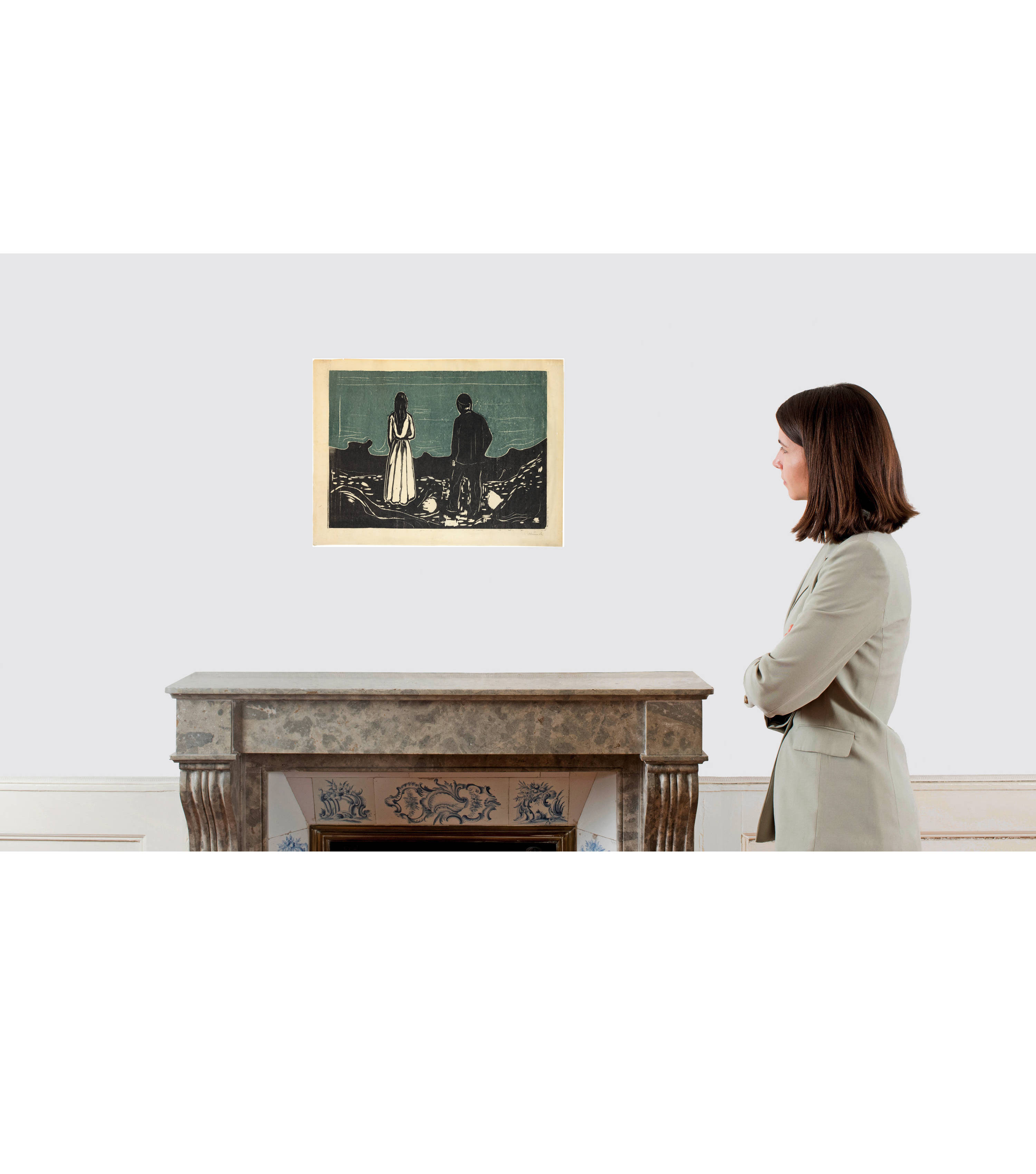 The large-format woodcut offered here is an early print dating from 1899. It was first printed in a small edition by Lassally in Berlin. Only one copy is listed in Schiefler's catalogue raisonné from 1906. Prints from 1899 or shortly thereafter are very rare. In the autumn of 1914, Munch had the blocks sent to Oslo, where further prints were made, mostly on thin Japanese paper. In 1917, the artist returned to the woodcut and printed a few copies in different colours, probably with the help of the printer Nielsen.