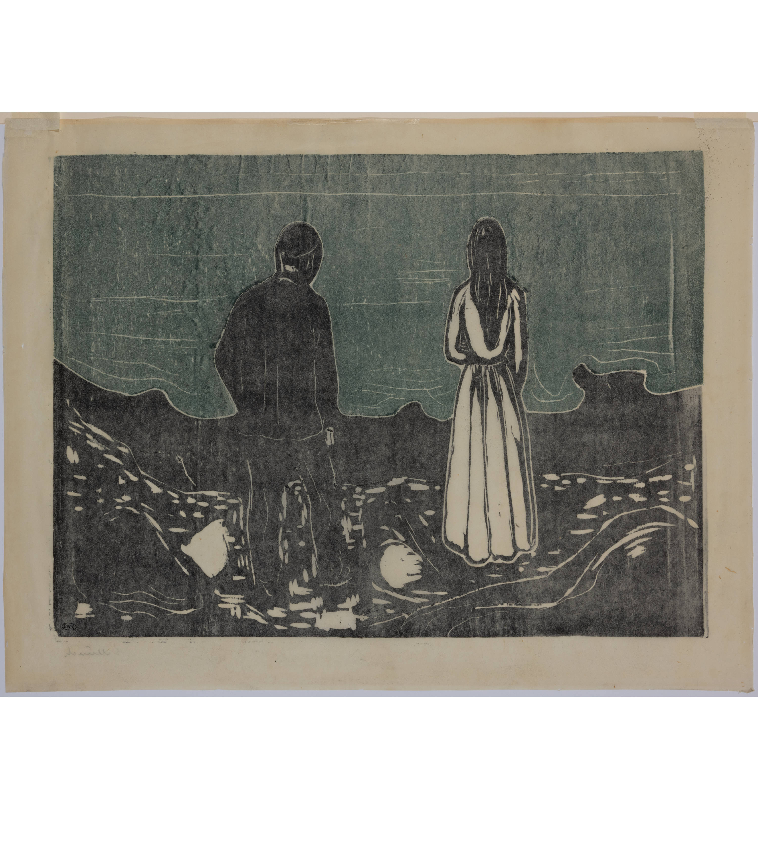 The subject of "Die Einsamen" (a couple on the beach seen from behind) first preoccupied Munch in 1891. The oil painting he created at that time is now lost, but is documented by photographs from 1892 and 1893. A drypoint closely based on the oil painting was made in 1894 and published the following year as an edition in the Meier-Graefe portfolio.