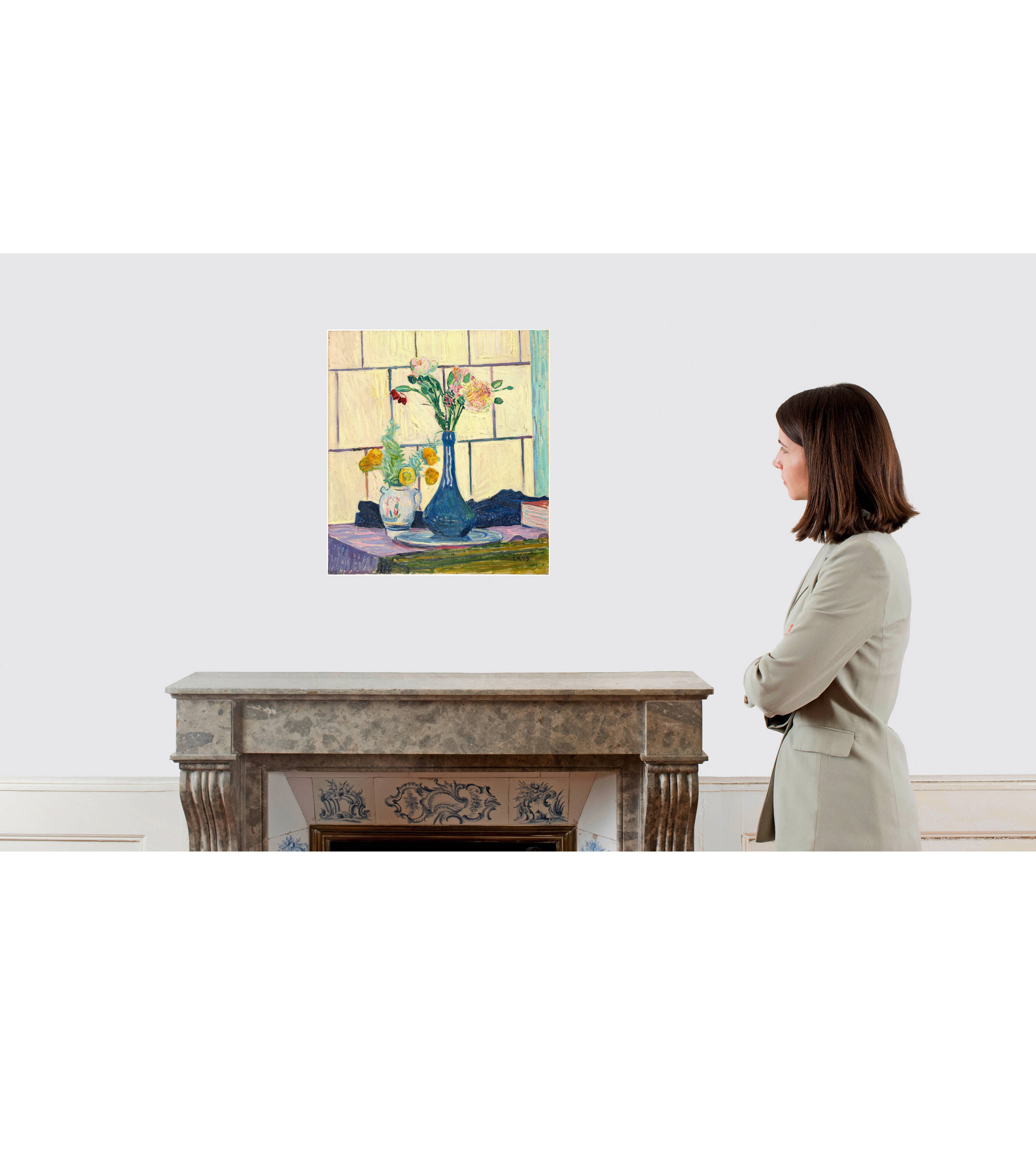 The two bouquets of flowers are placed on a small table in front of the white tiled stove in Cuno and Anna Amiet's flat in the inn on the Oschwand. The painting was probably created shortly before they moved into the house with studio and garden built by the young architect Otto Ingold in the summer of 1909.