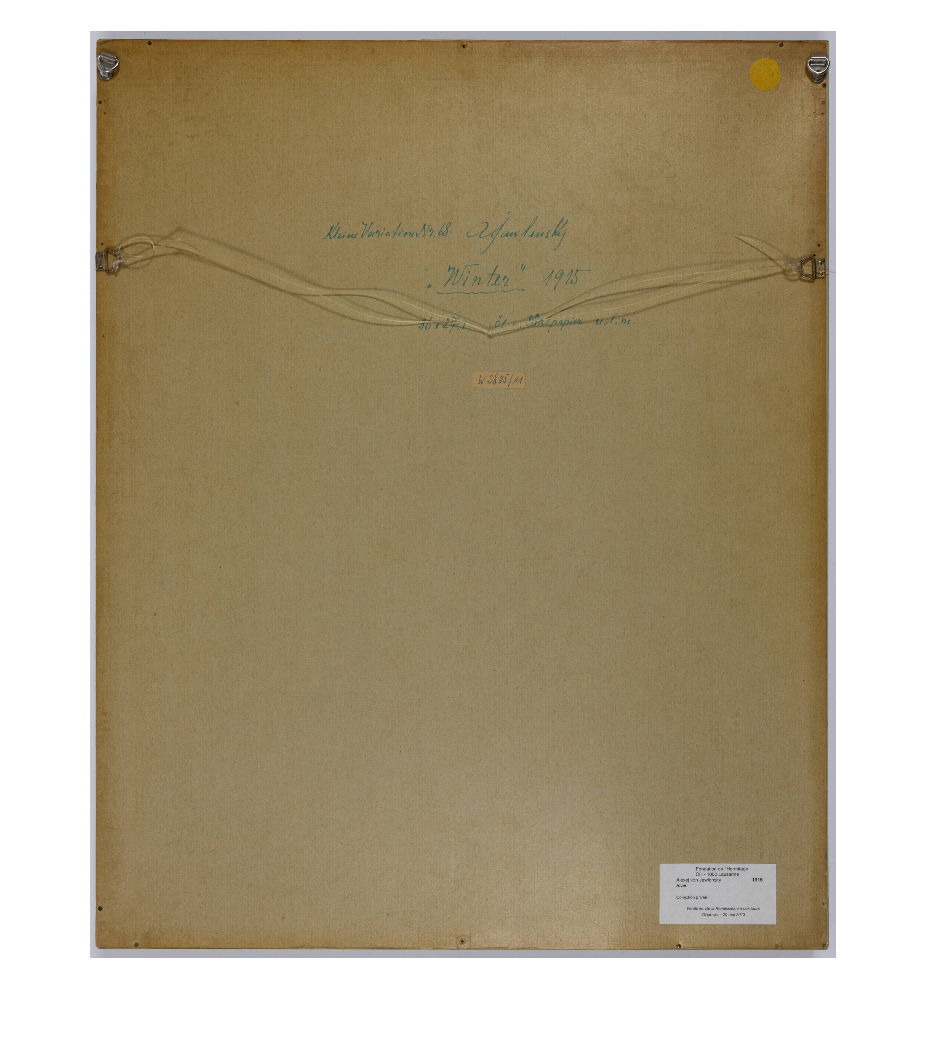 Monogrammed "A.I." lower left. Inscribed on the reverse "Kleine Variation Nr. 68 A Jawlensky / Winter" 1915 / 36x27.1 Oil on painting paper ul.m."