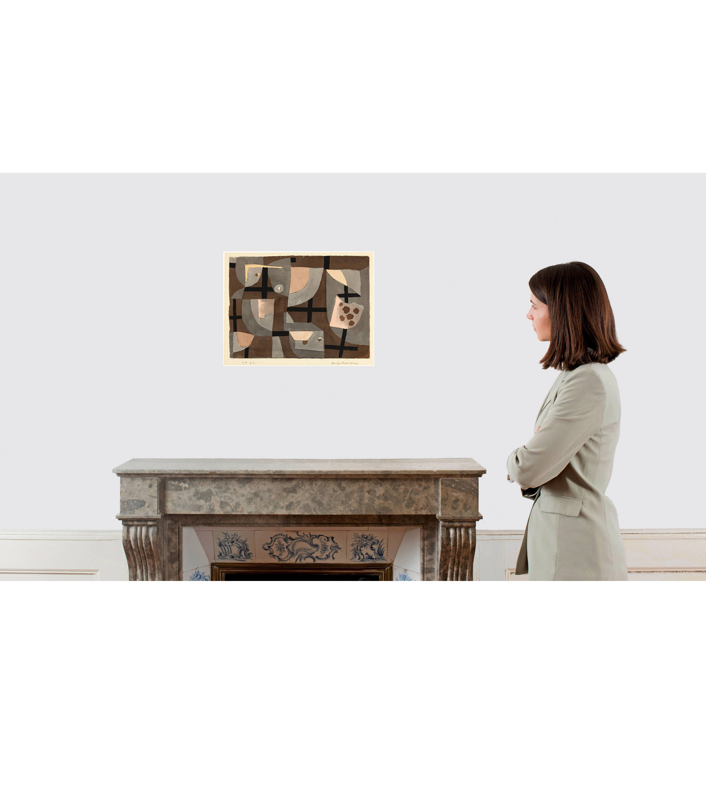 Are the "Schwarzen Fenster-Kreuze" perhaps a combination of these themes or even a premonition? Shortly before the watercolour offered here, he created "Demarkation" (Catalogue Raisonné 7297). In this inconspicuous drawing Klee may be alluding to the "Anschluss" of Austria to the German Reich. The "Fensterkreuze", on the other hand, are reminiscent of (military) cemeteries, here still partially covered by curtains, or of barred, cage-like windows through which one cannot escape. The watercolour, painted in subtle shades of brown, could thus become one of those works in which Klee interweaves his personal fate with the fate of the world, demonstratingonce again his incomparable sensory abilities and the bold pictorial power of his art.